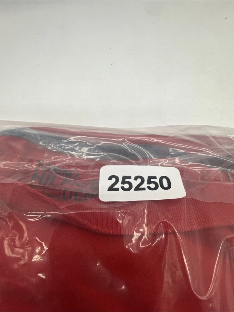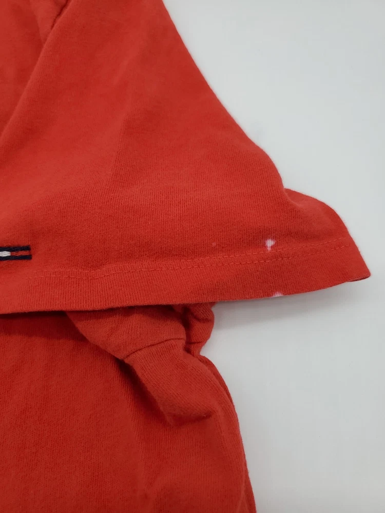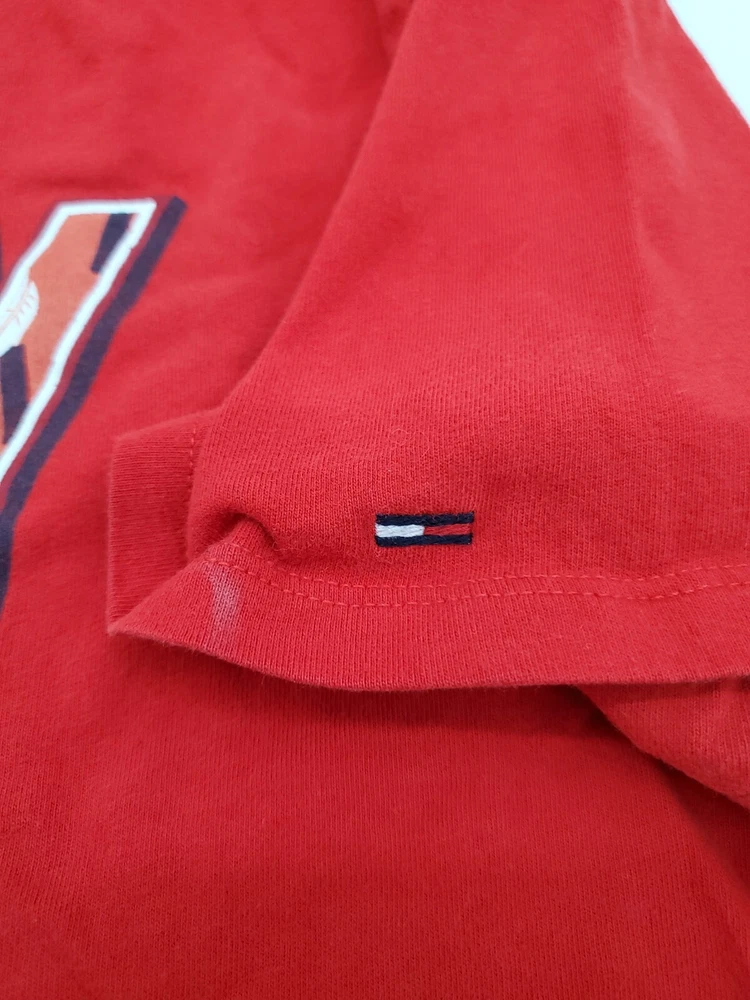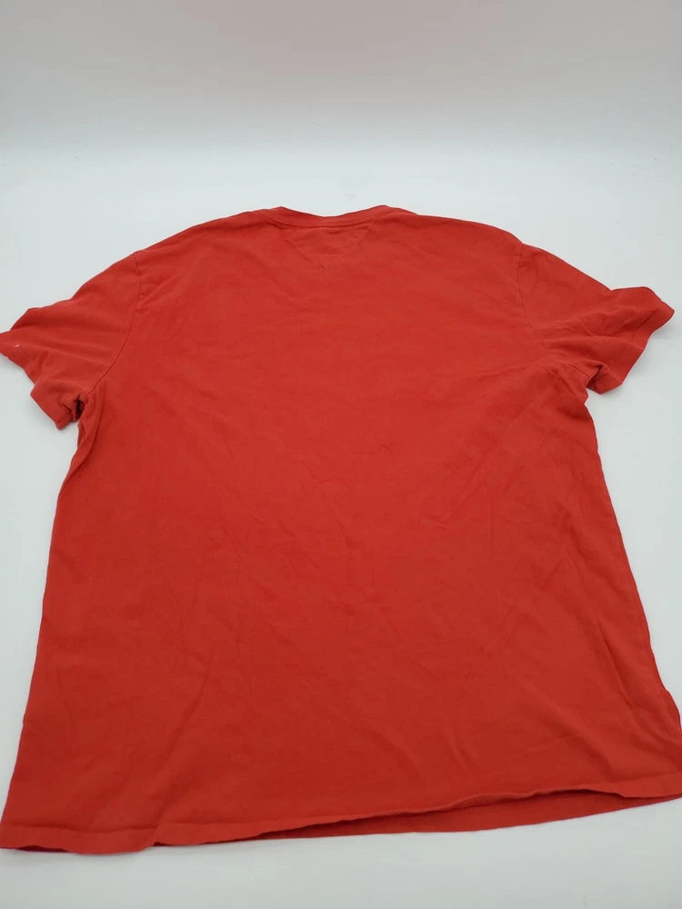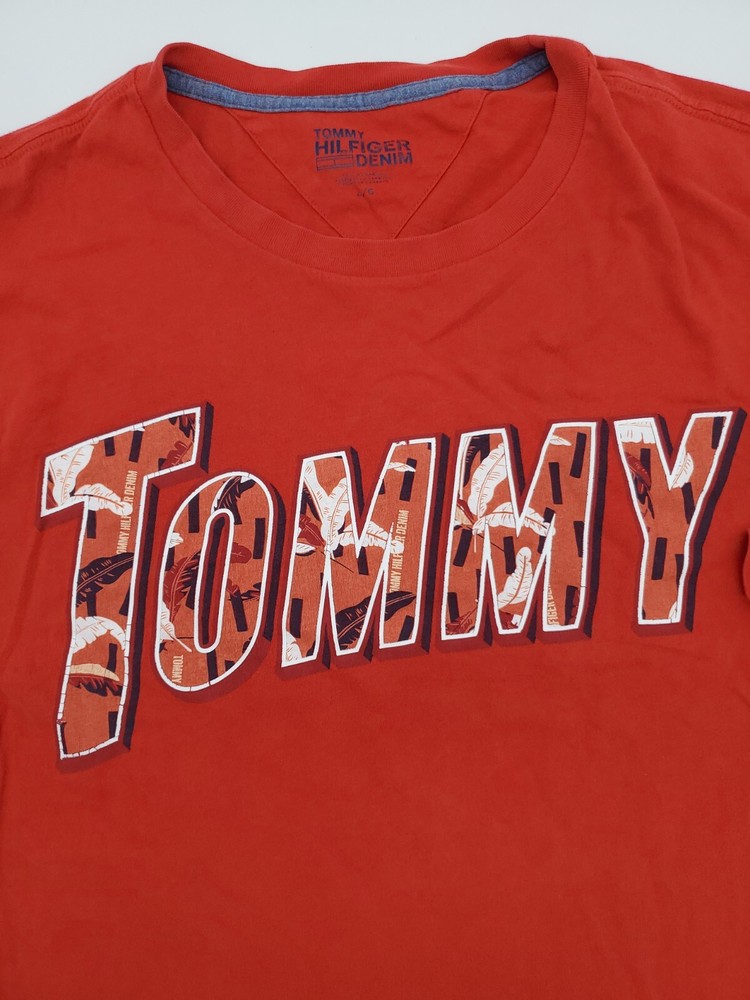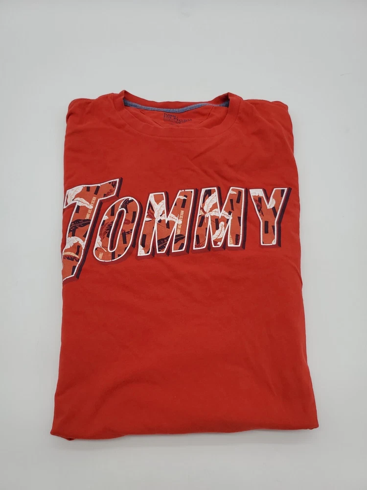 The Tommy Hilfiger Denim T-Shirt for men in size Large features a classic crew neck with a pullover closure, making it perfect for casual occasions. Made from 100% cotton, this red shirt with a graphic print logo is easy to care for and comfortable to wear. The Tommy Hilfiger brand and iconic logo accents add a touch of classic style to this wardrobe staple, perfect for everyday wear and walking activities. *Check the images above for the flaws and measurements of the item.