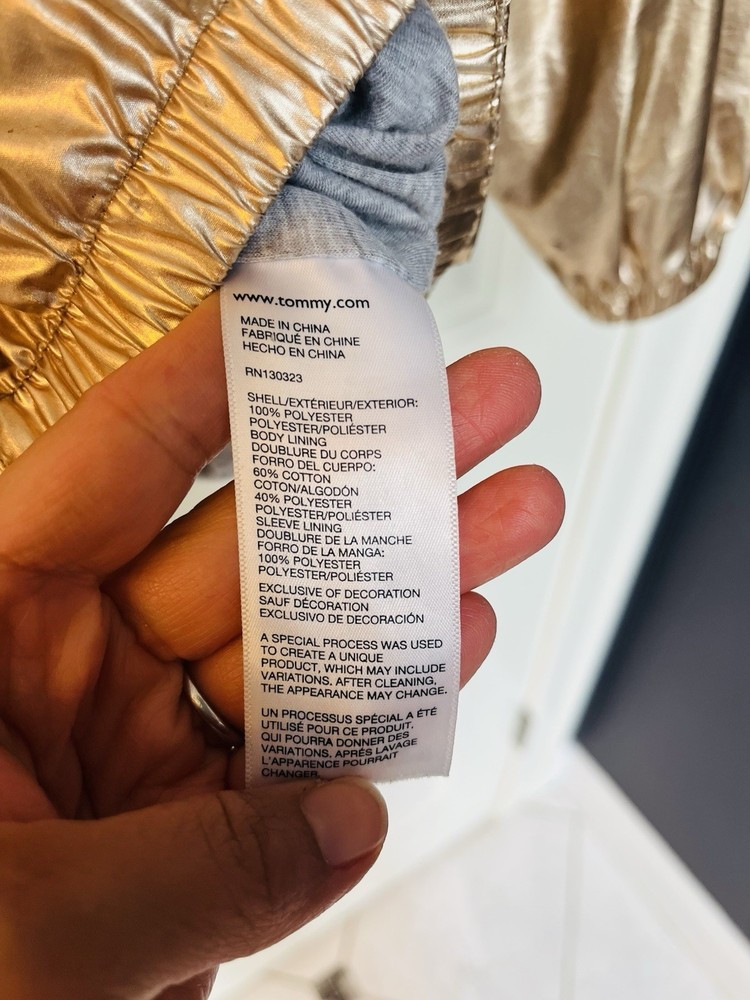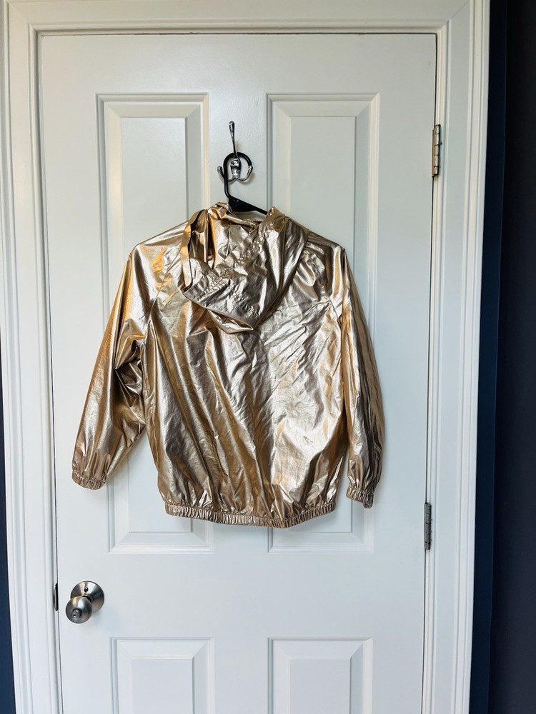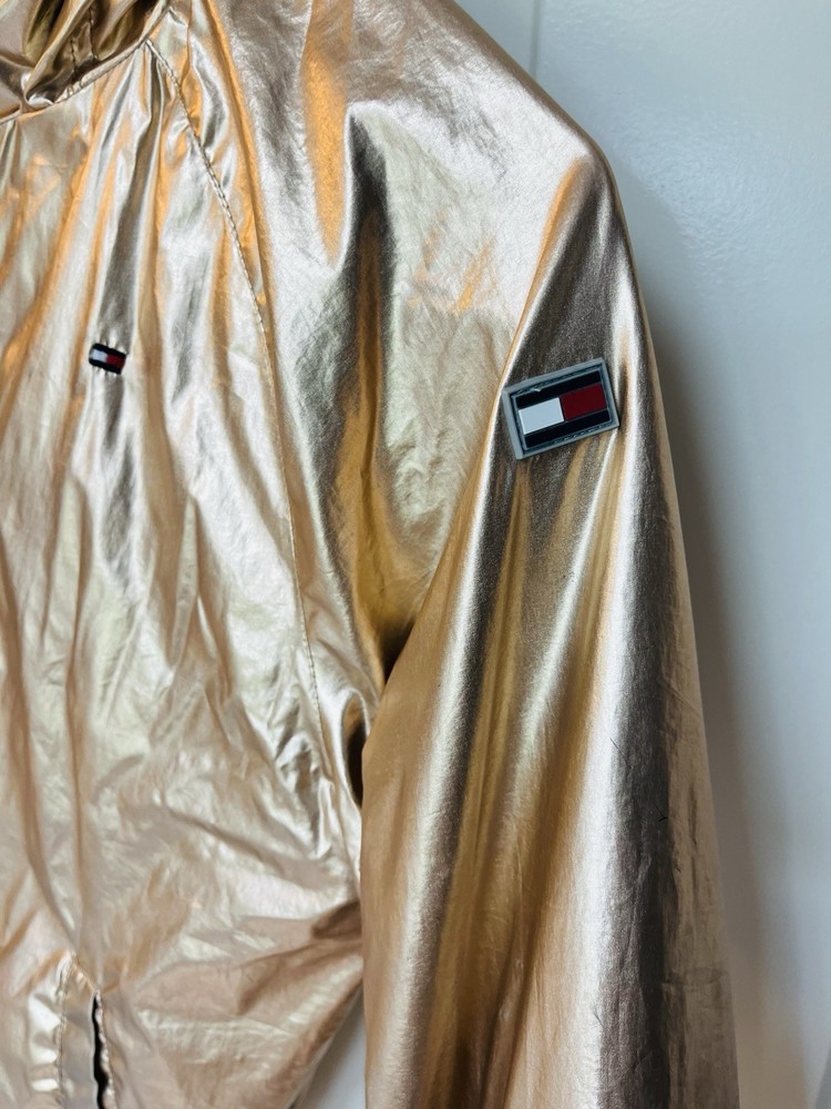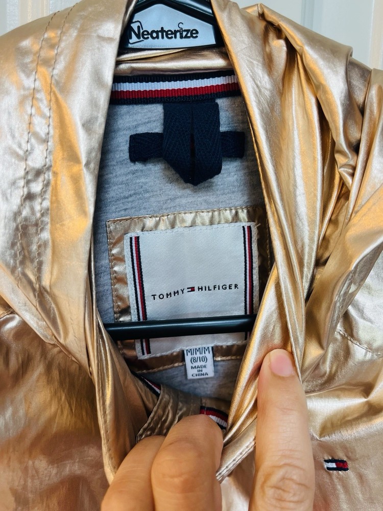 Your little fashionista can shine even in the rain! This gold Tommy Hilfiger hooded rain jacket is perfect for those rainy/windy days in the warmer months. Girls size M (8-10). Excellent condition.