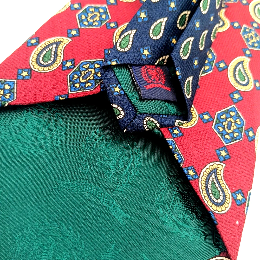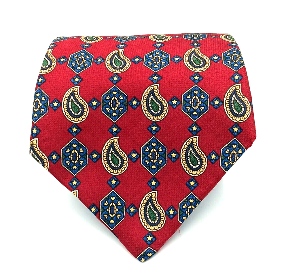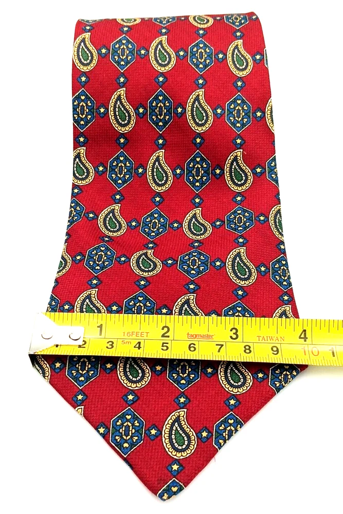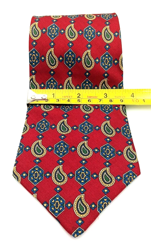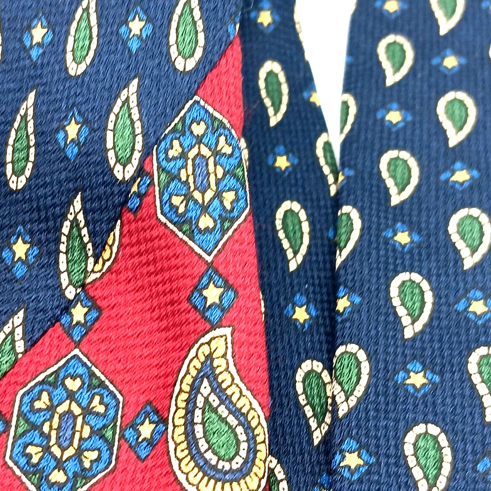 Brand = Tommy Hilfiger Color = Multicolor - Red to Blue with motifs in green, yellow, white. Fabric = 100% imported Italian Silk Pattern = Foulard - Geometric Made in United States (USA) Material = Woven Silk Length inches = 60 Width inches = 4 Notes = Unique color patterns - changes from Red to Blue along with variety of geometric shapes. Medallions paisley floral stars - a variety of patterns. Please see photographs for condition, approximate measurements, patterns and design. Kind regards, Karen Anns Attic