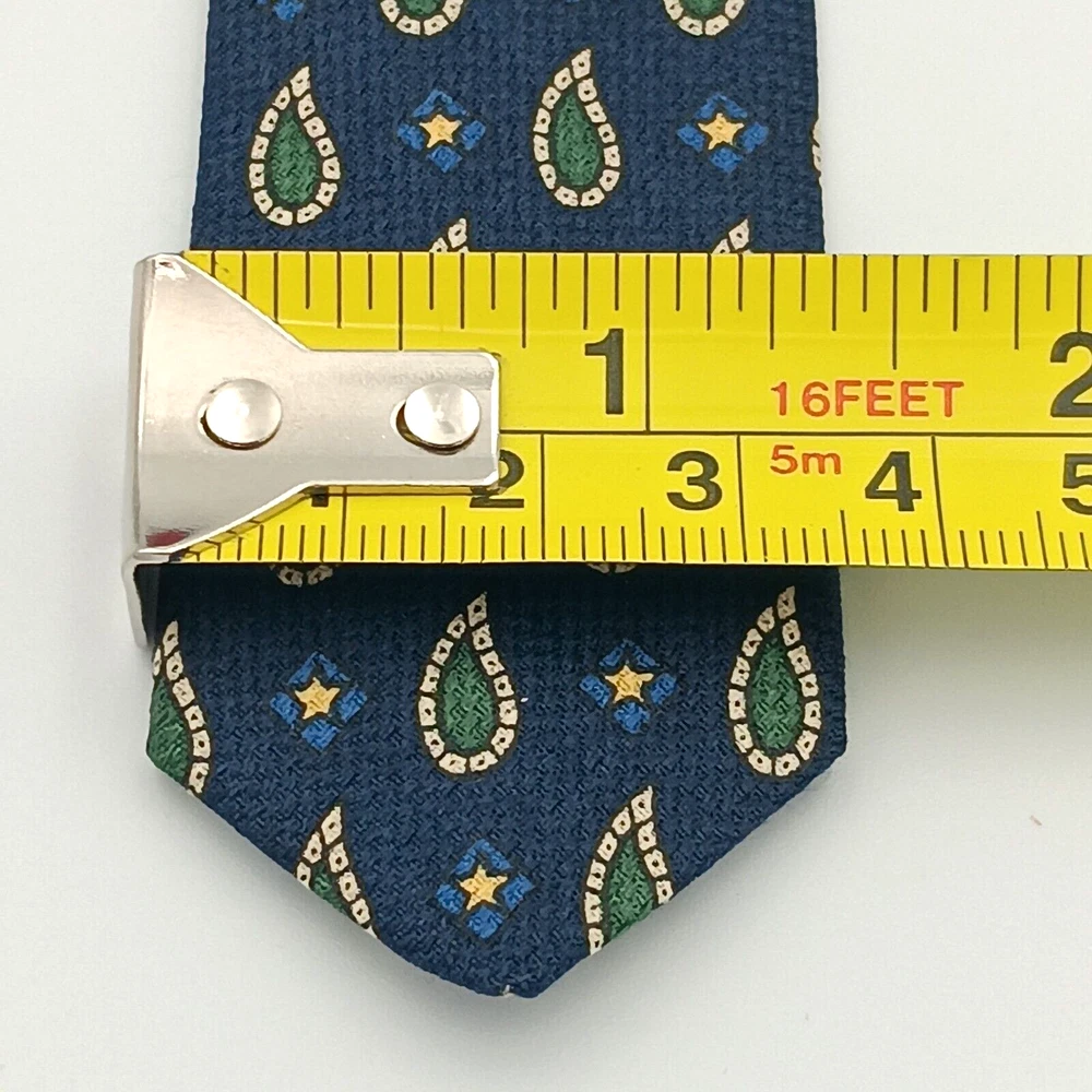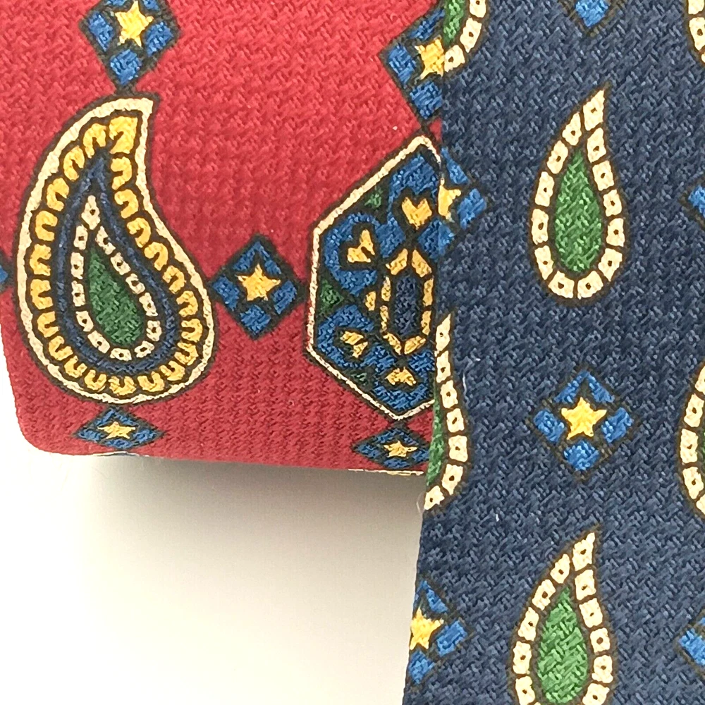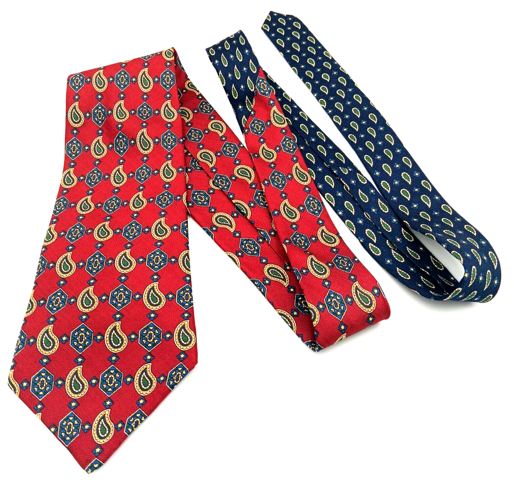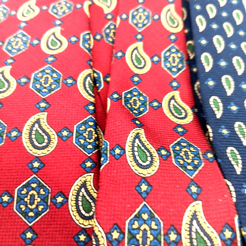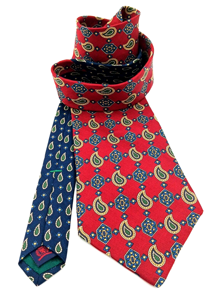 Brand = Tommy Hilfiger Color = Multicolor - Red to Blue with motifs in green, yellow, white. Fabric = 100% imported Italian Silk Pattern = Foulard - Geometric Made in United States (USA) Material = Woven Silk Length inches = 60 Width inches = 4 Notes = Unique color patterns - changes from Red to Blue along with variety of geometric shapes. Medallions paisley floral stars - a variety of patterns. Please see photographs for condition, approximate measurements, patterns and design. Kind regards, Karen Anns Attic