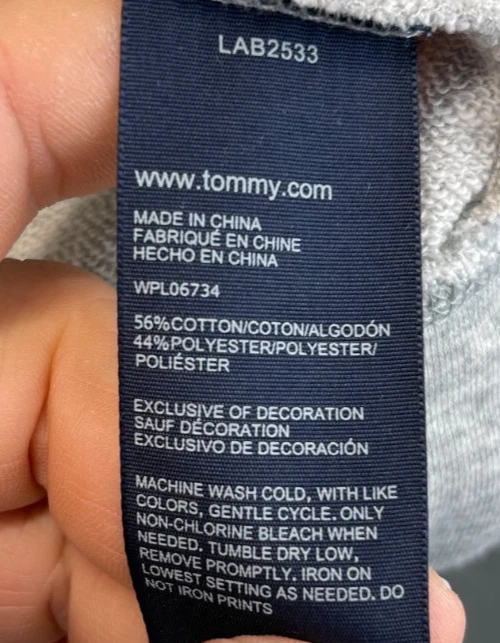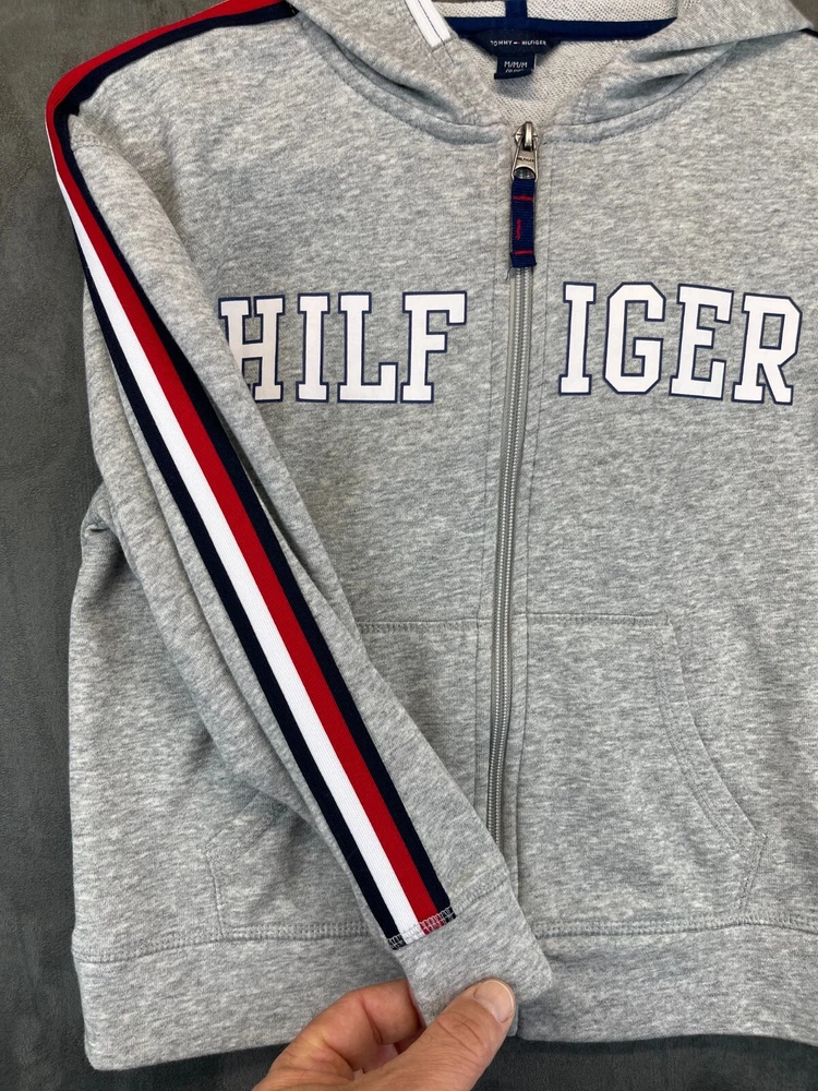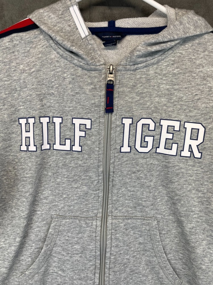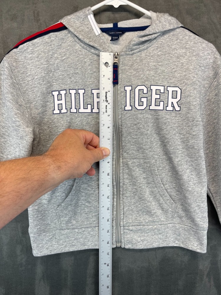 Product Line: Tommy Hilfiger Full Zip Hoodie Country/Region of Manufacture: China Style: Full Zip Sleeve Length: Long Sleeve Chest Size: See photos for measurements Accents: Logo, Zipper Pattern: Solid Size: M Features: Easy Care, Full Zip, Hooded, Pockets Closure: Zip Occasion: Activewear, Casual, Party, Travel Season: Fall, Spring, Winter Fabric Type: Fleece Personalize: No Fit: Regular Department: Boys Material: Cotton, Polyester Color: Gray Garment Care: Machine Washable Brand: Tommy Hilfiger Performance/Activity: Running & Jogging, School, Walking Theme: American, Logo, Sports Neckline: High Neck Type: Hoodie