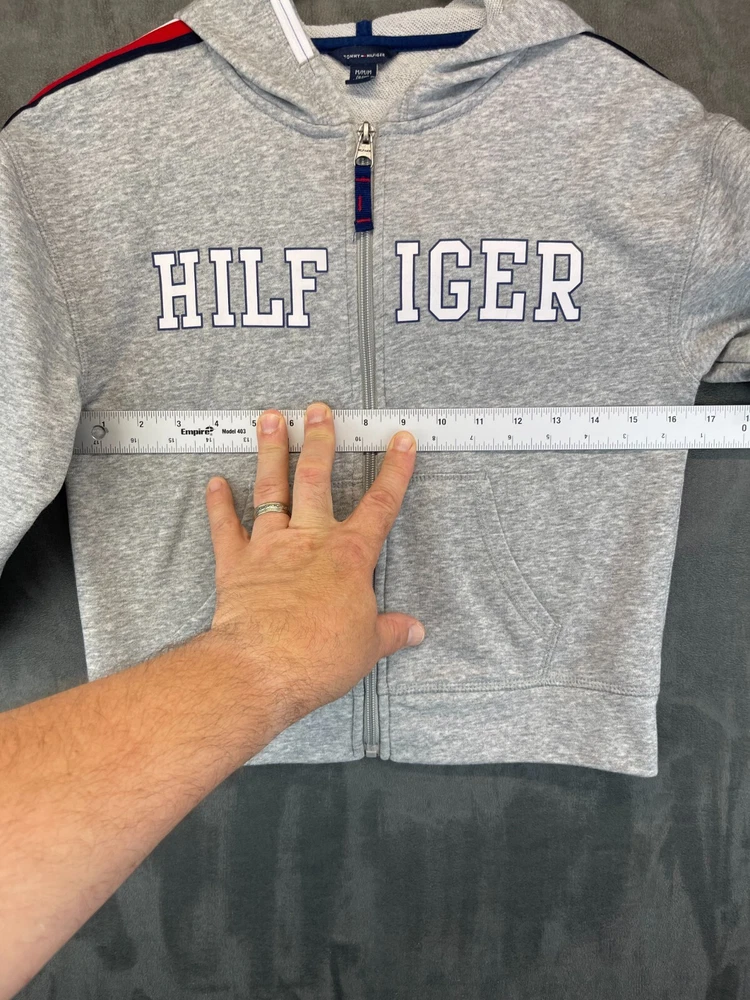 Wrap your youngster up in style with the Tommy Hilfiger Children's Full Zip Hoodie. This sleek gray hoodie, accented with the iconic Tommy Hilfiger logo, offers a versatile addition to any youth's wardrobe. Designed for a regular fit, it features a comfortable high neck and convenient full zip closure, perfect for layering during cooler seasons. Crafted from a soft blend of cotton and polyester, this hoodie ensures easy care and lasting comfort. It's well-suited for a range of activities, from school to sports. The long sleeves, combined with practical pockets and a hood, make it an ideal choice for walking, running, or casual outings. Complete with solid stripes, it's a classic piece that effortlessly blends American sports themes with everyday wear. Very good preowned condition with normal preowned wear. Please see all photos; specifically for measurements. ******************************************************************************************************************************************************* FOR CLOTHING SPECIFICALLY, BE SURE TO REVIEW PHOTOS FOR ACTUAL MEASUREMENTS OF THE WAIST, RISE, INSEAM, LEG OPENING, SHIRT WIDTH AND LENGTH, ETC... WASHED CLOTHING TENDS TO SHRINK SLIGHTLY AND THEREFORE MAY DIFFER SLIGHTLY FROM WHAT THE TAG/SIZE SAYS THAT IT IS. ******************************************************************************************************************************************************* The size in the title is the size on the tag of the garment. See photos for measurements of actual measurements as they may differ. ALWAYS CHECK THE MEASUREMENTS IN THE PHOTOS. This will remove any questions on measurements as well as always cover the possibility of human error in the listing(s) in the case of a typo or oversight. All clothing and shoes have been washed/cleaned, and are cleaned and stored in a smoke free environment. However, please keep in mind that these are preowned items and there is always a possibility of there being preowned dirt, dust, or stray hairs present. I do my best to clean these items with hair collecting products in the dryer after being washed, and by hand with shoes. If shoe trees appear in the photos, they are for photography purposes only to illustrate how the shoes look filled out, and are not included. I accept or negotiate reasonable offers. If you like what you see here, please visit my eBay store for many, many ore items similar to this one. I hope to see you there. Have an amazing day. Thank you. FOR CLOTHING SPECIFICALLY, BE SURE TO REVIEW PHOTOS FOR ACTUAL MEASUREMENTS OF THE WAIST, RISE, INSEAM, LEG OPENING, SHIRT WIDTH AND LENGTH, ETC... WASHED CLOTHING TENDS TO SHRINK SLIGHTLY AND THEREFORE MAY DIFFER SLIGHTLY FROM WHAT THE TAG/SIZE SAYS THAT IT IS. *******************************************************************************************************************************************************