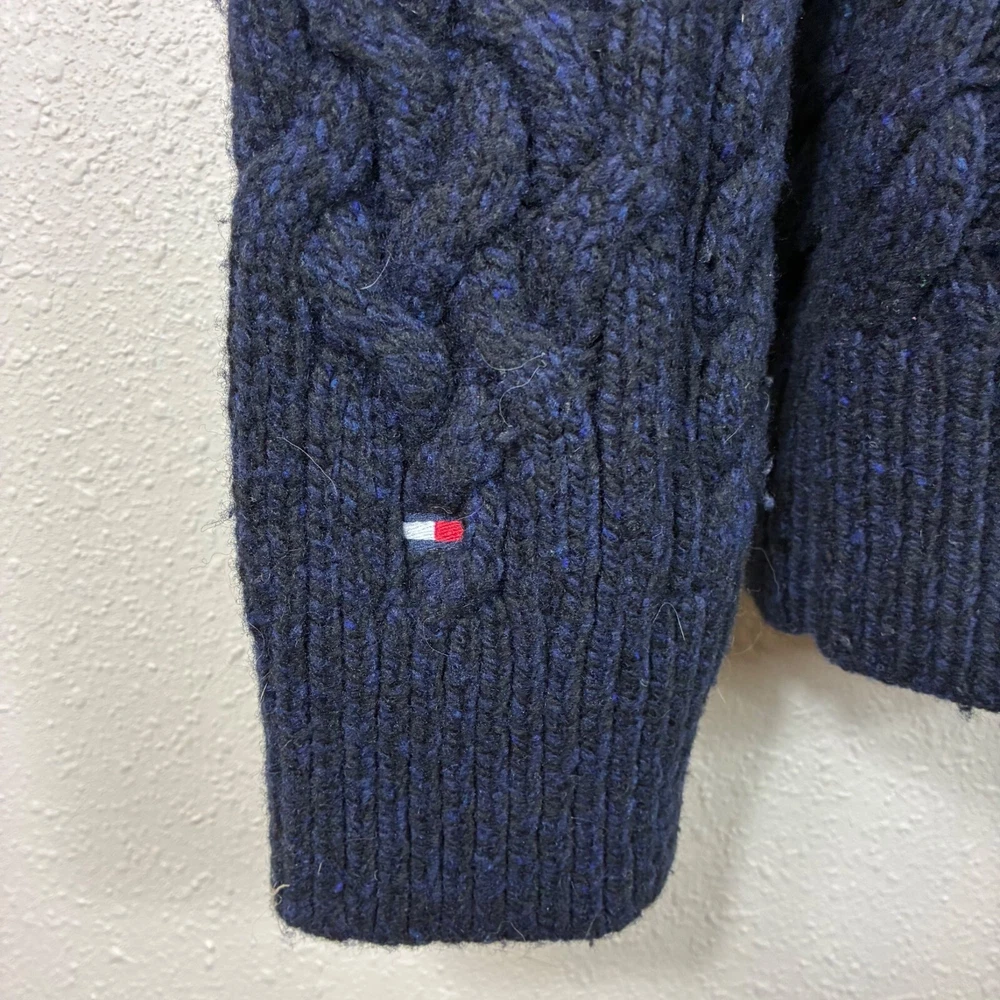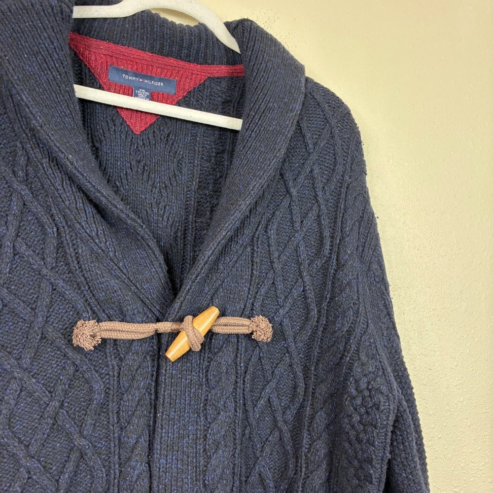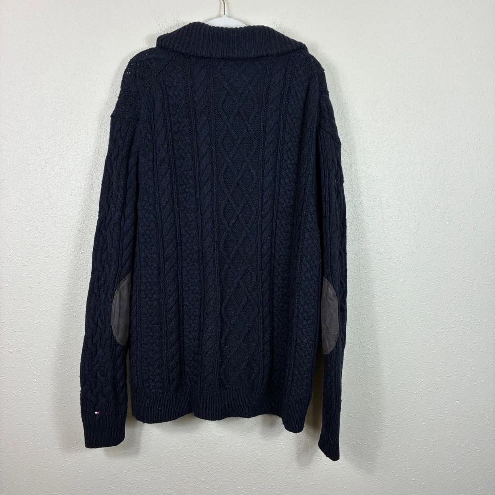 Tommy Hilfiger Lambswool Shawl Collar Grandpacore Cardigan Sz 2XL A little fuzzy and a little darkening on the elbow patches. N rips, tears, or holes. Great preowned condition! Cable knit Toggle buttons Shawl collar Logo patch on sleeve Elbow patches Dark navy blue Shoulder: 20" P2P: 24" Sleeve: 32" Length: 32" Measurements are lying flat, and estimates only. 1P45 2 lb 3 oz Tags: academia, retro, preppy