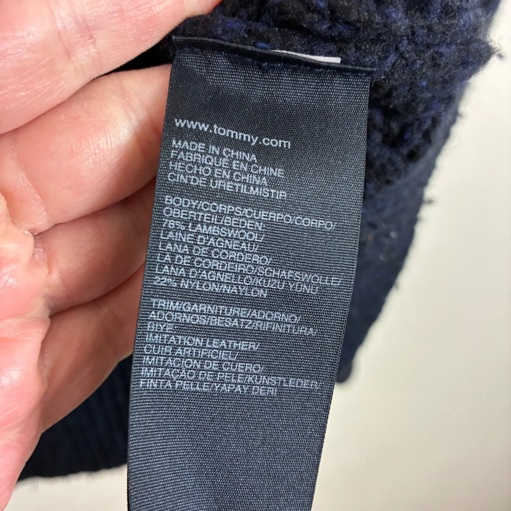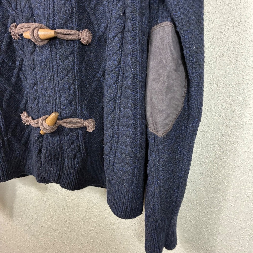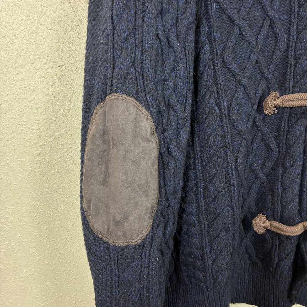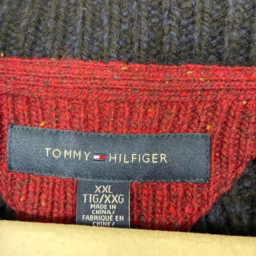 Tommy Hilfiger Lambswool Shawl Collar Grandpacore Cardigan Sz 2XL A little fuzzy and a little darkening on the elbow patches. N rips, tears, or holes. Great preowned condition! Cable knit Toggle buttons Shawl collar Logo patch on sleeve Elbow patches Dark navy blue Shoulder: 20" P2P: 24" Sleeve: 32" Length: 32" Measurements are lying flat, and estimates only. 1P45 2 lb 3 oz Tags: academia, retro, preppy