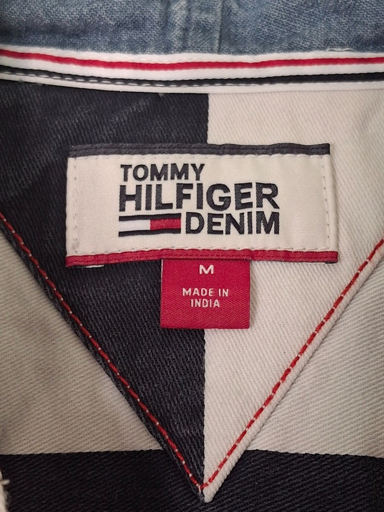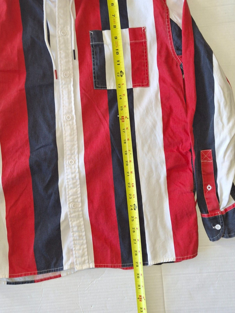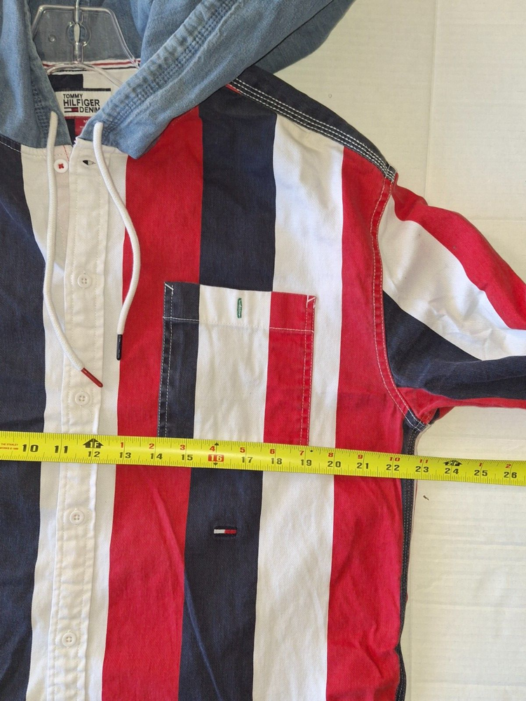 Tommy Hilfiger Red, White and Blue Striped Long Sleeve Hoodie Button Down Shirt, Light Blue Hood, Men's Size Medium. Very Good Pre-Owned Condition.