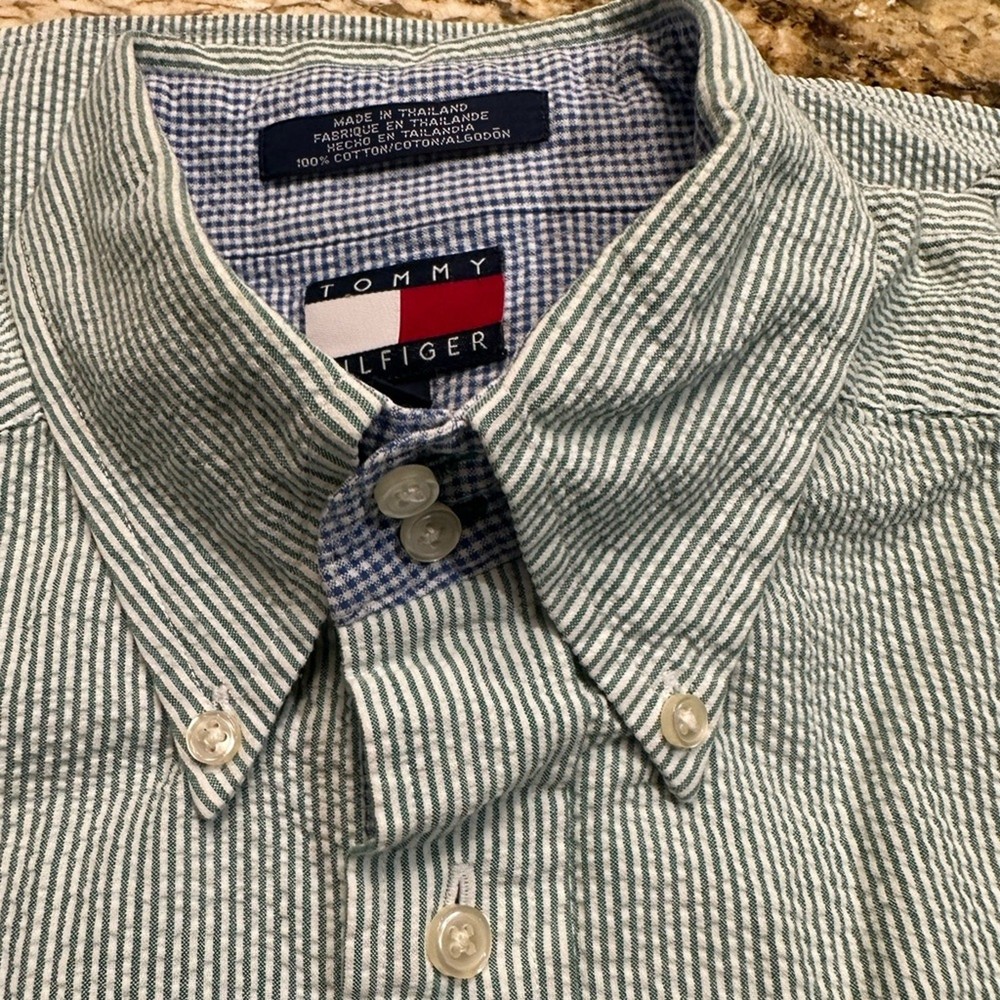 This shirt is a total winner! The seersucker fabric feels lightweight and breathable, perfect for warm days. The green and white stripes give it a crisp, classic look that pairs well with anything. Fits true to size and the quality is just what you'd expect from Tommy Hilfiger. Barely shows any wear—such a great find!