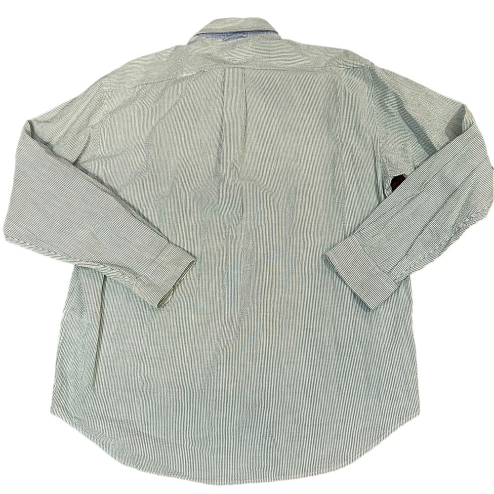 This is a great looking long sleeve, seersucker shirt by Tommy Hilfiger. Green and white striped shirt is in excellent gently used condition in a men size medium.