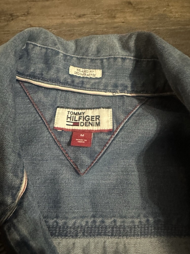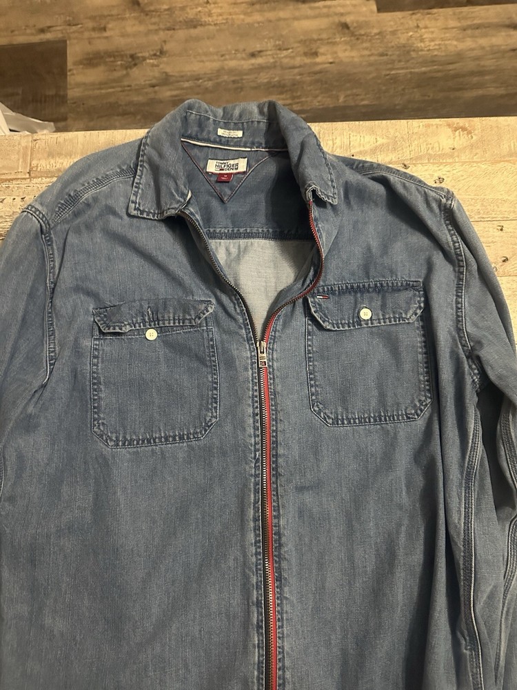 Tommy Hilfiger Denim Jacket Mens medium Blue Relaxed Full Zip Spellout Y2K Logo. Condition is Pre-owned. Shipped with USPS Ground Advantage.