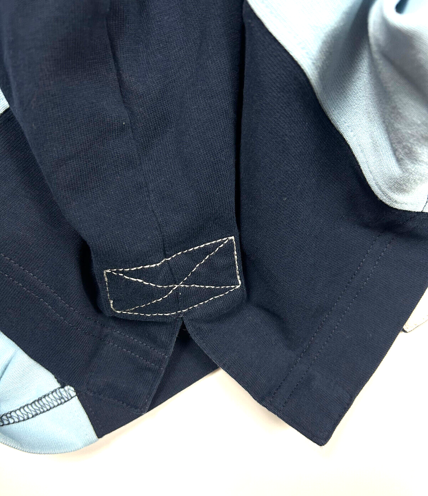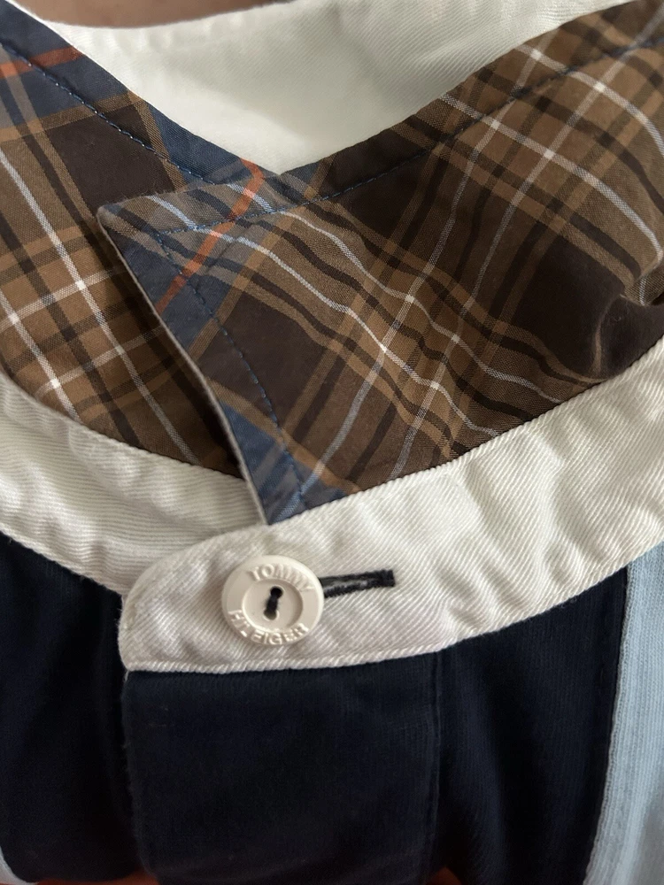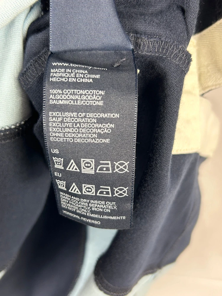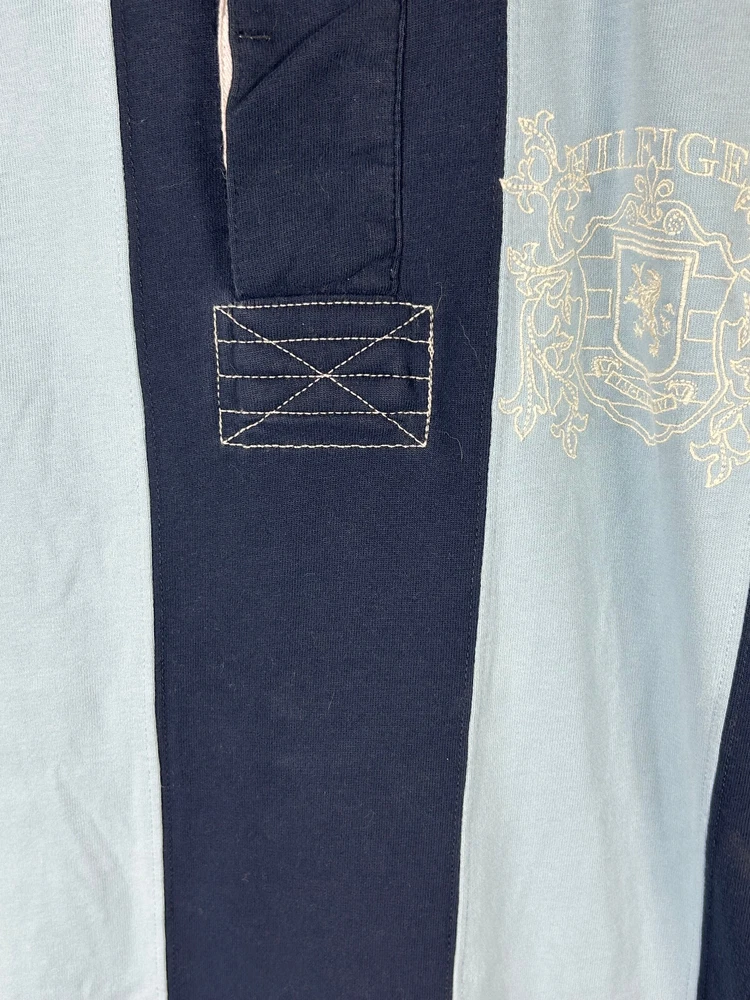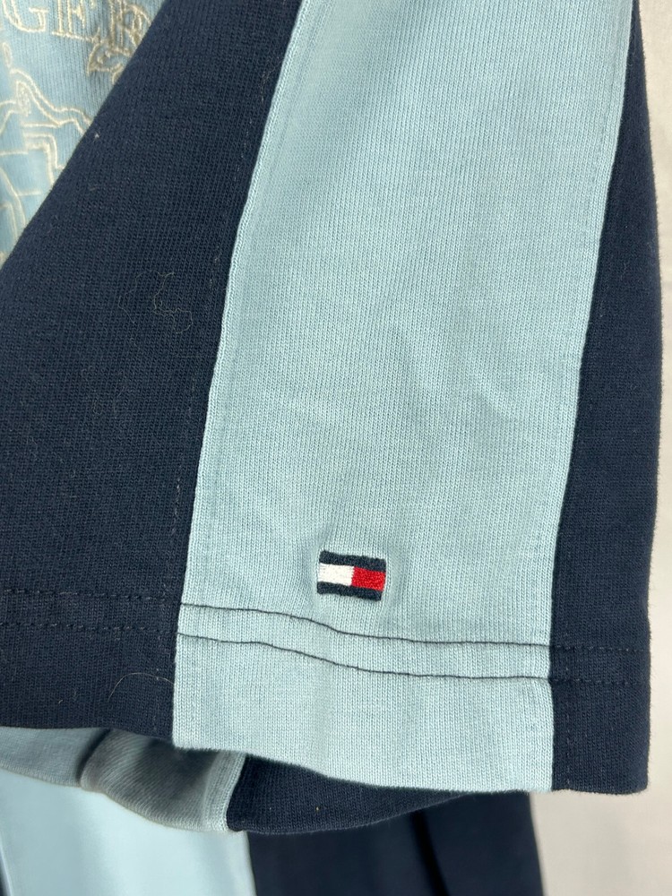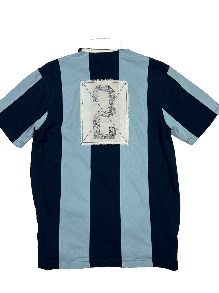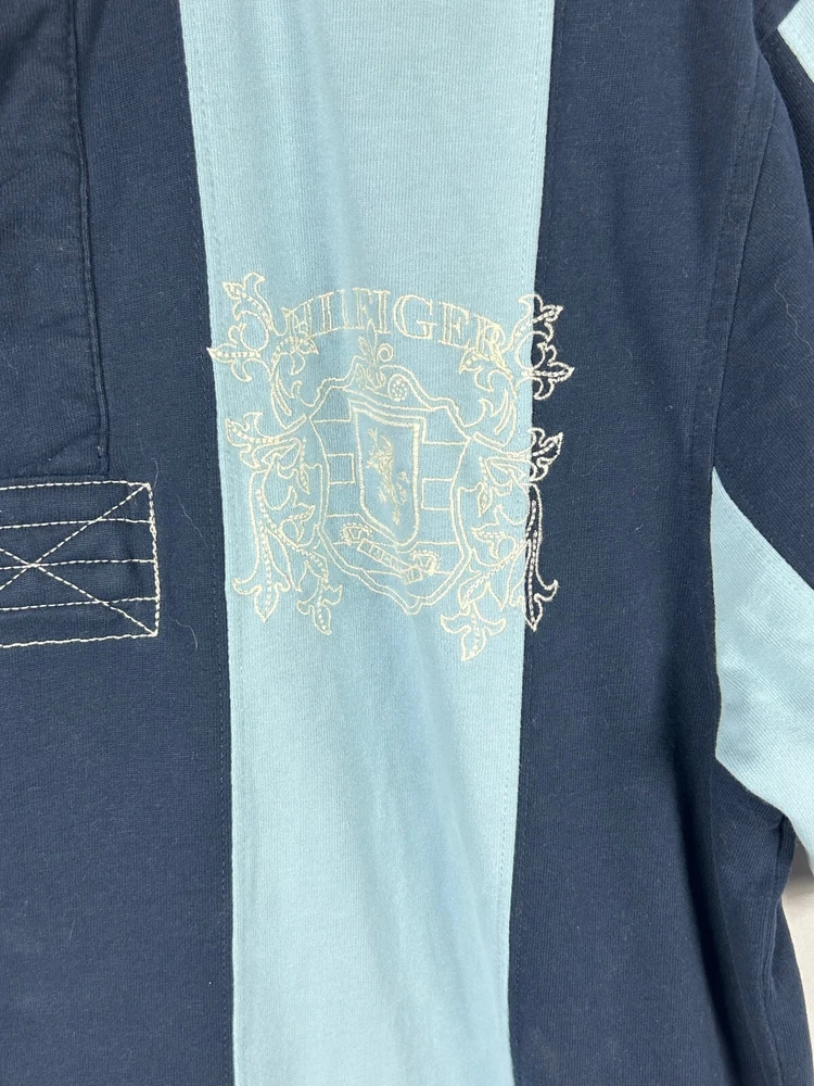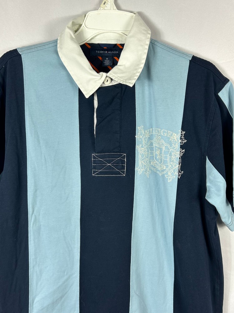 Tommy Hilfiger Polo Rugby Shirt Men's Size Medium Chest: 22" Length:30" Embroidered White Crest on chest Light and dark navy blue Wide vertical stripe Large #2 patch on back White collar and 2 buttons and stitches ant bottom (quilted feel) Quality Knit More like this and Ralph Lauren in my store~