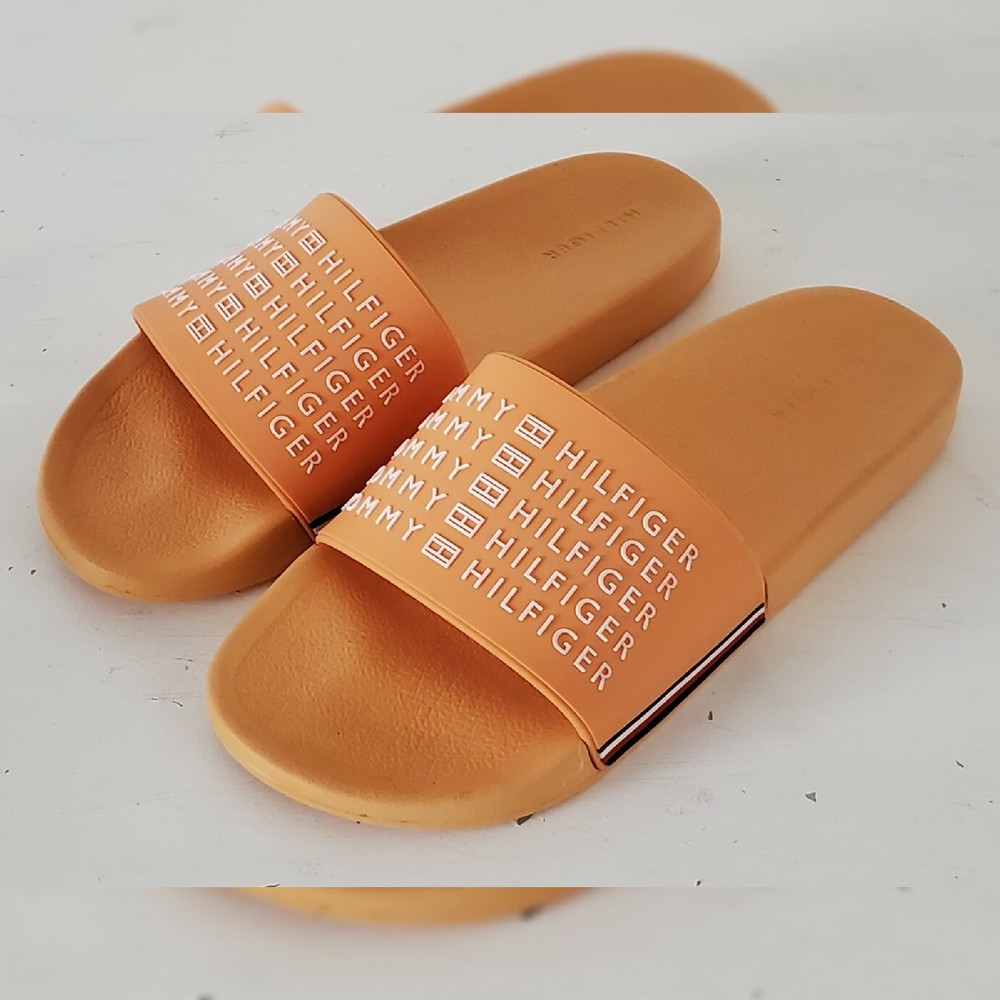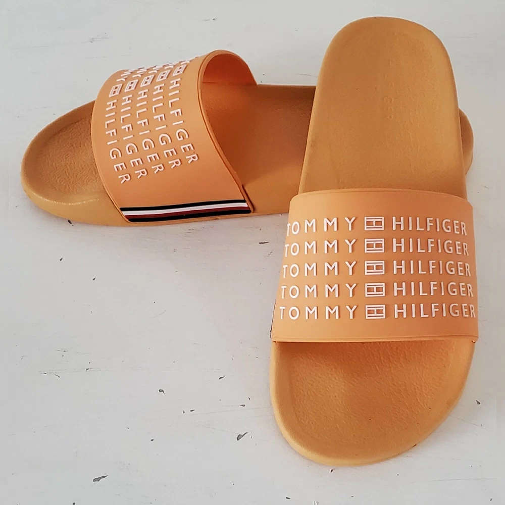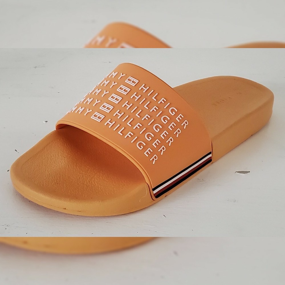 TOMMY HILFIGER AUTHENTIC ESCO-C SLIDE SANDALS MEN'S ORANGE HIGH RELIEF LOGO AND the iconic tommy flag on the sides SIZE 11 LIGHTWEIGHT.CONDITION NEW WITH TAGS.