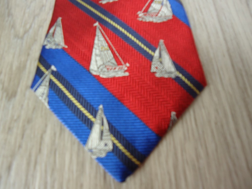 Tommy Hilfiger Men Tie VTG Silk Striped Sailboats Red Navy Gold Classic Nautical. 55 inch long. Pictures shown it folded in half for length. J3