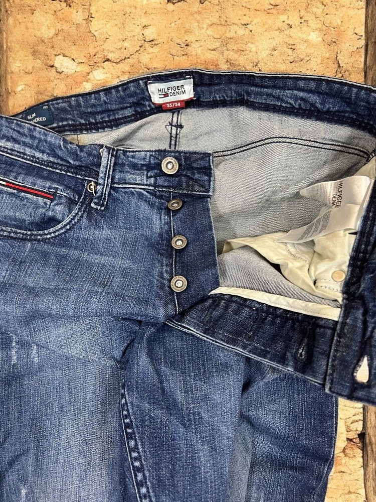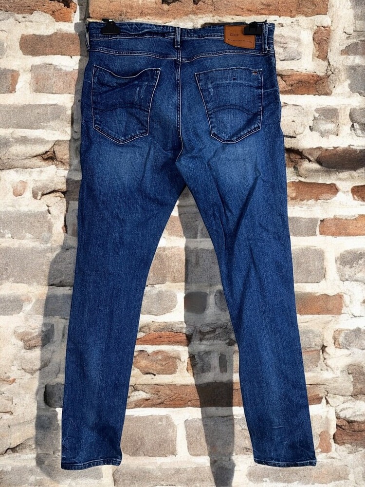 Embrace timeless style with the Tommy Hilfiger Men's Steve Jeans, tailored for a slim fit that moves with you. These jeans feature a classic button closure, a comfortable mid-rise, and a versatile medium wash denim that transitions effortlessly from casual to smart-casual settings. The size 33 waist and 34 inseam ensure a flattering fit for a variety of body types, while the cotton blend material offers both durability and breathability. Attention to detail is evident with the jeans' five-pocket design, providing practicality without sacrificing style. The signature Tommy Hilfiger logo accentuates the tapered leg, giving a subtle nod to the brand's iconic aesthetic. Machine washable for easy care, these jeans are a staple for any wardrobe, ready to be paired with your favorite shirts and shoes for an effortlessly put-together look. Measurements: Waist: 43,5 cm length: 108 cm Inseam: 84 cm Leg opening: 16 cm Front rise: 28 cm Back rise: 39 cm Feel free to make me any reasonable price offers.
