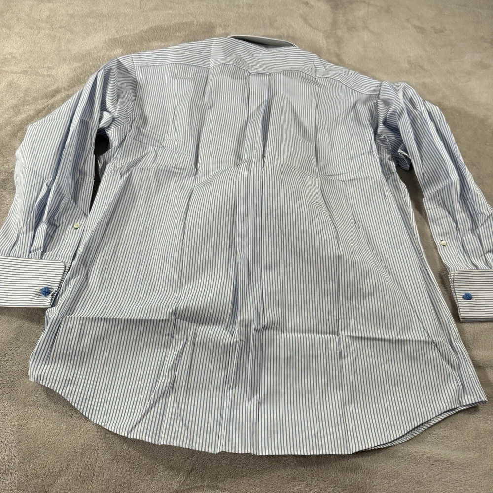 Look effortlessly stylish with this Tommy Hilfiger men's dress shirt. Featuring a classic spread collar and button closure, this woven blue and white striped shirt is made of 100% cotton, making it comfortable to wear and machine washable for easy care. The contrasting trim and all-season features make it a versatile addition to any wardrobe, suitable for various occasions such as travel, weddings, parties, christenings, formal events, workwear, and business meetings. This vintage shirt has a regular fit and comes in size large with a neck size of 16.5 and a chest size that can be seen in the photos provided.