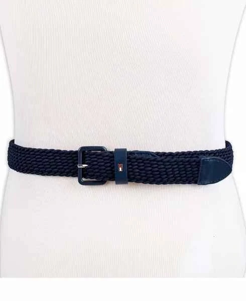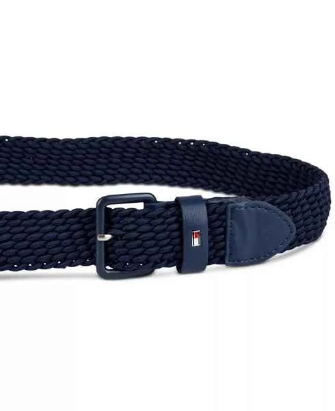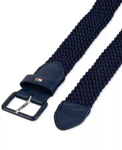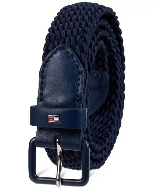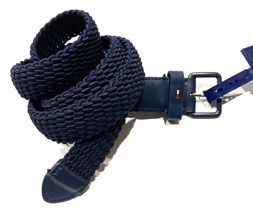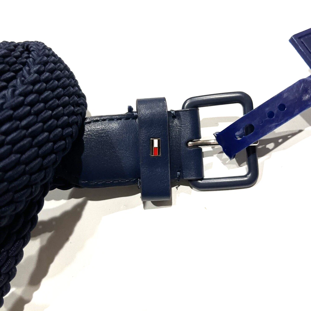 Tommy Hilfiger Men's Tonal Braided Harness Buckle Belt size: XL (size 42-44) color: Navy 1-1/4" wide elastic web strap Tonal braided design with faux leather trim at tip and buckle ends Matching harness buckle Tommy Hilfiger Flag logo ornament inlaid on strap keeper loop Polyester/rubber/polyurethane/leather