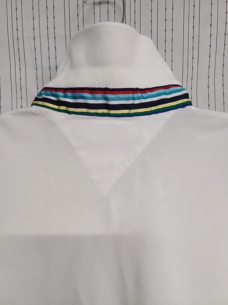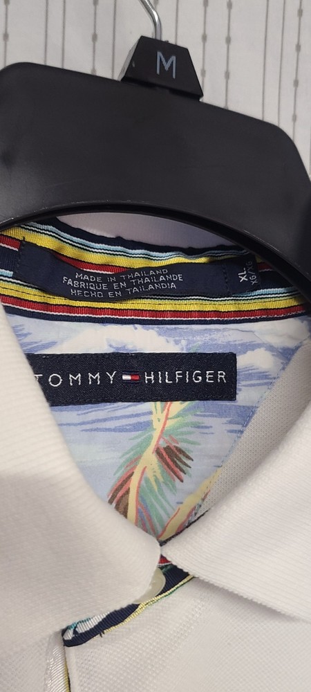 Add a touch of classic and modern style to your wardrobe with this Tommy Hilfiger men's polo shirt in size XL. The shirt features a white color with an embroidered logo, a button-down collar, and short sleeves. It has a pullover closure and is made of a lightweight and easy-care fabric that is perfect for all seasons, including winter, summer, fall, and spring. The shirt also has a graphic print pattern with palm trees and a tropical theme, making it perfect for casual occasions and walking activities. It has pockets and is machine washable. The shirt is a great addition to any wardrobe and can be paired with jeans or shorts for a classic and stylish look. Good pre-owned condition. Professionally Laundered. Stored in AC pet smoke free facility. Thanks for shopping by.