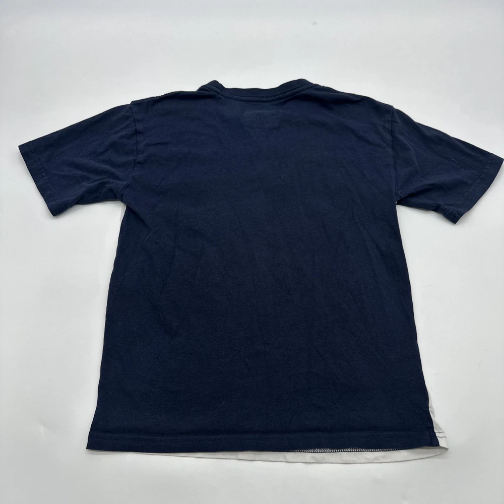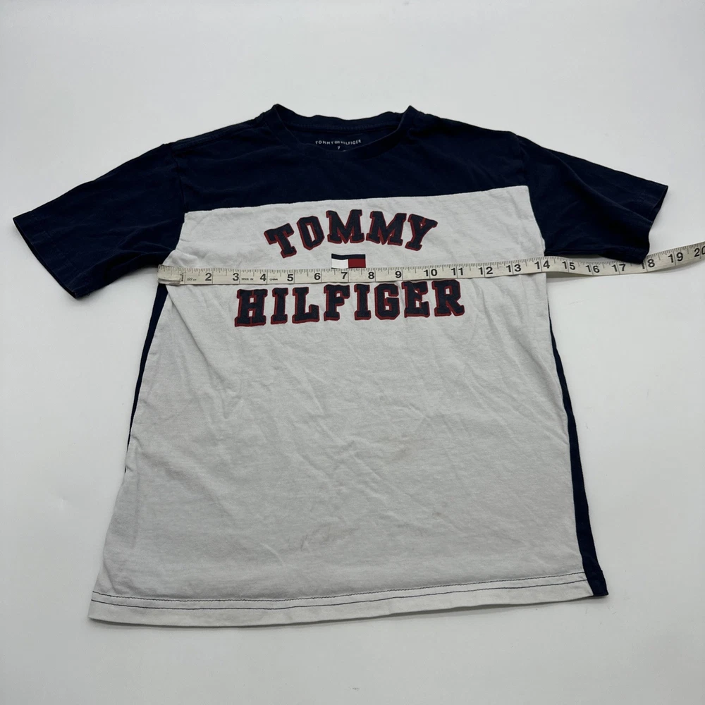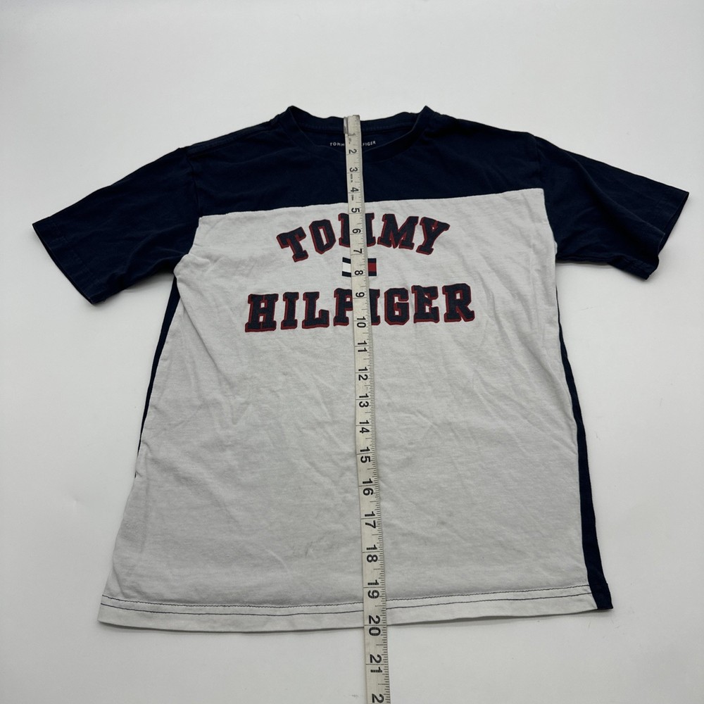 The product is a Tommy Hilfiger T-Shirt in youth boy size 7, featuring a graphic print logo on the front. Made from 100% cotton, this short sleeve shirt with a crew neck and pullover closure is perfect for casual occasions. The classic blue color and Tommy Hilfiger brand logo give it a stylish and timeless look, while the regular fit ensures comfort for active boys. Easy to care for, this basic T-shirt is a wardrobe staple for young boys who appreciate quality and style. *Check the images above for the flaws and measurements of the item.