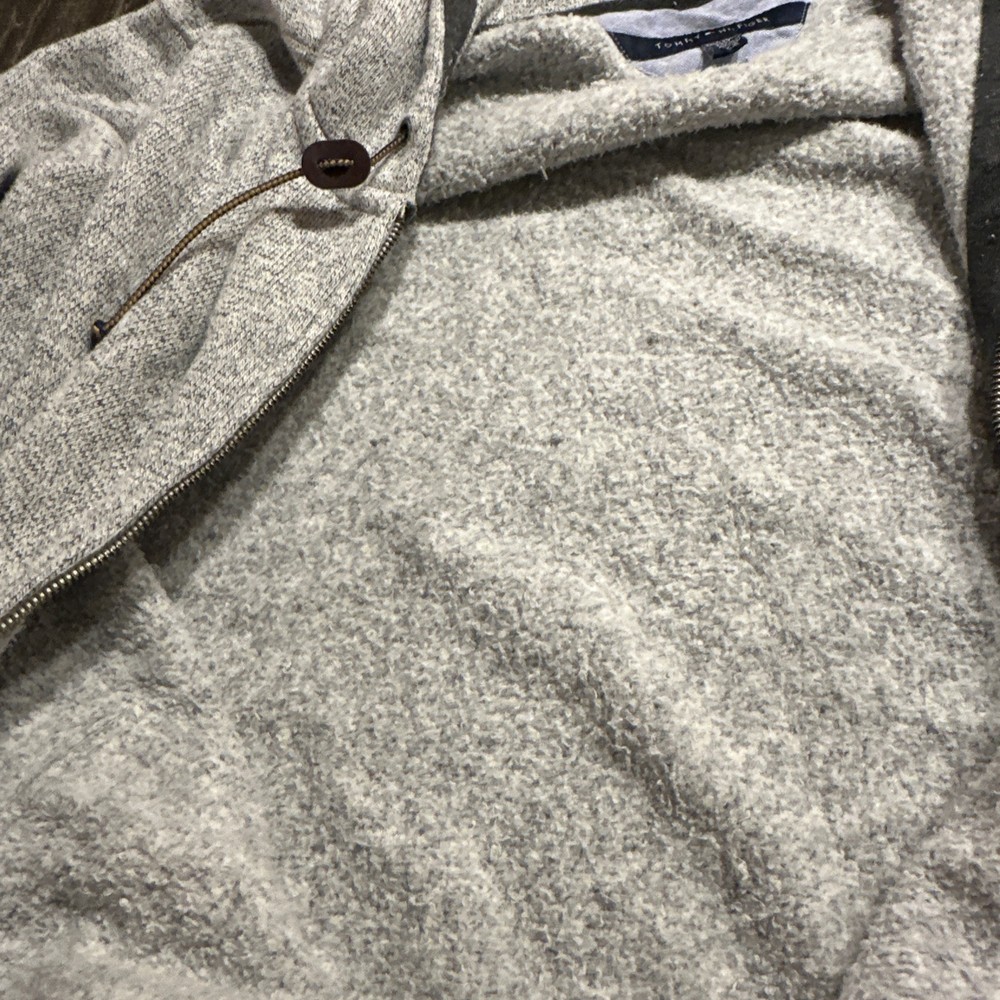 Stay cozy and stylish with this Tommy Hilfiger full zip hoodie jacket in textured gray. Made of 100% polyester, this hoodie features a hooded neckline, long sleeves, and pockets for added convenience. Perfect for activewear, this designer hoodie is suitable for unisex adults in size 2XL. The Tommy Hilfiger hoodie is a great addition to your wardrobe, whether you're hitting the gym or running errands. With its full zip closure and hooded neckline, you can stay warm and comfortable in any setting. The textured gray color adds a touch of sophistication to this casual piece, making it a versatile choice for any outfit.