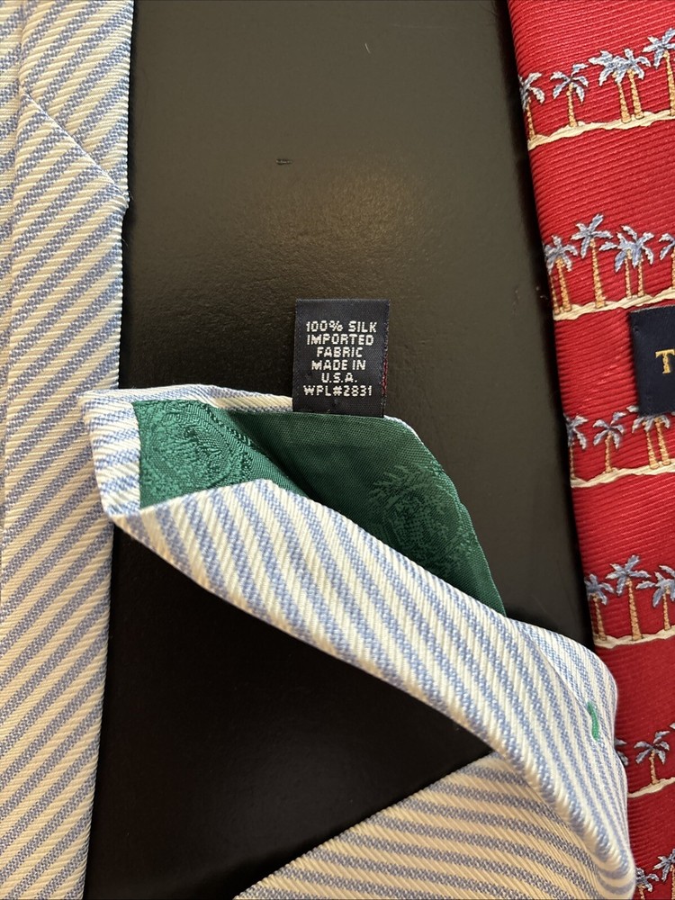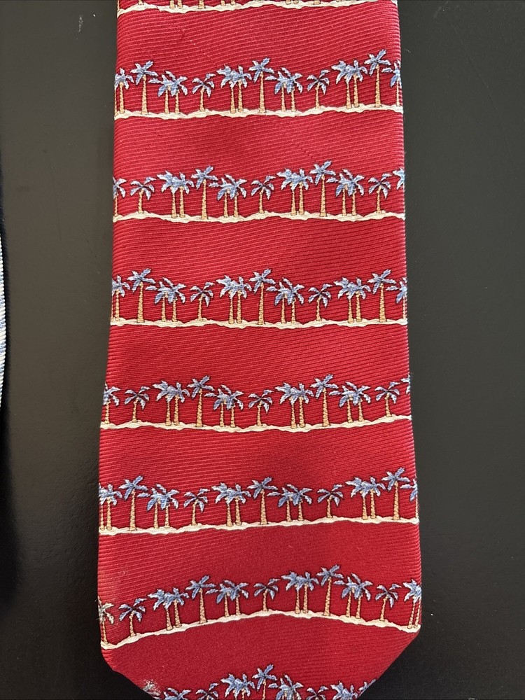 This is a tropical-themed Tommy Hilfiger tie featuring a red color with palm trees pattern. It is made of 100% silk, in a classic size and style with logo accents. This vintage tie is from the United States and has a classic width. Perfect for men looking to add a touch of tropical flair to their outfit.