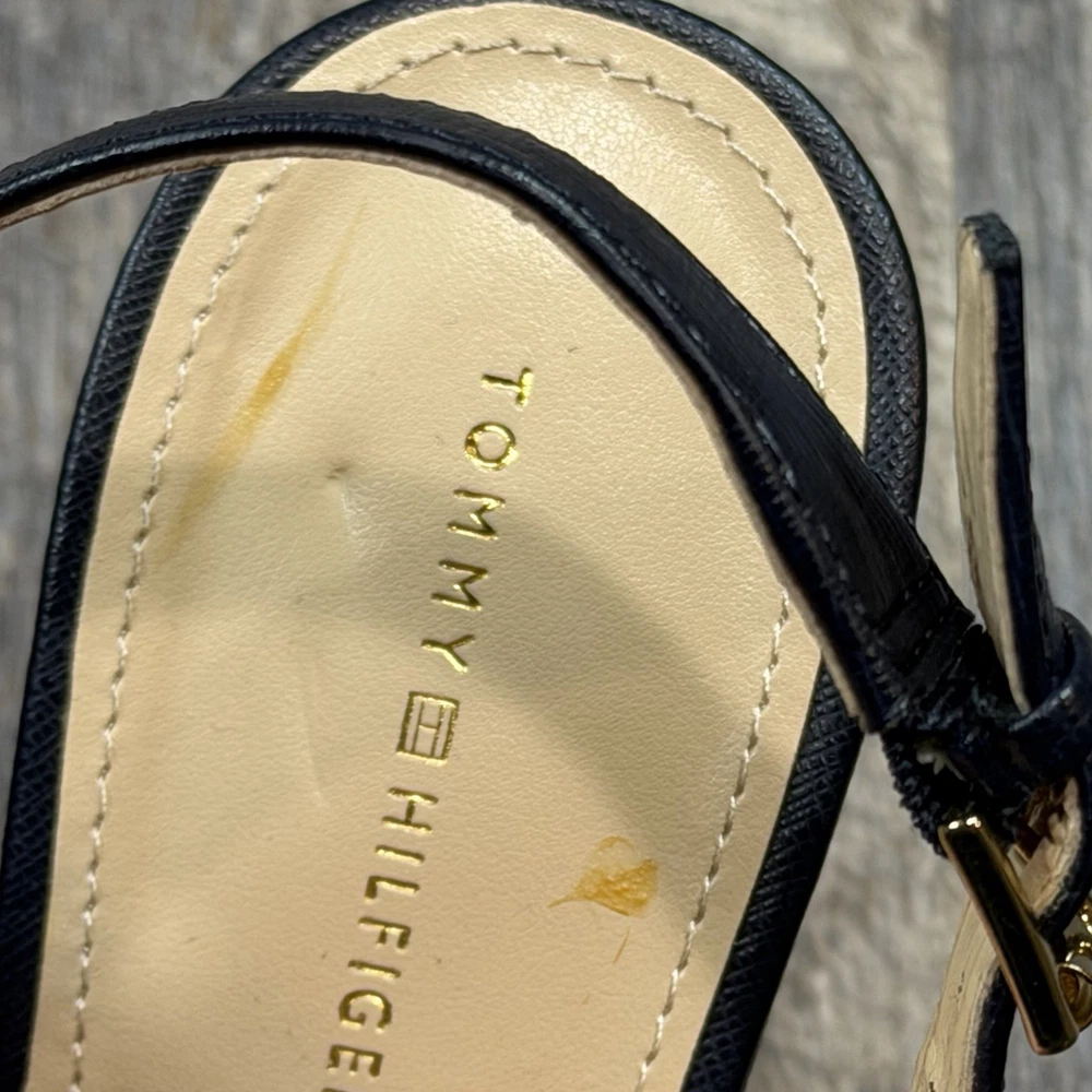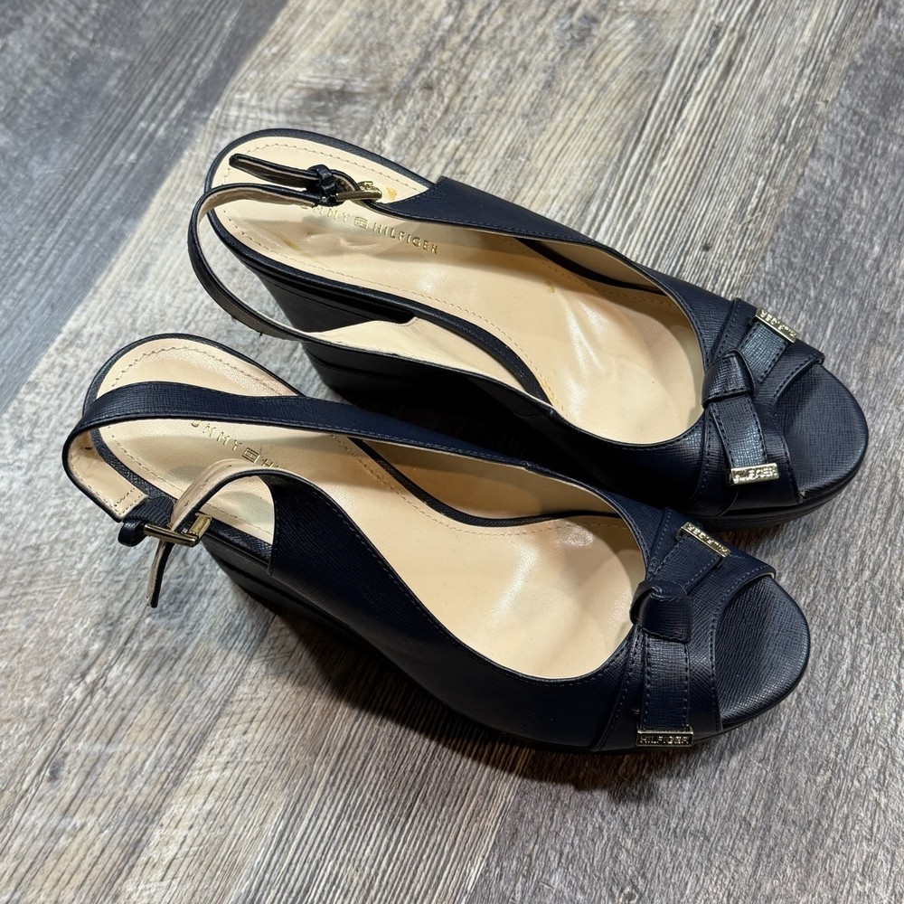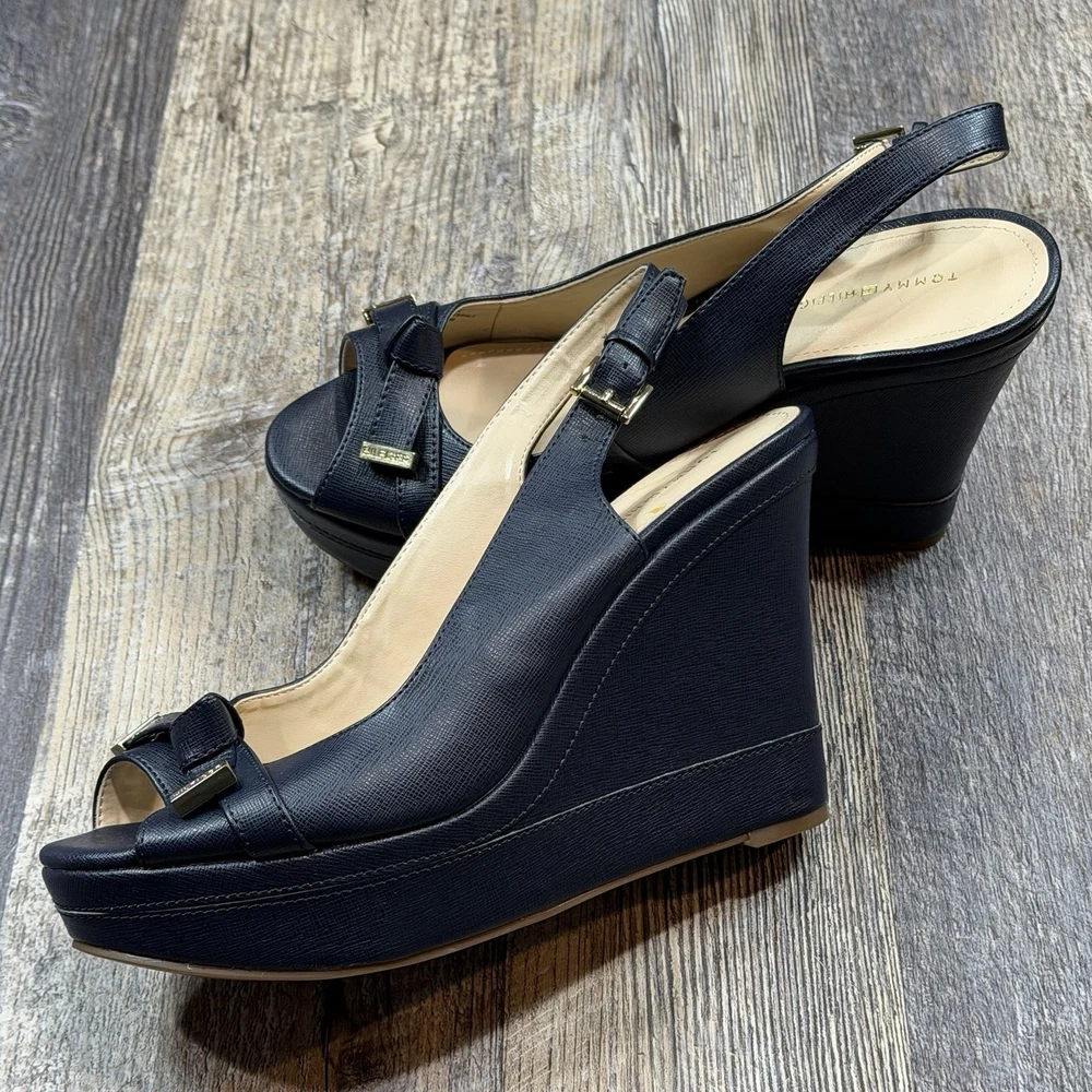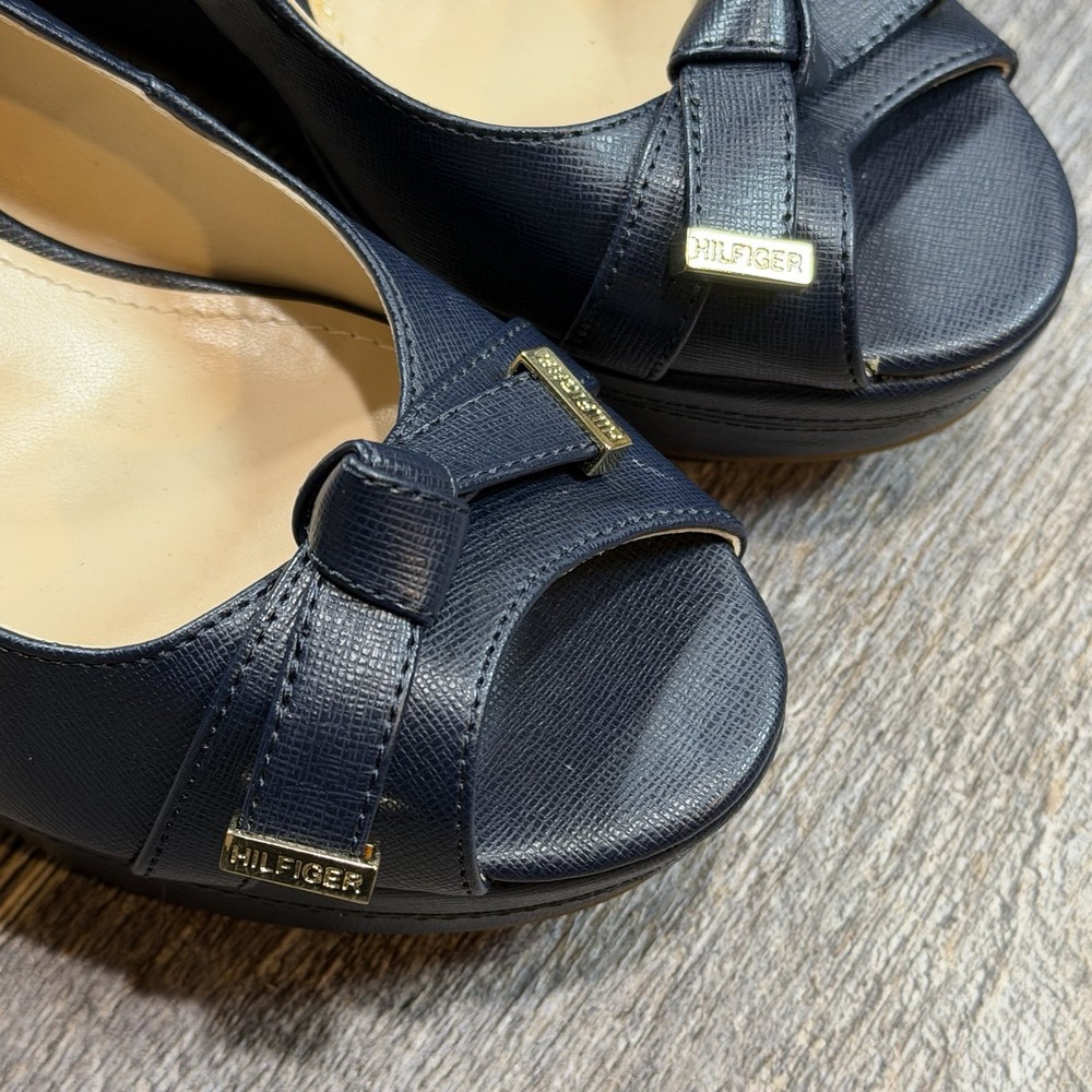 Tommy Hilfiger Twkarra wedge sandals in a navy blue textured finish. Stylish peep toe design with slingback strap and buckle closure. Comfortable wedge heel makes them easy to wear for casual or dress occasions. Details Brand: Tommy Hilfiger Model: Twkarra Size: Womens 8M Style: Wedge Sandal / Slingback Color: Navy Blue Toe: Peep Toe Closure: Adjustable buckle strap Material: Man-made materials Features Wedge heel platform design Slingback strap with gold-tone buckle Peep toe front Bow detail with Hilfiger logo hardware Textured faux leather upper Cushioned insole Durable rubber outsole Condition: These look like they have never been worn outside. No original box and the left insole has what looks like glue? NOTE: Please see all photos for condition as all flaws will be shown throughout the photos! * COLORS MAY BE DARKER OR LIGHTER OR SLIGHTLY DIFFERENT DUE TO MONITOR/PHONE/TABLET SETTINGS.