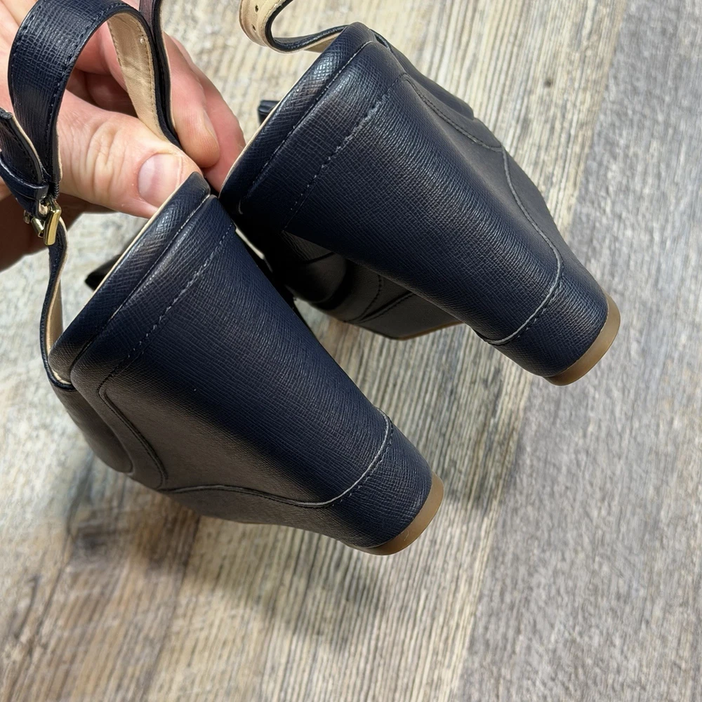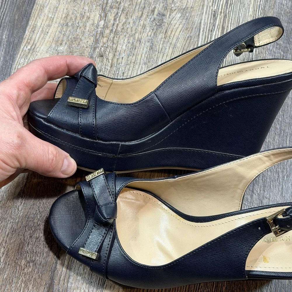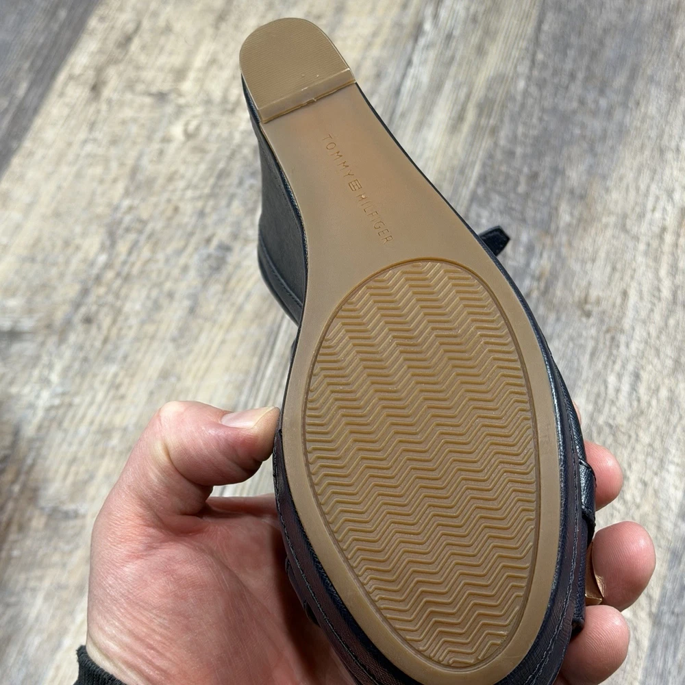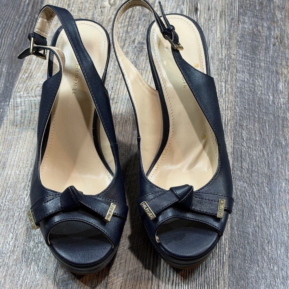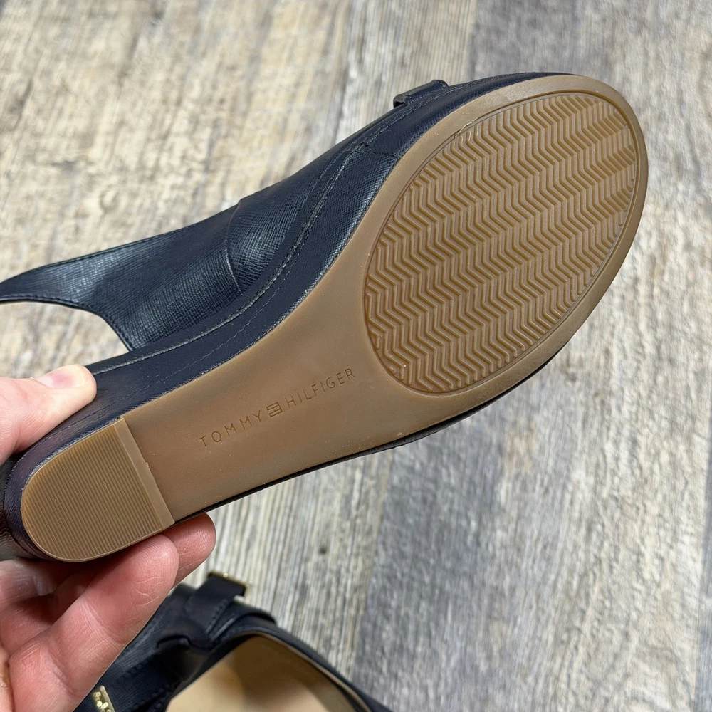 Tommy Hilfiger Twkarra wedge sandals in a navy blue textured finish. Stylish peep toe design with slingback strap and buckle closure. Comfortable wedge heel makes them easy to wear for casual or dress occasions. Details Brand: Tommy Hilfiger Model: Twkarra Size: Womens 8M Style: Wedge Sandal / Slingback Color: Navy Blue Toe: Peep Toe Closure: Adjustable buckle strap Material: Man-made materials Features Wedge heel platform design Slingback strap with gold-tone buckle Peep toe front Bow detail with Hilfiger logo hardware Textured faux leather upper Cushioned insole Durable rubber outsole Condition: These look like they have never been worn outside. No original box and the left insole has what looks like glue? NOTE: Please see all photos for condition as all flaws will be shown throughout the photos! * COLORS MAY BE DARKER OR LIGHTER OR SLIGHTLY DIFFERENT DUE TO MONITOR/PHONE/TABLET SETTINGS.