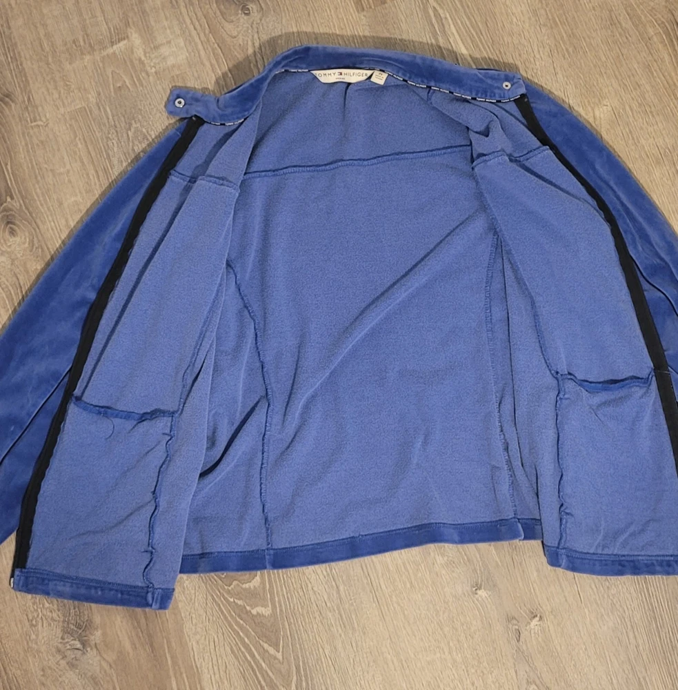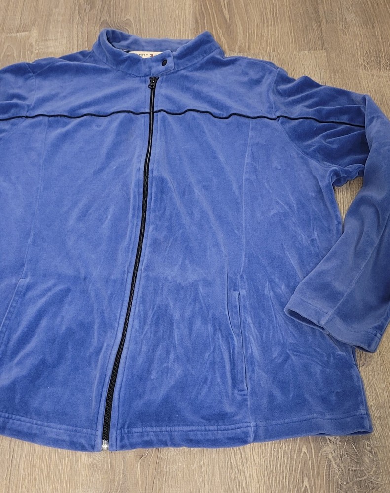 For sale is a women's Tommy Hilfiger velour jacket in size 2X. This jacket features a solid pattern with contrasting trim and pockets. It has a relaxed fit and long sleeves with a zip closure. The jacket is part of a tracksuit set that includes one piece. This versatile jacket is perfect for travel, activewear, and casual occasions. It is machine washable and suitable for all seasons, including winter, summer, fall, and spring. The jacket comes in a beautiful blue color and is made of high-quality velour fabric. FS1