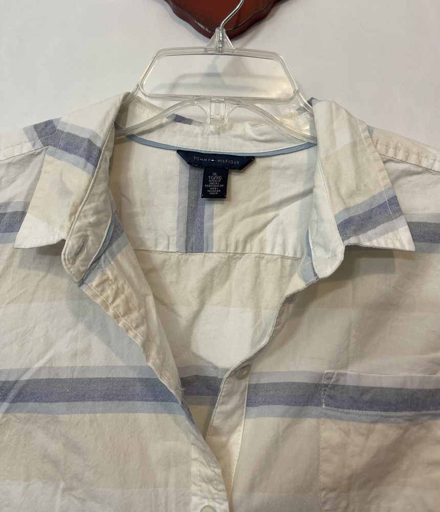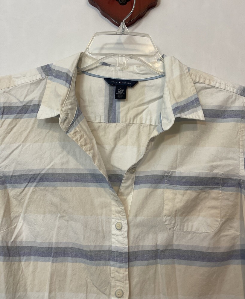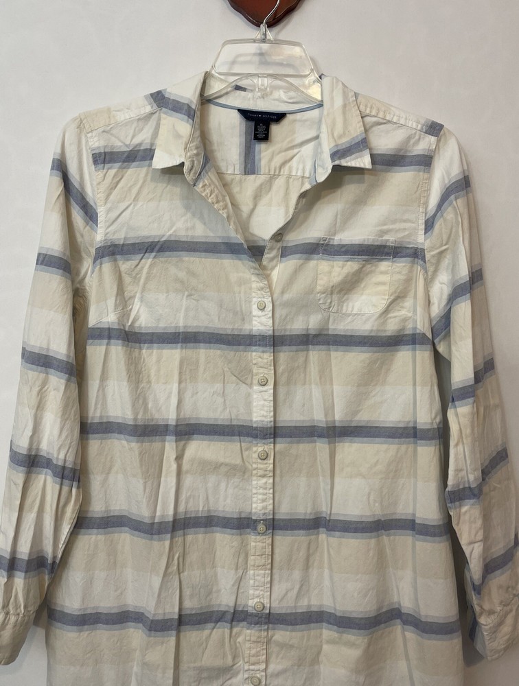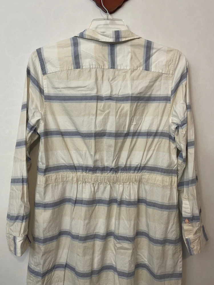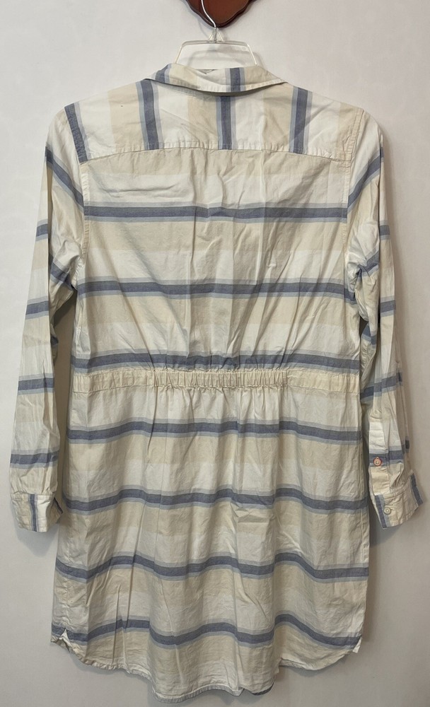 Elevate your casual wardrobe with this Tommy Hilfiger women's tunic shirt dress. The white striped cotton fabric creates a classic and preppy look, while the elastic waist and sewn belted waist provides comfort and ease. The dress features a collared neckline, button closure, and casual sleeves, making it perfect for all seasons and occasions. Additionally, the dress has a chest pocket, ensuring both functionality and style. This button-up shirt dress is a must-have for any fashion-forward woman's wardrobe. Length: 37 inches. Chest: 20 inches across laying flat.
