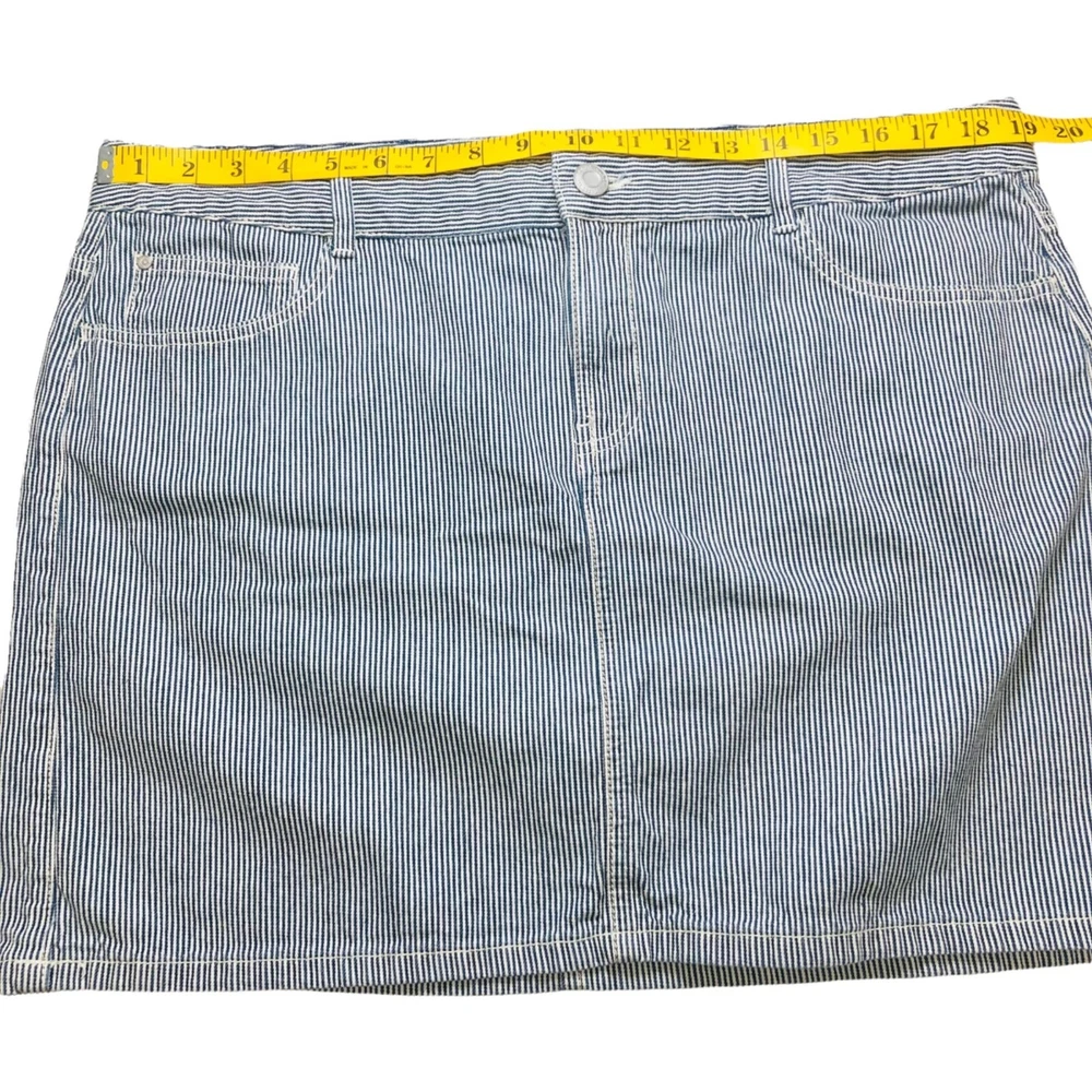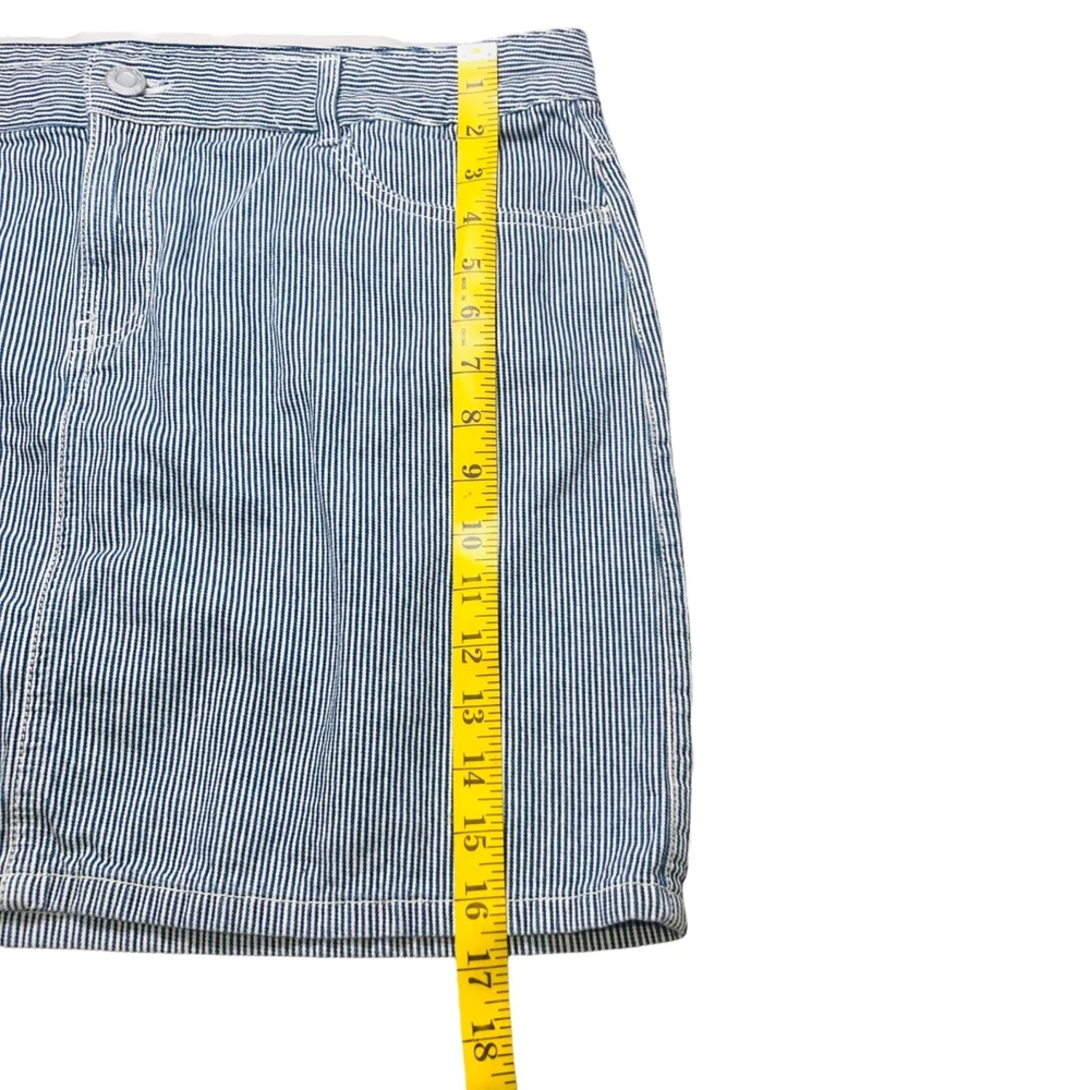 Tommy Hilfilger blue pinstripe denim mini skirt Features: mini skirt, zipper and button closure, belt loop, five functional pockets, plus size Condition: Very good pre-owned condition. No rips, holes, or stains. Size: Women Size 16 Measurements Waist: 19” Length: 16.5” Please see photos. Measurements are approximate and taken while garment is laid flat. To ensure a good fitting, compare these measurements to a garment you currently own. Style profile: summer, casual, nautical, Fourth of July, BBQ, movies, school, college, preppy, mall, Y2K