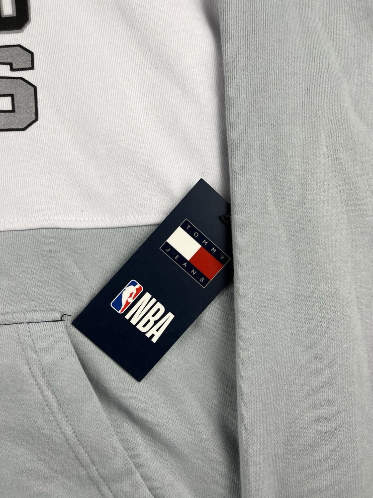 Elevate your game day attire with the Tommy Jeans x San Antonio Spurs Color Block Pullover Hoodie. A stylish blend of comfort and team pride, this hoodie features a crisp white and grey color scheme that effortlessly complements your casual wardrobe. The iconic Spurs logo and Tommy Jeans branding create a dynamic look perfect for supporting your favorite NBA team. Crafted for the regular season enthusiast, this size XL hoodie is officially licensed, ensuring you're decked out in authentic fan gear. The versatile design of the FA22 Mens GII Tommy Jeans Andrew Split PO Hoodie makes it an ideal choice for those brisk game nights or casual outings, all the while showcasing your Spurs loyalty with every wear.