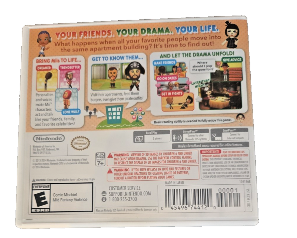 The product is a preowned Nintendo 3DS game titled "Tomodachi Life" from the Nintendo Selects series. Released in 2016, the simulation game is rated E for Everyone and includes features such as multiplayer and online playability. Published by Nintendo, the game involves creating and interacting with virtual characters in a unique and immersive gaming experience. Perfect for fans of simulation games looking to enjoy a fun and engaging gameplay on their Nintendo 3DS platform.
