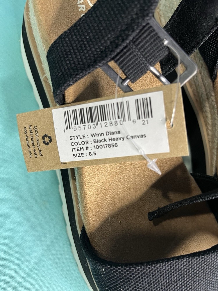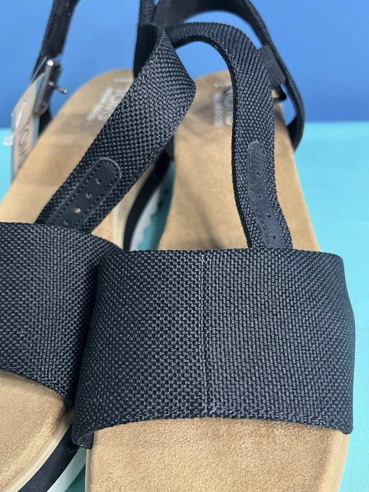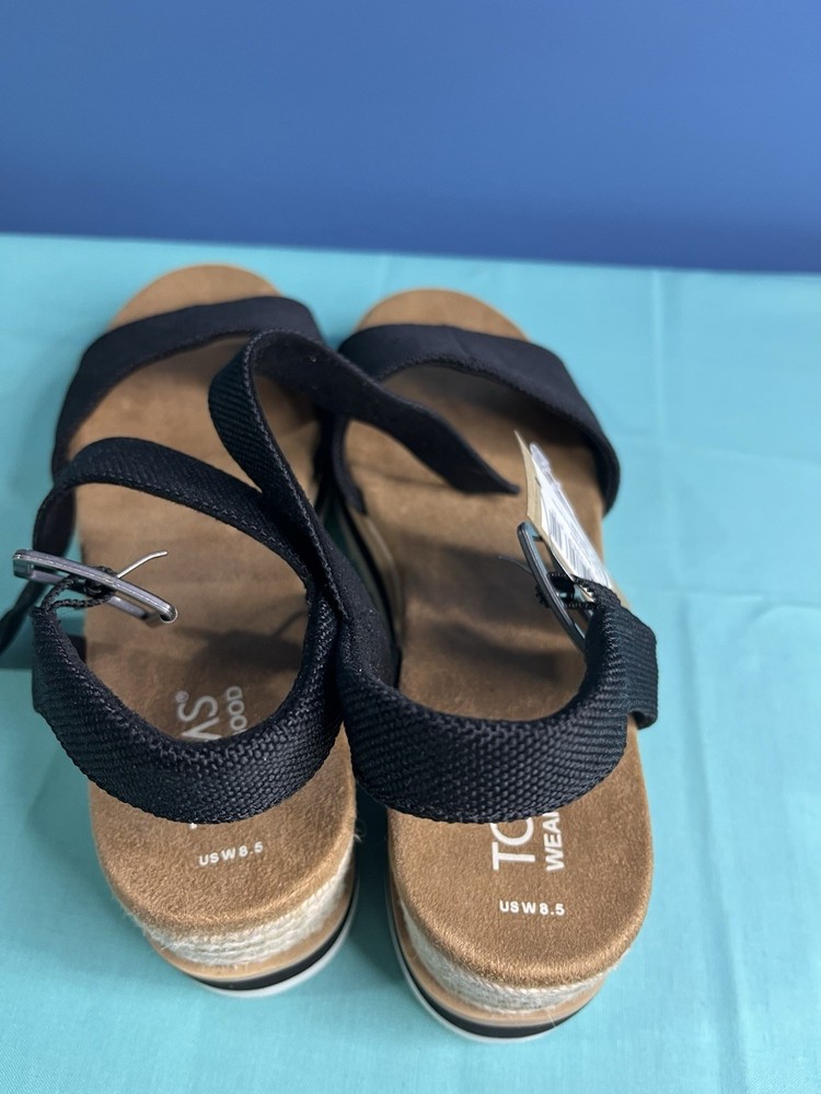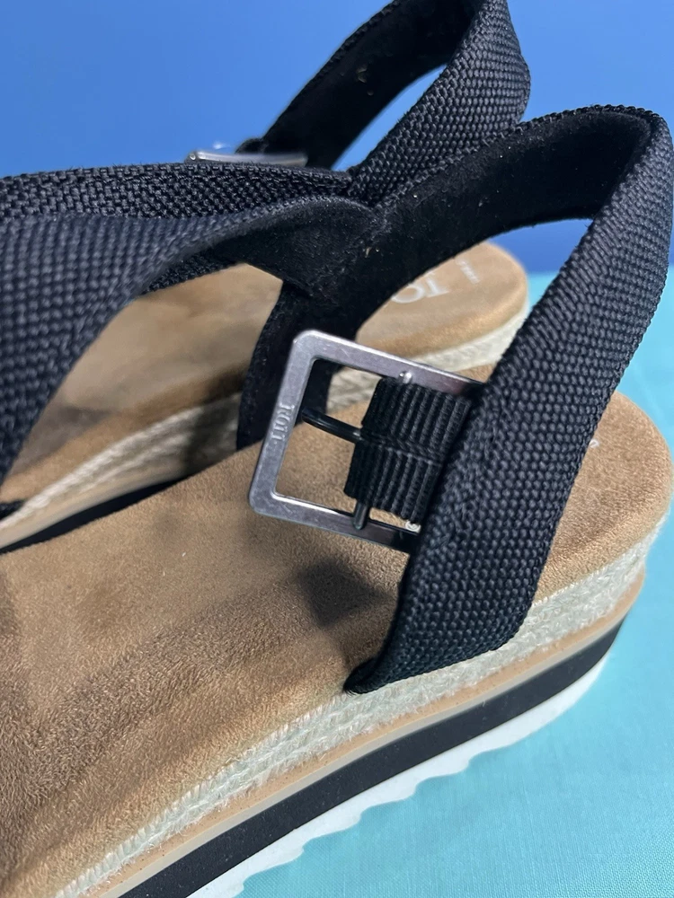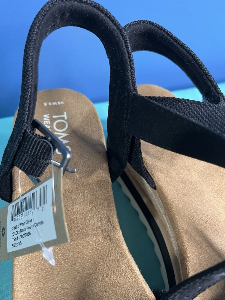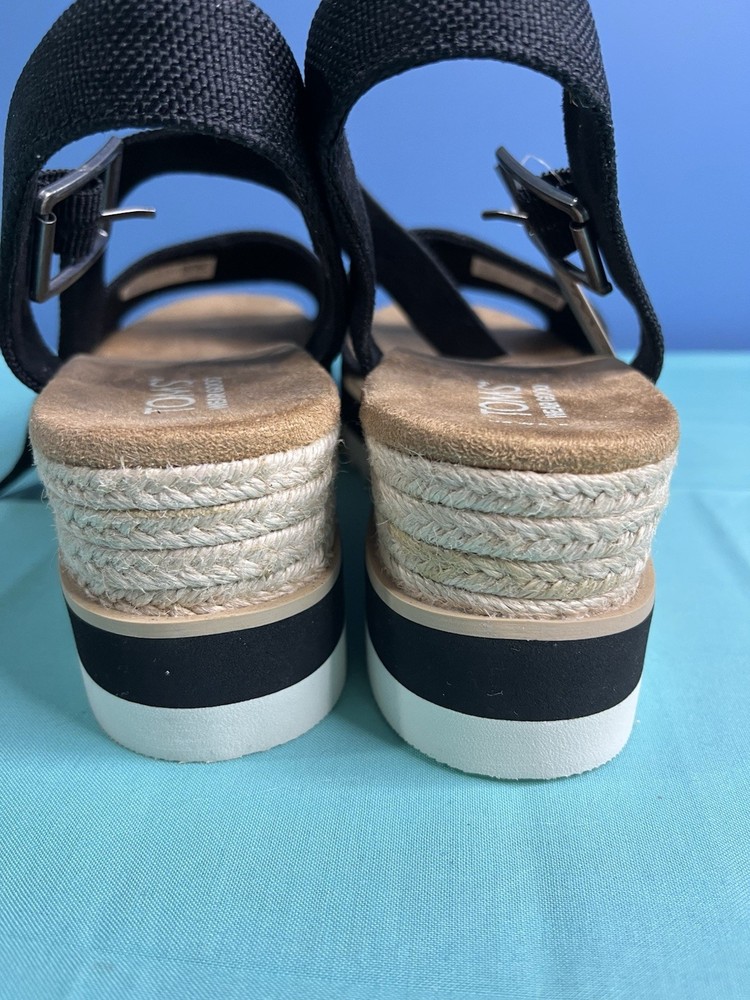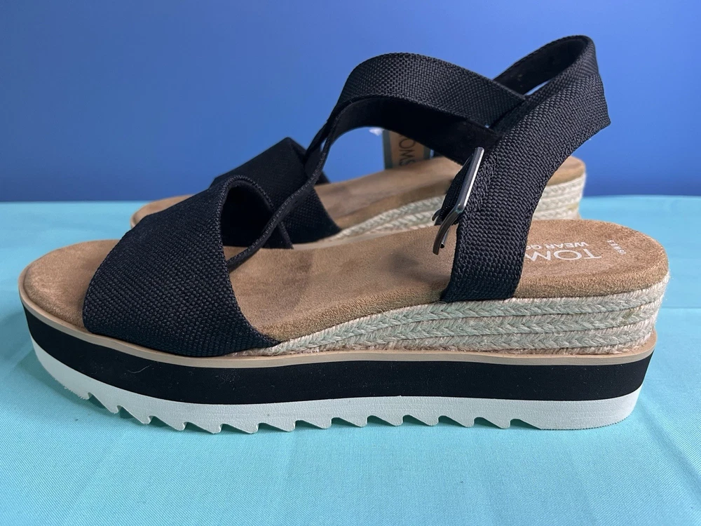 The TOMS Women's Diana Wedge Sandals in black are a stylish and versatile choice for any season. With a mid-height wedge heel and adjustable buckle strap closure, these slip-on sandals are perfect for casual outings or travel. The rubber outsole provides durability and traction, while the cotton upper material ensures comfort and breathability. The solid black color and classic TOMS branding make these sandals a staple piece for any woman's shoe collection.