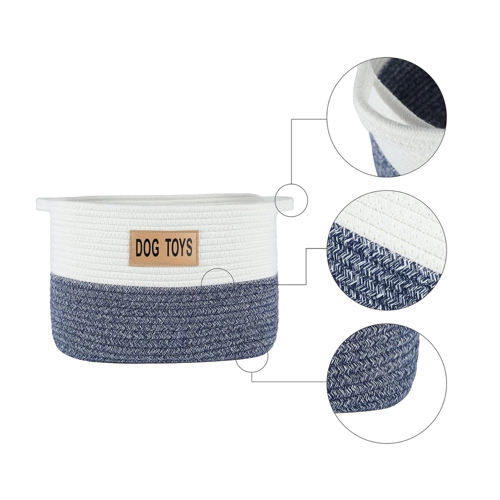 13" x 9.5" x 9" A stylish toned blue and white cotton rope dog toy storage basket will be a great addition to your home decor. This makes for an easy way to your dog's toys. Top access allows them to pick and choose what they want.