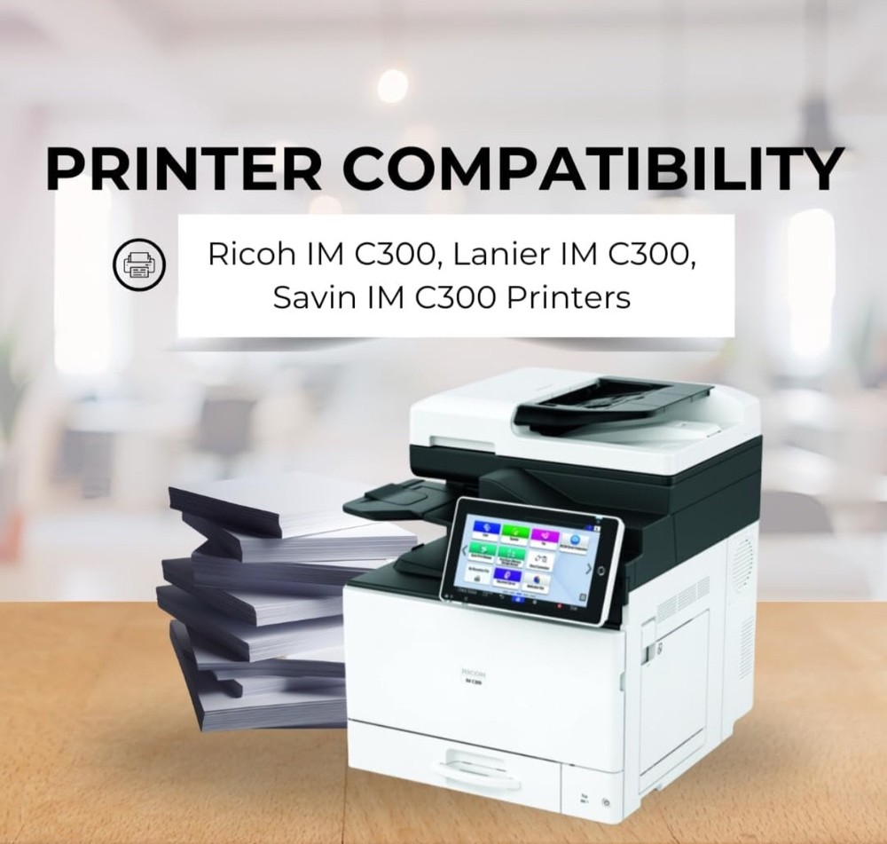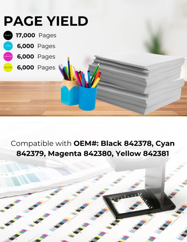 #2762 Toner Pros Compatible Ricoh 842378, 842379, 842380, 842381 High-Yields Toner Cartridge β Replacement for IM C300, Lanier IM C300, Savin IM C300 Printers- 4 Color Pack, Black 17,000 & Color 6,000 Pages Brand Toner Pros Color Black-Cyan-Magenta-Yellow Item Weight 1.72 Kilograms Included Components Toner Cartridge Compatible Devices Printer Compatibility Options Compatible, OEM ππππππππππ πππππππ ππππππ: Compatible with IM C300, Lanier IM C300, Savin IM C300 Ricoh printer toner Models. ππππππππ πππ πππππππππππ: Compatible Replacement for OEM#: Black 842378, Cyan 842379, Magenta 842380, Yellow 842381. ππππ πππππ: This Ricoh 842378 toner Print 17,000 pages per 842378 black and 6,000 pages per 842379 cyan, 842380 Magenta, 842381 Yellow toner cartridges at 5% coverage on letter or A4-sized paper. Please note that yield may vary based on the image area coverage and print mode selected. πππππππππππ πππππ πππππππ: Our compatible Ricoh 842379 toner cartridges provide an exceptional printing experience, producing vibrant printouts without compromising on quality. ππππ ππππππππππππ: This compatible Ricoh 842381 toner engineered for a quick and hassle-free setup, this cartridge is designed to fit and function smoothly, minimizing downtime and keeping your workflow uninterrupted. What's in the box Toner Cartridge