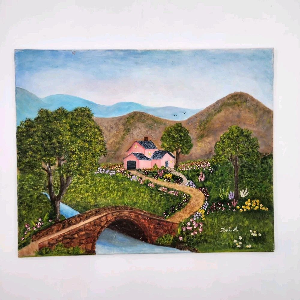 Toni A. Painting Landscape House Woods Bridge Original Signed Folk Art 20"x16"