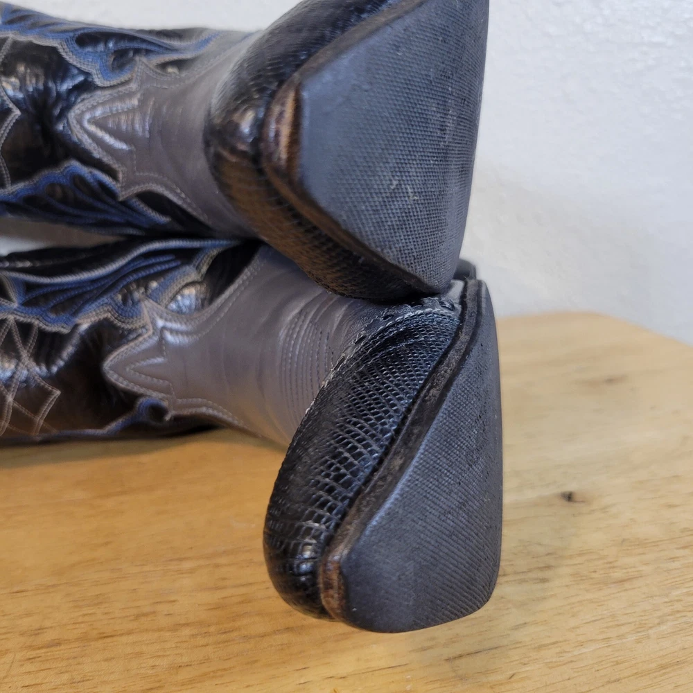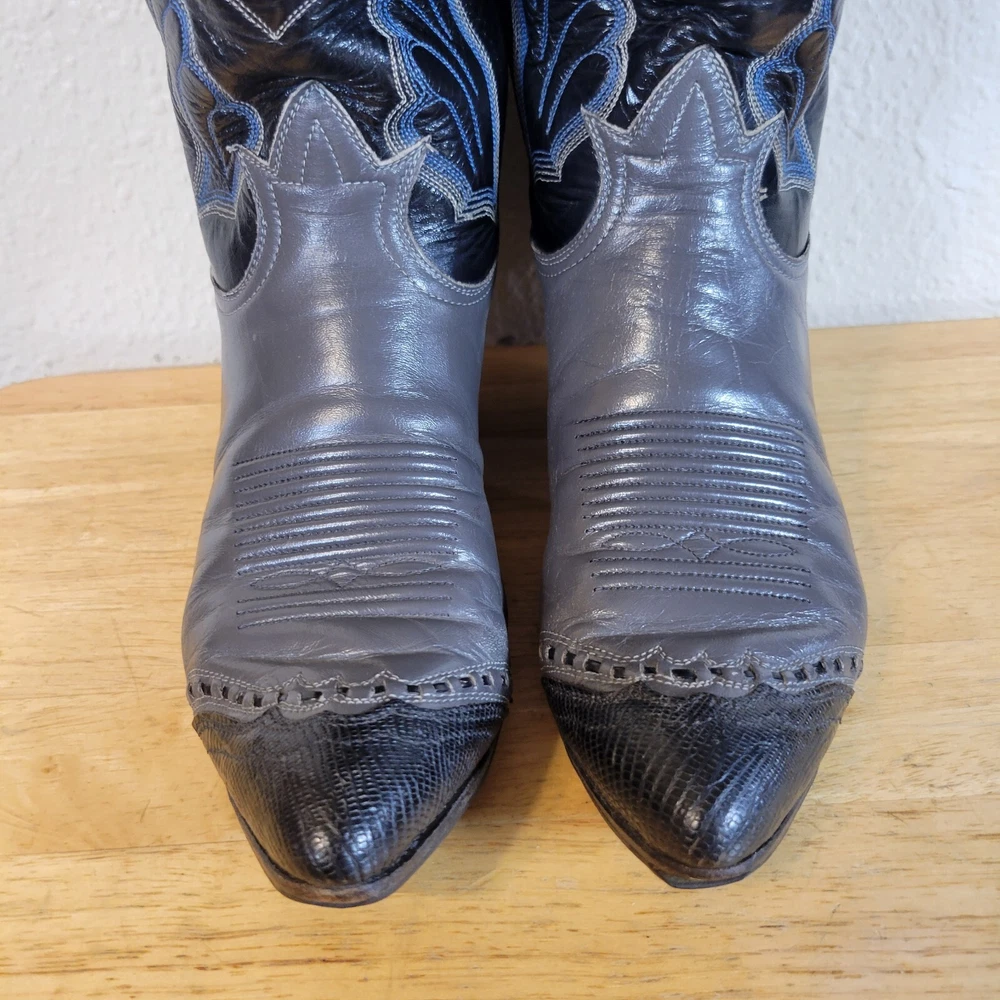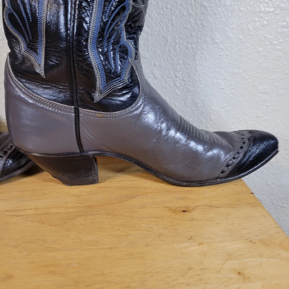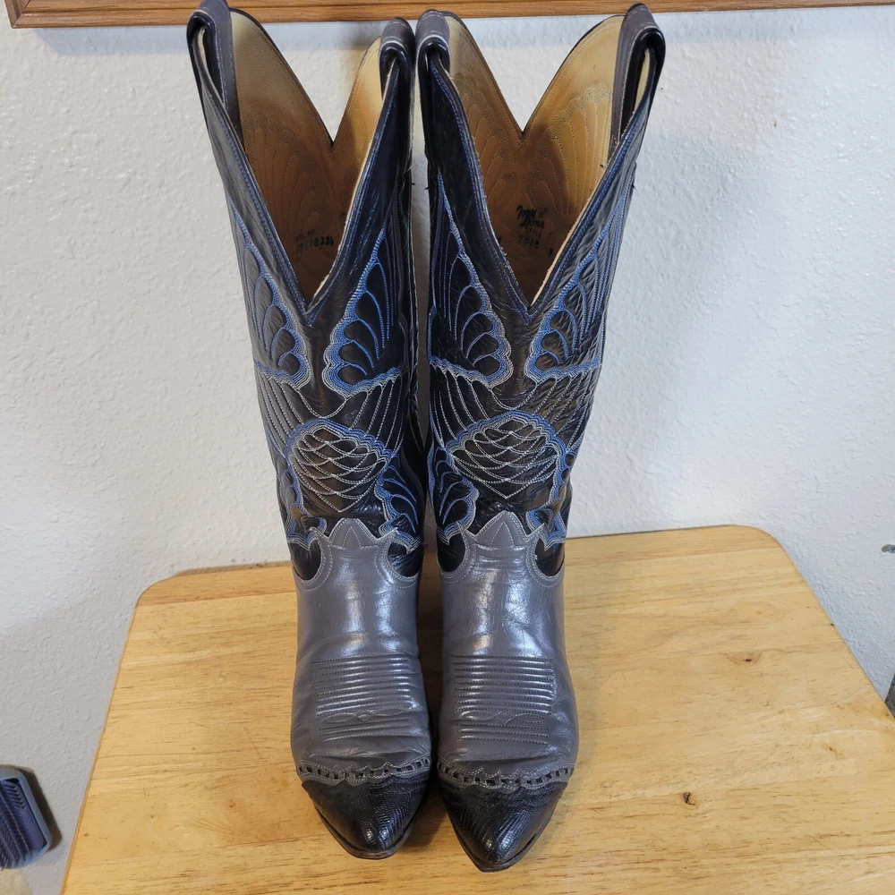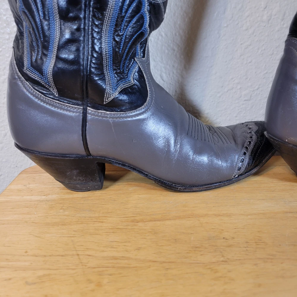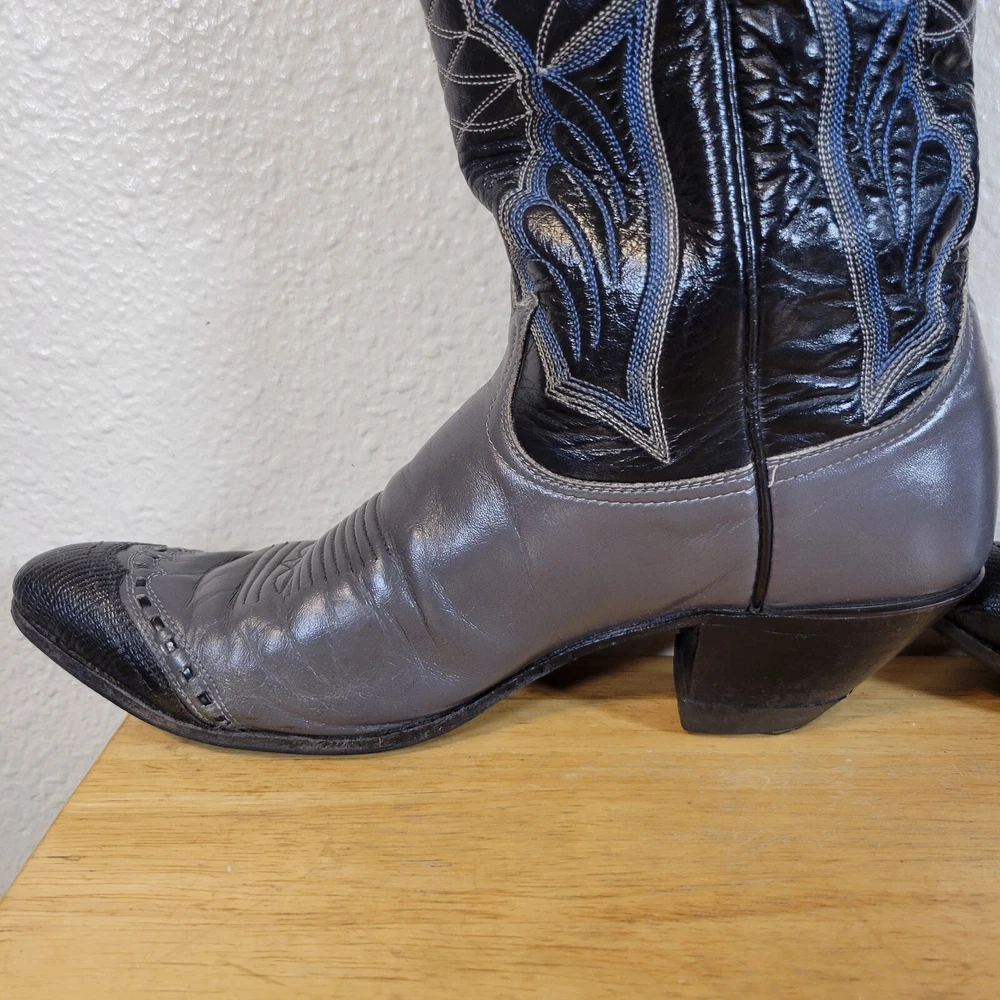 These Tony Lama women's cowboy boots are a must-have for any cowgirl! The black and gray boots feature a wingtip design and are made of high-quality leather. The boots are a size 7B and have a classic Western style, perfect for any wardrobe. The boots are a vintage model, made in the United States, and have a unique lizard tip for added flair. They are perfect for any occasion, whether you're heading to a dance or just running errands. These boots are a great addition to any collection and are sure to make a statement. In great pre-owned condition showing a little wear. Please examine pictures thoroughly for wear and condition