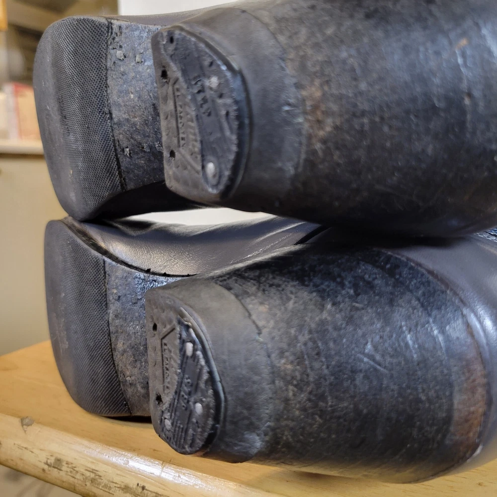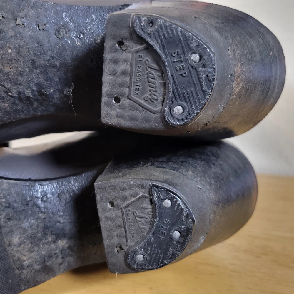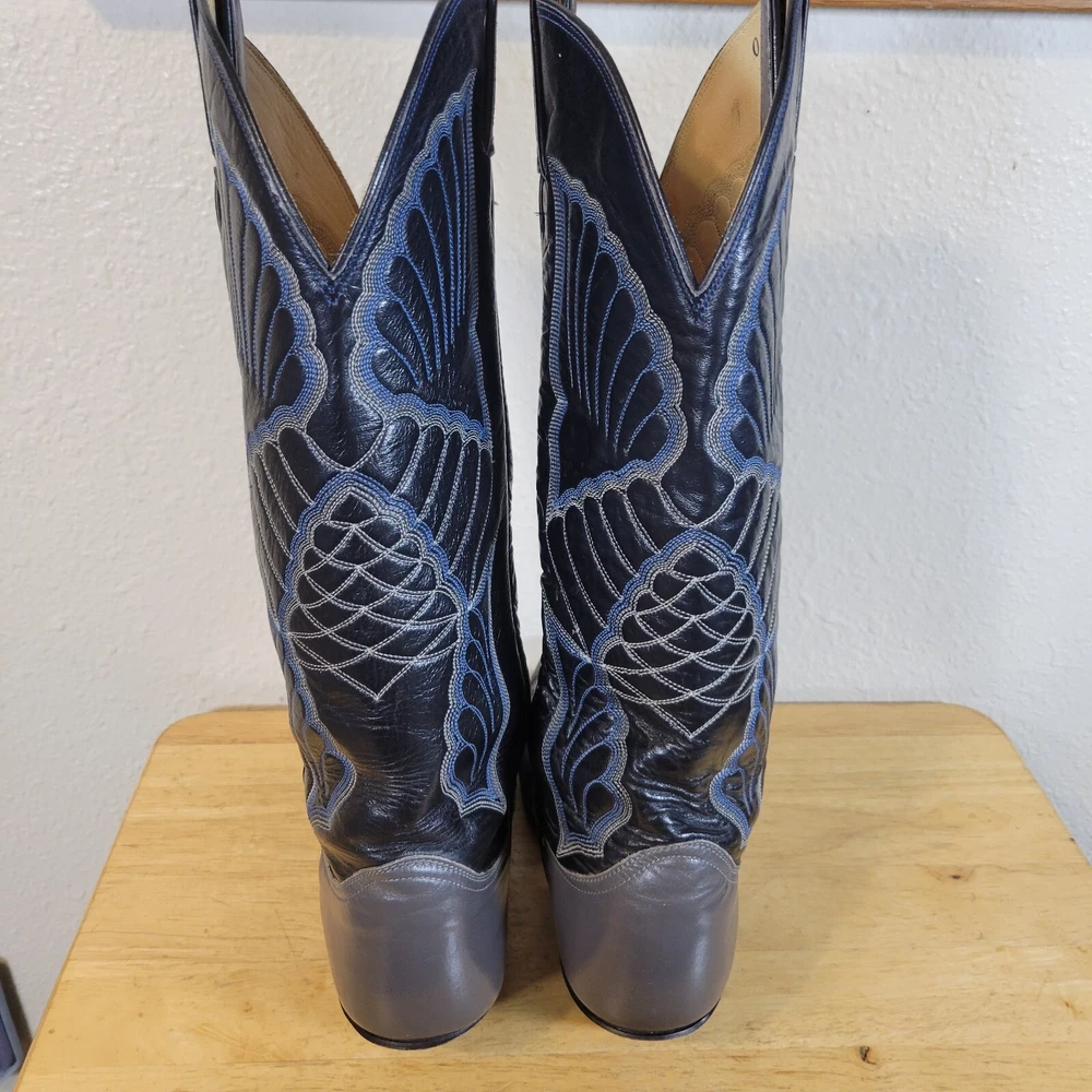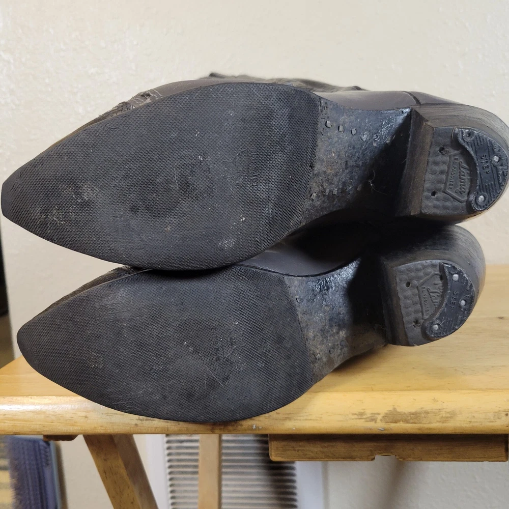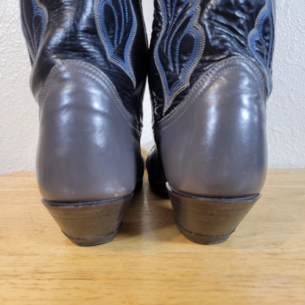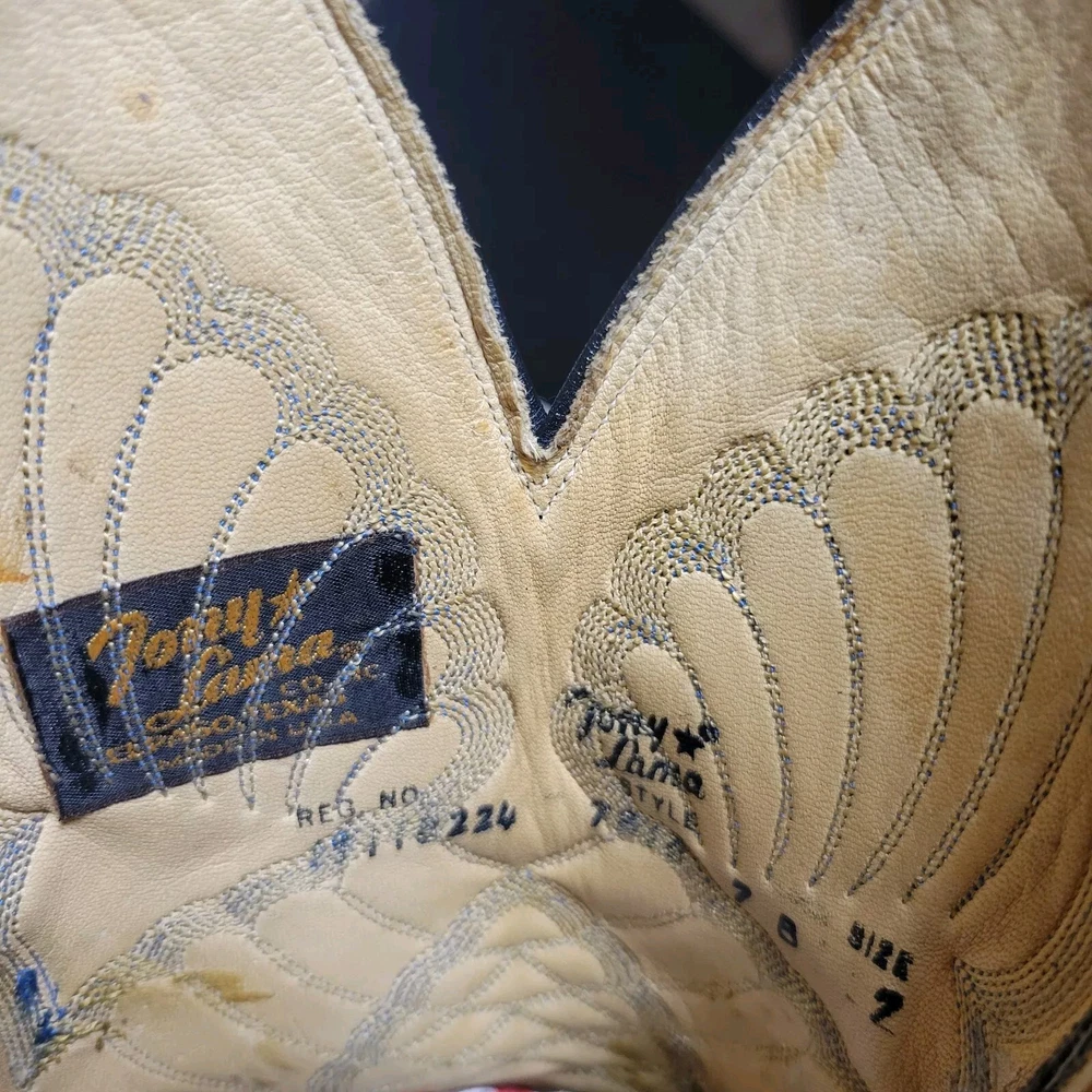 These Tony Lama women's cowboy boots are a must-have for any cowgirl! The black and gray boots feature a wingtip design and are made of high-quality leather. The boots are a size 7B and have a classic Western style, perfect for any wardrobe. The boots are a vintage model, made in the United States, and have a unique lizard tip for added flair. They are perfect for any occasion, whether you're heading to a dance or just running errands. These boots are a great addition to any collection and are sure to make a statement. In great pre-owned condition showing a little wear. Please examine pictures thoroughly for wear and condition