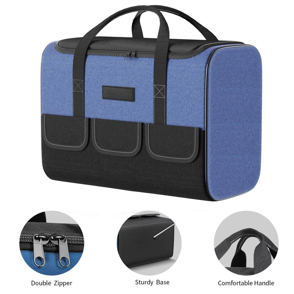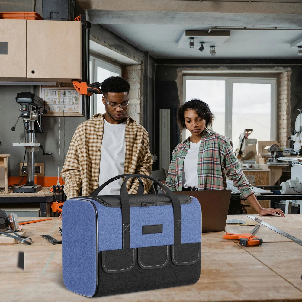 Product Description Bout this item: 👷♂️ Keep Your Tools Organised: with our tool bag designed for DIY enthusiasts and craftsmen. This tool bag is perfect for storing and organising your tools and materials. 👷♂️ High-quality Materials And Structure: Our tool bag is made of 5 layers of 1680D Oxford fabric, providing excellent durability and stability. Waterproof, finely stitched, and able to withstand heavy use. 👷♂️ Large Space and Multiple Pockets: Our tool bag features 1 strong inner pocket and 5 outer pockets, providing ample space to store various tools and materials. It is robust and versatile. 👷♂️ Multifunctiona Tool Bag : Ideal for DIY enthusiasts and craftsmen, but also for electricians or plumbers. It offers a practical solution for storing and organizing tools effectively. Specification: Material:Polyester Color :Blue Size: 16.93x9.25x11.8 inch Water Resistance Level:Water Resistant Number of Compartments:5 Included Components: 1 Tool Bag powered by