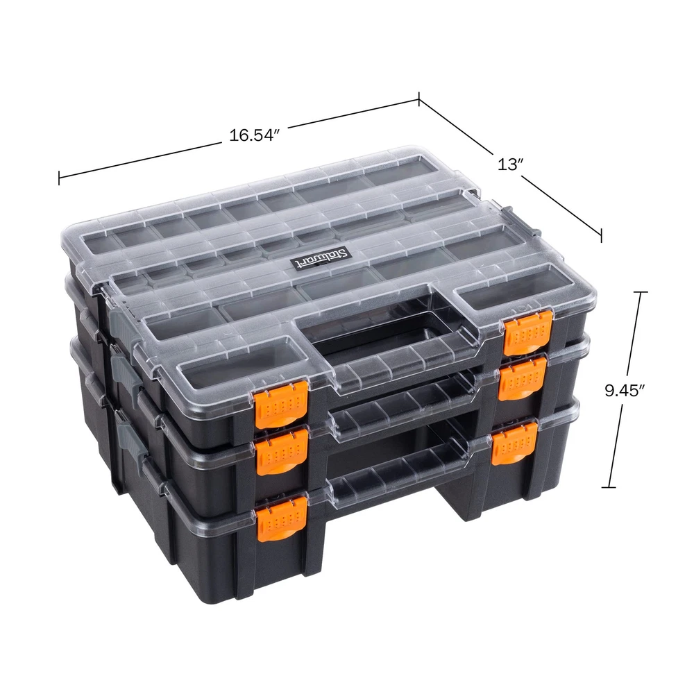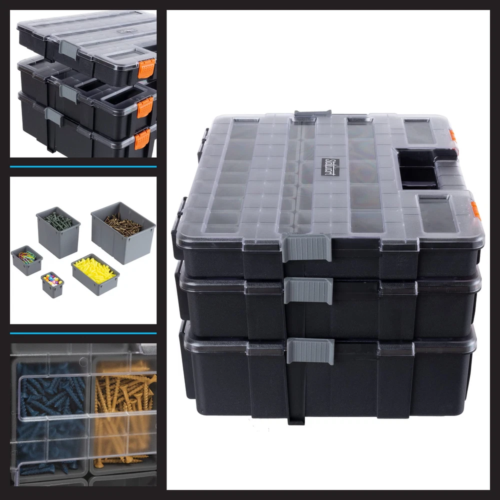 The 3-in-1 Stacking Tool Chest Organizer by is an excellent organizational solution for your garage, home, workshop, or craft room. Constructed from durable plastic, this hardware or bead organizer is made to last. The portable tool box has 52 customizable compartments that provide tool storage for anything from parts, hardware, office supplies, and fishing tackle, to crafting materials, building blocks, beads, makeup, or jewelry. , for tool box organizers and storage solutions that are SMART, STRONG, and SECURE. IMPORTANT: is committed to providing the consumer with the absolute best price and value on all of our products. NOTE: This is an exclusive product of and ONLY Tool Organizers and Storage by are GUARANTEED to be genuine. Avoid buying counterfeit products and transacting with unauthorized sellers. is a registered trademark protected by U.S. Trademark law and will be vigorously defended. 3-TIER COMPARTMENT ORGANIZER - This toolbox organization solution features 52 customizable compartments, providing an easy way to sort and nails, bolts, and other hardware, or use this versatile case for craft supplies or as a tackle box. SMART DESIGN - The screw organizer box features 3 interlocking trays with removable dividers that allow you to customize the compartments. The clear lids allow you to see the contents, perfect for use as craft organizers and storage in your workshop. STRONG CONSTRUCTION - This small parts organizer is built to withstand use during tough do-it-yourself home improvement jobs. The rugged plastic tool box is durable enough to keep your items safe through the wear and tear of travel and regular use. SECURE STORAGE - This portable nail organizer features secure latches that ensure that whatever you inside will stay put. Each interlocking tray has its own carrying handle, making the hardware storage organizer set travel friendly. PRODUCT DETAILS - Material: Polypropylene. Dimensions: (L) 16.54” x (W) 13” x (H) 9.45”. Hardware Organizer Includes 3 Interlocking Trays with a Total of 52 Compartments. Maximum Load Capacity of Tool Organizer: 32.5lbs. Color: Dark Gray and Orange.