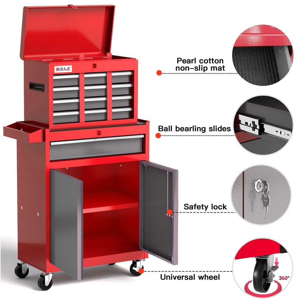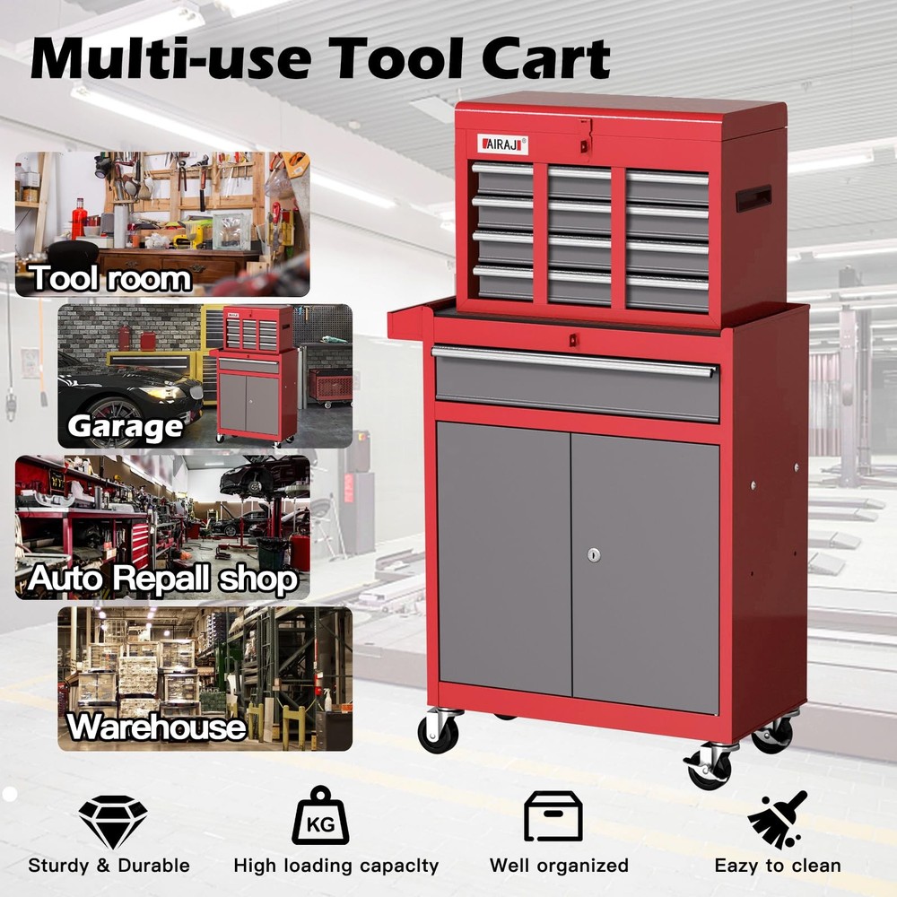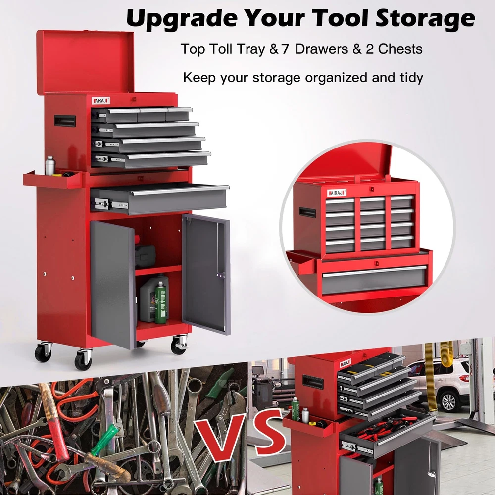 Tool Chest 7-Drawer | 40'' H Rolling Tool Chest with Wheels | Detachable Top Metal Tool Box | Garage Storage Cabinet for Repair Room,Warehouse | Rolling Tool Box with Hooks,Liners,Tray Divider | Red About this item 1、 Tool chest is made of durable cold-rolled steel for high strength, and the surface is powder-coated for wear and rust resistance.It can easily store and transport a variety of supplies and tools. 2、Tool chest with wheels - 4 X 1 inch rubber universal wheels to reduce noise when pushing, and the rear wheels are equipped with brake locking devices to make it more stable and safer when parked. 3、Rolling tool chest - features a double-door design, making it easier to access items, and is equipped with a safety door lock, allowing you to store dangerous items and keep them out of the reach of children. 4、Tool chest with drawers - Equipped with 1 large drawer, 3 medium drawers and 3 small parts drawers, you can store items by size and type, making it easier to store and access tools and keep them neatly organized. 5、Instructions for use - Our packaging method uses corner guards, wooden boards, foam and cartons to effectively prevent transportation damage. And the tool box only needs to install wheels and handrails to use. 6、Attention! If you have any questions, please feel free to contact us and we will provide you with satisfactory answers within 24 hours. Product Description tool chest,rolling tool chest,tool chest with wheels,tool chest on wheels,tool chest with drawers, rolling tool box,tool box with wheels,tool box,toolbox,garage storage On Oct 29, 2025 at 08:46:36 PDT, seller added the following information: