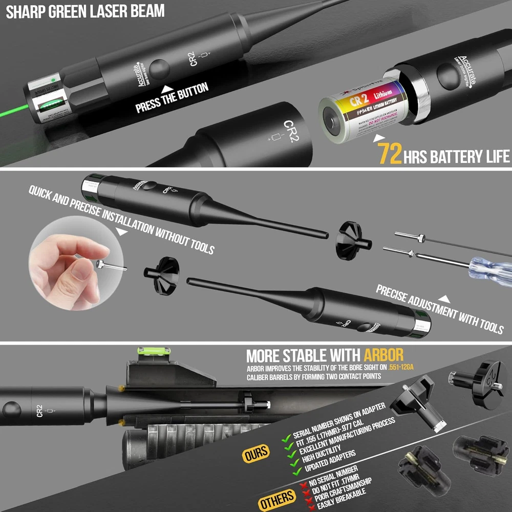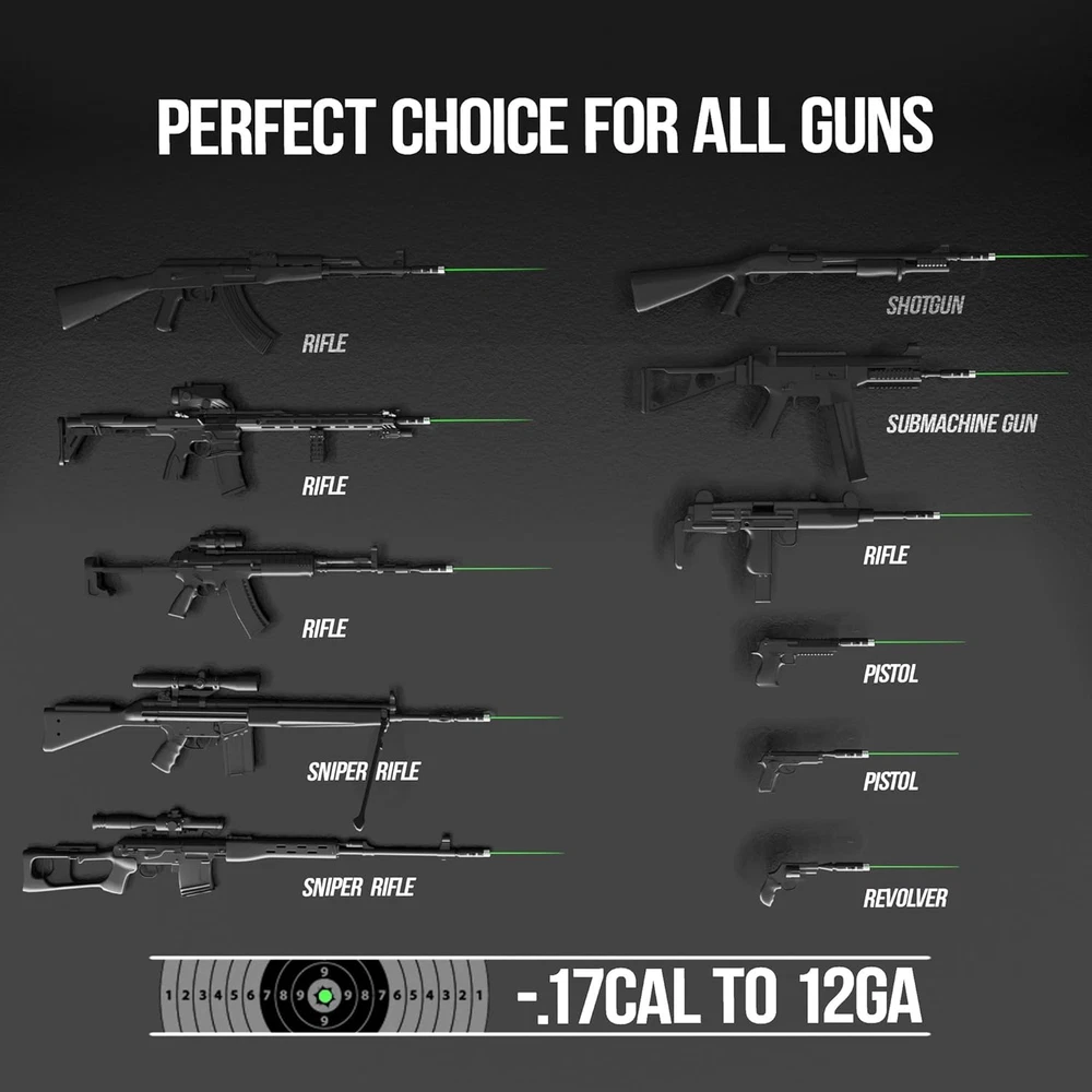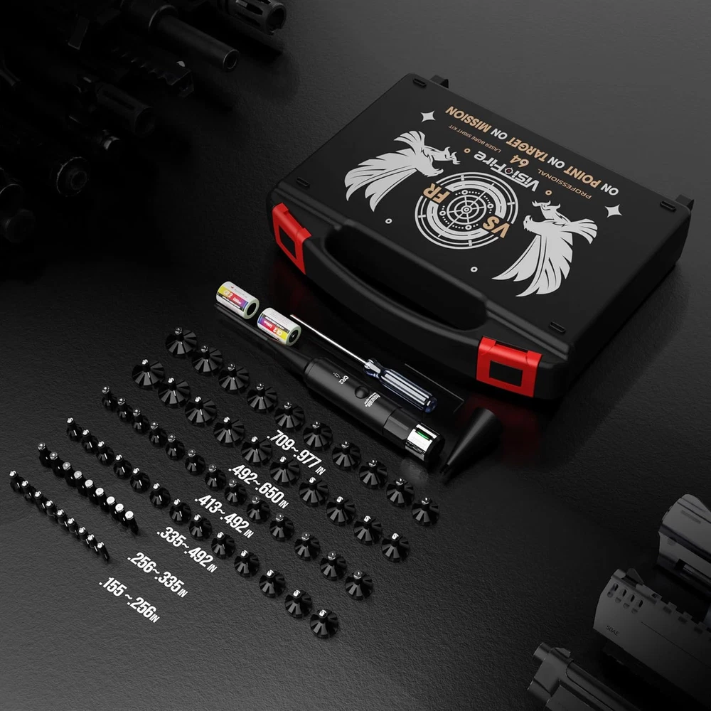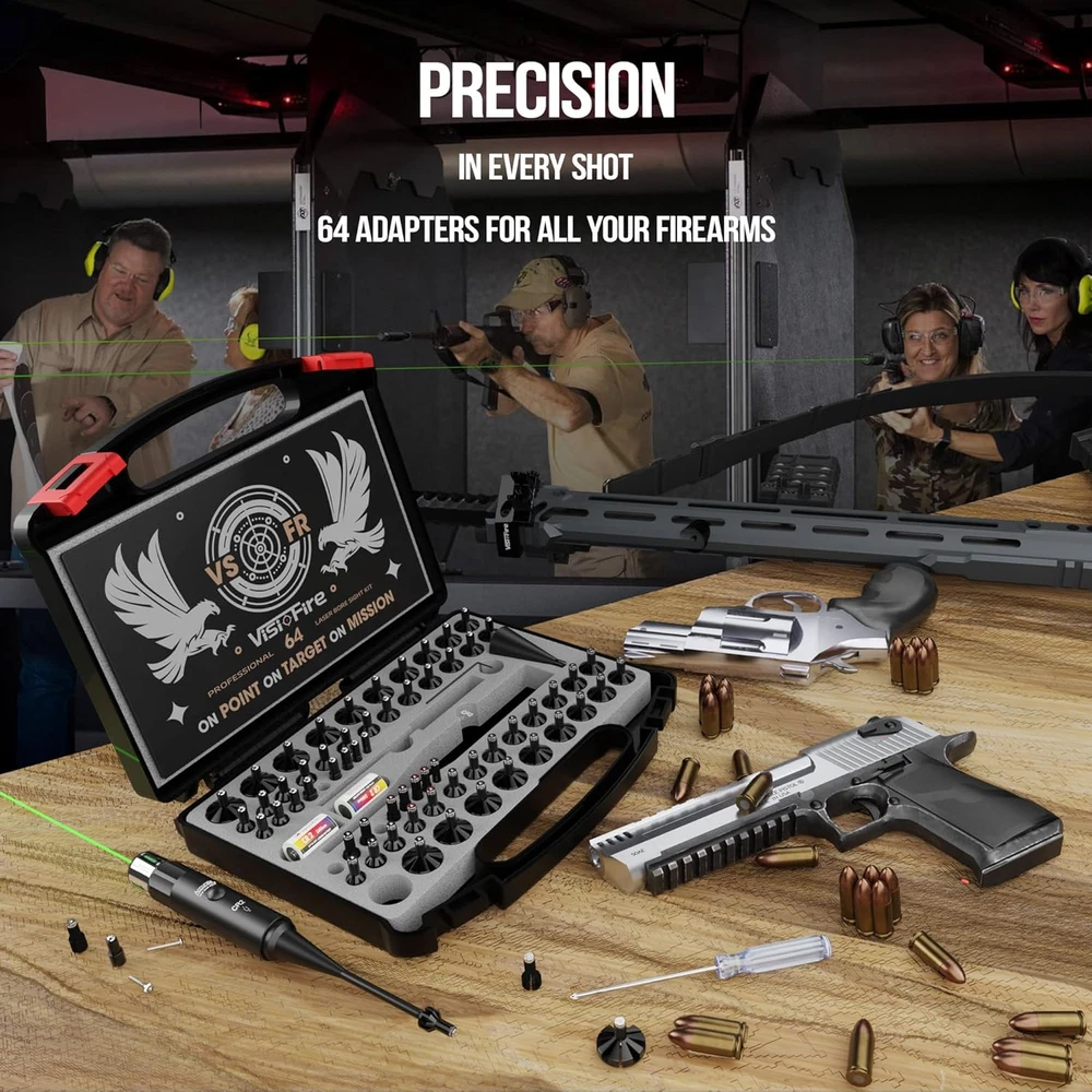 [New Upgraded 64 Adapters] Visiofire Laser bore sighter kit with 64 innovative manual knob adapters, suitable for any calibers from .17 to 12GA. Each adapter is marked with distinct serial numbers and clear insrtuction, make it convenient for you to select the right adapters. With its innovative manual knob screw design, help you to replace adapters fast and accuracy. [Impeccable Accuracy] Our laser bore sighter kit has been rigorously tested with almost every firearm type, ensuring each component meets the highest quality standards. It offers unparalleled accuracy and ligtning-fast calibration speed.With its ergonomic design, it provides ultimate cofort. It will be your most reliable companion. [Updated-Version Enhaced-Power Lazer] High Power 520NM Green Laser Desighed for Long Range Zeroing: Professional ultra-stable green beam, providing visibility with 400 yards, can be calibrated outdoors at long ditances. It can be used for rifle, shotgun, pistol, revolver, sniper rifle, and other old or new fiream type. Improve shooting accuracy, save time and bullets. [72-hour Battery Life] The green bright bore sighter laser kit comes with 2 high capacity batteries, provide professional stable and long-lasting current and power for ultra-straght laser beam. Just select the adapter, easy manual quick installation, insert it into the barrel, press the switch, and you can get a strong vertical beam, accurate zeroing. Use our upgraded and enhanced high-capacity CR2 battery, it can used continuously for 72 hours, suitable for enthusiasts with a firearm warehouse. [Gift for Professional Shooters and Bginners] This green boresighter not only allow elite shooter to easily hit the target, but also allows beginners to master shooting skills faster and quickly become true elite shooters. It's a super assist that surpasses all other current bore sight kit with 12-50 adapters, allowing your elite shooters friends to easily change the rules of the game.This Class IIIA laser, emitting less than 5mW, ensures safety in your shooting activities. The Visiofire laser bore sight kit with 64 upgraded adapters will fit all calibers from .17 to 12ga. This professional laser bore sighting can extremly improve the speed and accuracy to sight the bore for shooters, hunters, policemen. Greatly save preparation time.