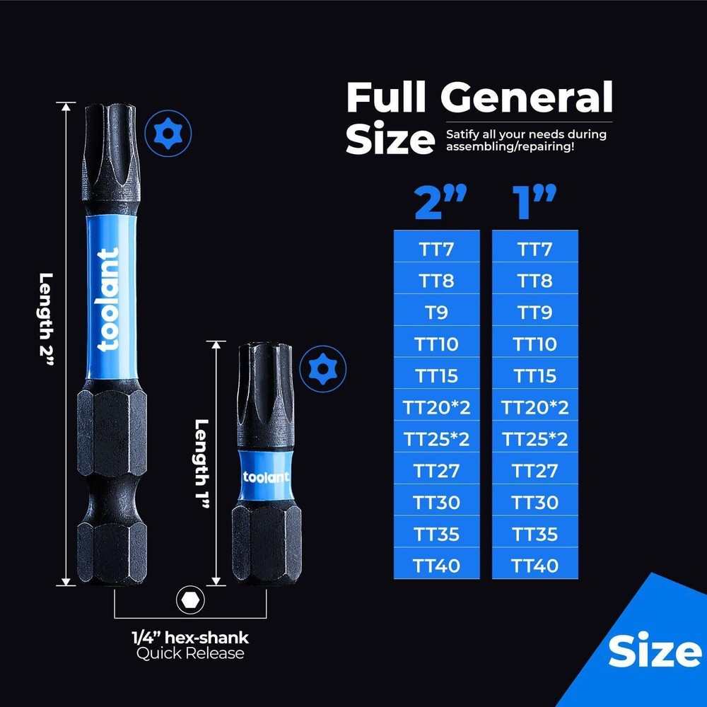 toolant Impact Torx Bit Set 27pcs (TT7-TT40), S2 Steel Security Torx Bit Set, Item Description 🧿Brand No Brand 🧿UPC Does not apply toolant impact security torx bit set 26+1pcs. Torsion zone to absorb torque peaks to avoid breakage. 10 times life expectancy versus standard bits. For impact driver, drill and screwdriver. 2” tamper proof torx bits 13pcs (tt7, tt8, tt9, tt10, tt15, tt20*2, tt25*2, tt27, tt30, tt35, tt40), 1” tamper proof torx bits 13pcs (tt7, tt8, tt9, tt10, tt15, tt20*2, tt25*2, tt27, tt30, tt35, tt40), 3” magnetic impact bit holder for tight space screw driving. CNC machined tips, S2 alloy steel body, hardened core to increase bit strength and reduce fracture. Manganese Phosphate surface to prevent rust. Strengthened magnetic impact torx bits helps you easy pick up screws. The magnetism doesn’t decay after multiple uses. (The 1” bits are not magnetic by themselves but only when connected with the magnetic bit bolder) Widely used in home repairs, automobiles, woodworking and other screw driving applications. All day after-sale service. Thanks for choosing toolant. We accept payment only through PAYPAL ReturnWe accept productwithin 7 to 21 days from delivery date but product should be in original position andnot in damaged condition, theshipping charges will be buyer responsibility We accept productwithin 7 to 21 days from delivery date but product should be in original position andnot in damaged condition, theshipping charges will be buyer responsibility Payment We accept payment only through PAYPAL Shipping We ship products worldwide through standard express courier service, it will reach within 7 to 10 days to abroad buyers, we ship the product after recieved clear payment and give full information about shipment to the buyer Return We accept product return within 7 to 21 days from delivery date but product should be in original position and not in damaged condition,the return shipping charges will be buyer responsibility