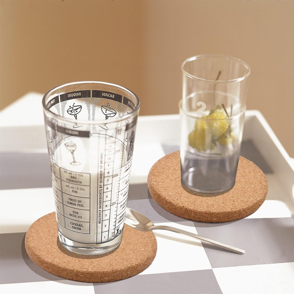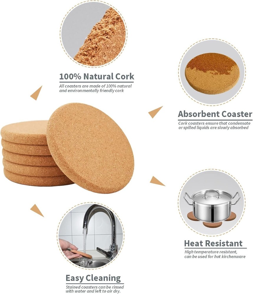 APPROPRIATE SIZE - All 6 cork coasters are 4 inches in diameter to fit most cups. The excellent thickness of 0.4 inches ensures that these absorbent coasters are sturdy and durable enough. These drink coasters provide years of protection for your furniture and tabletops to resist spills, heat, and condensation. PREMIUM MATERIAL - These cup coasters are made of 100% natural and environmentally friendly cork. Cork coasters are easy to clean, do not require special handling, and are ready for subsequent use with a simple rinse and air drying. In addition, the cork material prevents the coasters from sticking to the bottom of the cups when you lift them. MULTIPURPOSE USE - These wooden coasters' round shape and cork colors match most homes' interior style and the furniture's colors. These cork coasters can serve as holders for coffee cups in the office, as foils for glasses or drinks in the restaurant, embellishments for mugs or beer bottles in the home, and even as a cork trivet for the bottom of a hot pot in the kitchen. DRINK COMPANION - ToolMenu cork coasters feature a minimalist blank design, with a non-slip back for stable placement and lightweight for easy portability. It is a very practical drink companion with more thickness than most other coasters to protect your tabletops and furniture from stains, scratches, and noise more effectively and longer. PRACTICAL PRESENT - Our versatile coaster set is the perfect gift for friends and family. This practical gift is ideal for festivals, birthdays, weddings, and housewarmings. Our goal is to make these bulk coasters serve you as well as possible. Strive to ensure that you can fully enjoy your drinks, reduce unnecessary annoyance, and add convenience and fun.