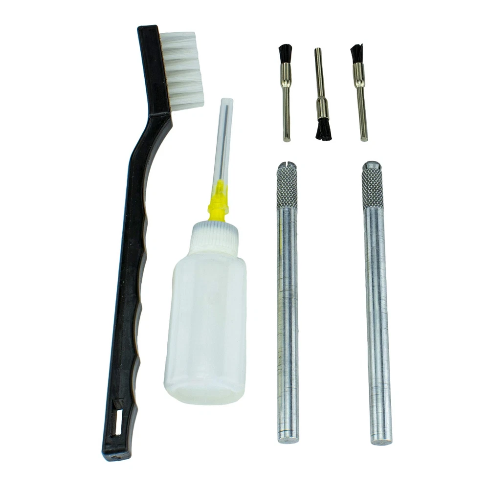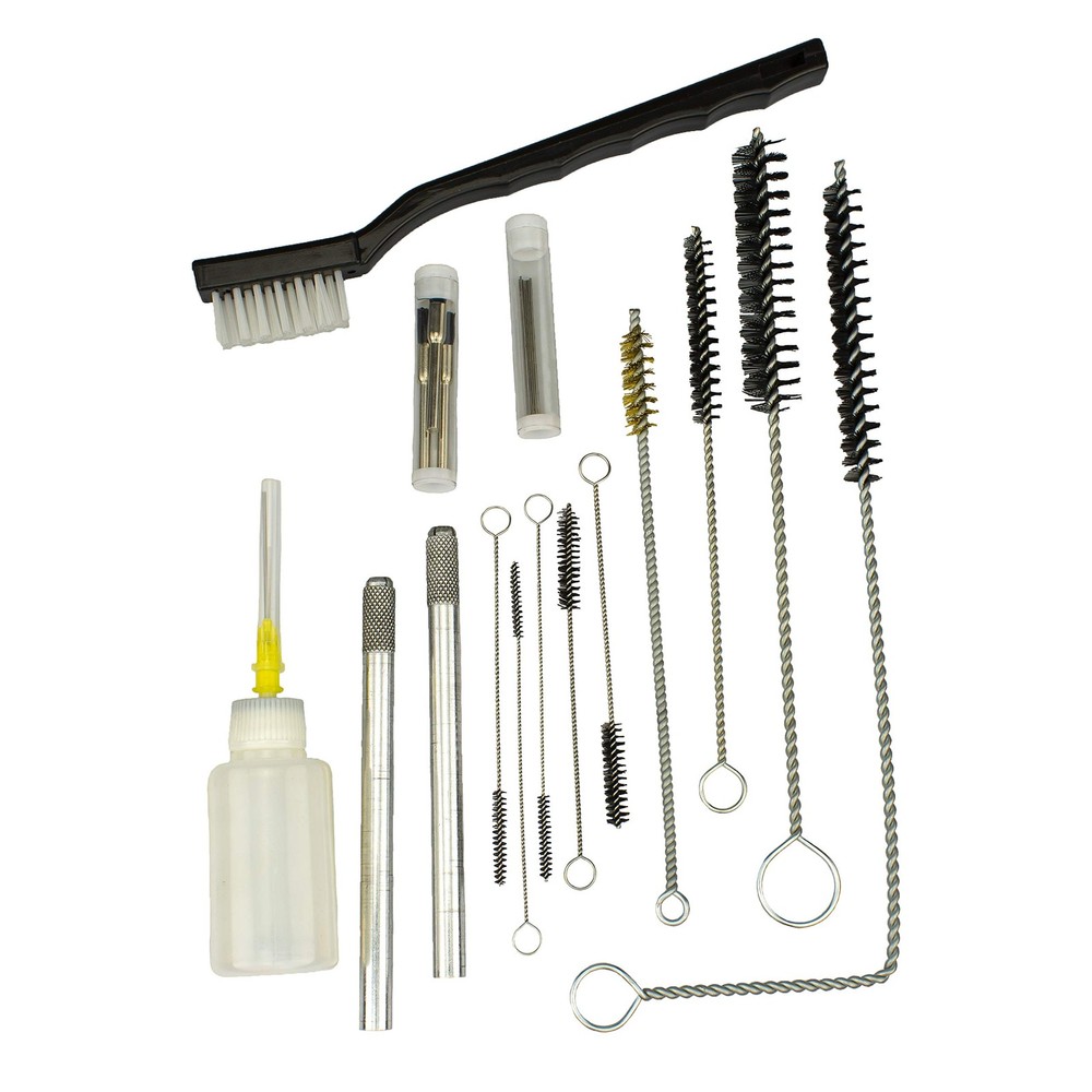 [COMPLETE]: Full set with 22 pieces for cleaning and maintenance of any spray paint to ensure excellent working condition. [EASY ACCESS]: Strong, flexible wire brushes allow for easy access to clean hard to reach cavities. [PROTECTION]: Multi-brush tools clean away any residue for better finishing results and extends life. [CONVENIENCE]: Maintenance supply equipment is placed in a compact compartmentalized tray for easy storage and visibility. [INCLUDES]: 4 pc. wire brush, 5 pc. flexible brush, 3 pc. mini brush, 1 pc. handle toothbrush, 6 pc. micro needles, 2 pc. aluminum holders, 1 pc. lubrication bottle, 1 pc. storage case.
