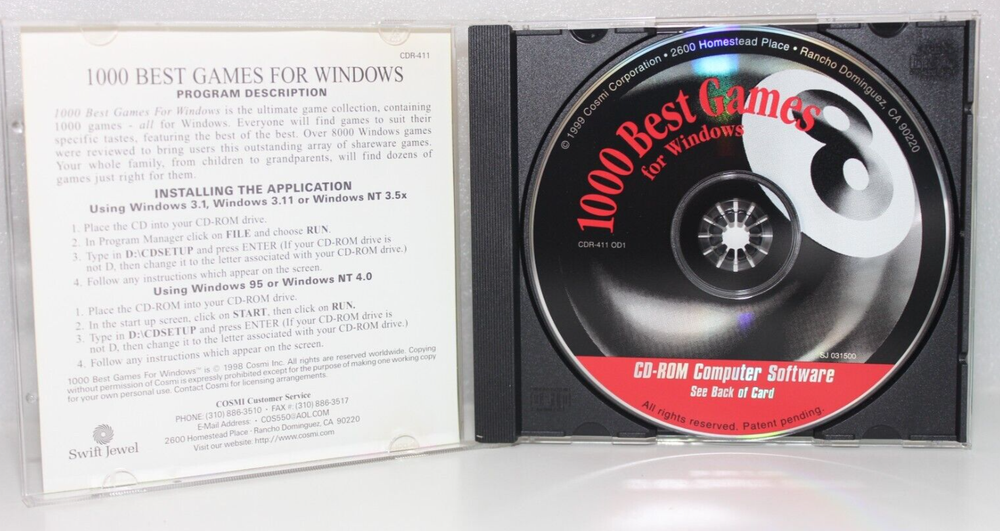 Check out my eBay store for more great items! 1000 BEST GAMES FOR WINDOWS PC CD ROM GAME CASE HAS SOME WEAR. DISC HAS SOME MINOR SCRATCHES. PLEASE CHECK OUT THE PHOTOS! Check out my eBay store for more great items! SHIPPING US: ALL ITEMS SHIPPED WITH DELIVERY CONFIRMATION. I TRY MY BEST TO ONLY CHARGE ACTUAL SHIPPING COSTS. NO HANDLING FEES. YOUR ITEM USUALLY SHIPS OUT WITHIN 24 HOURS OF PAYMENT. SHIPPING INTERNATIONAL: BUYER IS RESPONSIBLE FOR ANY POSSIBLE FEES, TAXES OR DUTIES ASSOCIATED WITH IMPORT OF THE ITEM. I WILL NOT MARK THE ITEM AS A GIFT OR LOWER THE VALUE OF THE ITEM SO PLEASE DO NOT ASK. IT IS BUYERS RESPONSIBILITY TO MAKE SURE THE ITEM BEING PURCHASED IS ABLE TO BE IMPORTED. RETURN POLICY: I WILL GLADLY ACCEPT A RETURN OF ANY ITEM I SELL. BUYER IS TO CONTACT ME WITHIN 14 DAYS TO ARRANGE RETURN. ITEM MUST BE SENT BACK IN THE SAME CONDITION AS IT WAS SENT TO YOU INCLUDING ALL PARTS. OTHER: FEEDBACK IS LEFT AUTOMATICALLY AFTER IT HAS BEEN LEFT FOR ME. PAYMENT IS TO BE MADE WITHIN 4 DAYS OR THE ORDER WILL BE CANCELLED AND RELISTED. A PACKING LIST OR INVOICE WILL NOT BE AUTOMATICALLY ADDED TO YOUR SHIPMENT TO SAVE ON PAPER WASTE. IF ONE IS REQUIRED PLEASE LEAVE A NOTE WITH PAYMENT REQUESTING ONE. Check out my eBay store for more great items!