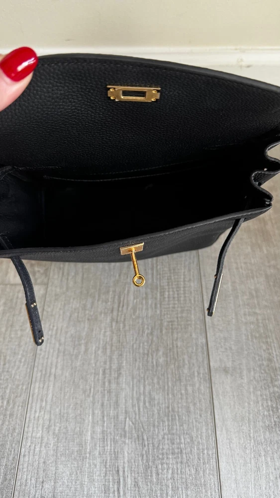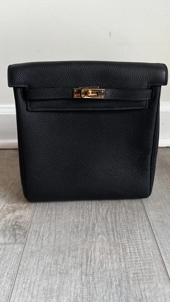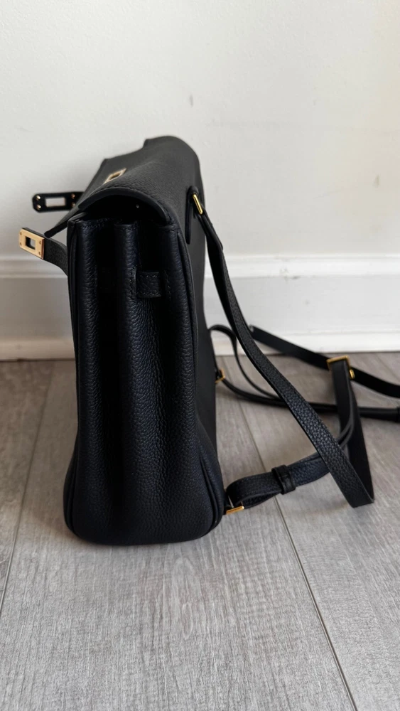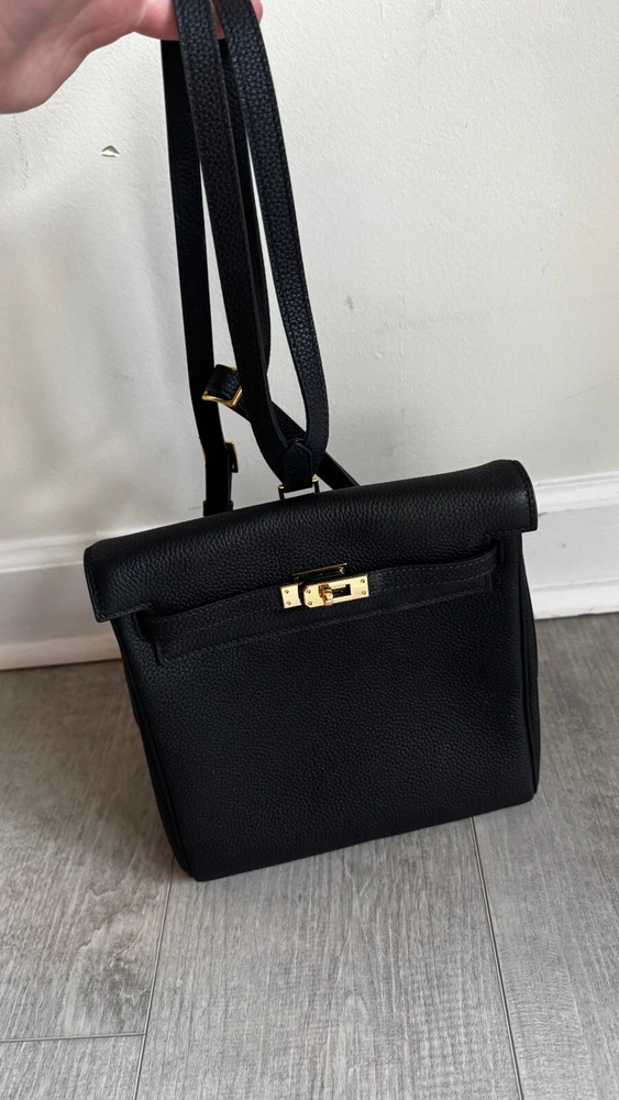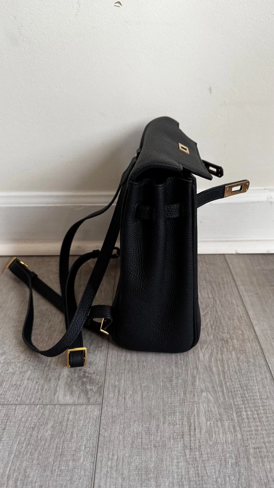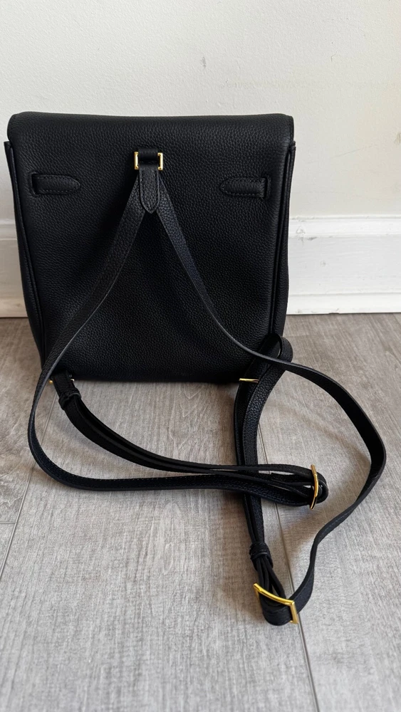 Small Top Grain Leather Backpack with Strap and Twist Lock Upgrade your daily style with this must-have small backpack.Made from premium pebbled top grain leather, this backpack offers a chic,timeless look that’s also practical and built to last. With adjustable strapsand a roomy main compartment, this backpack combines sophistication witheveryday functionality, making it perfect for work, travel, or casual outings. Product Highlights: - High-Quality Leather: Crafted from durable pebbled topgrain leather for a soft, textured feel that ages beautifully over time. - Comfortable Fit: Adjustable straps allow for a customized,comfortable fit. - Functional Design: Spacious main compartment with anadditional slide pocket for essentials. - Classic Hardware Options: Available in elegant gold-tone hardware Specifications: - Size: Width 22 cm x Depth 11 cm x Height 22 cm - Interior: Microfiber leather lining with one maincompartment and one slide pocket Pre-Owned Like New Condition Please look at all the pictures, this is the exact productyou will receive.