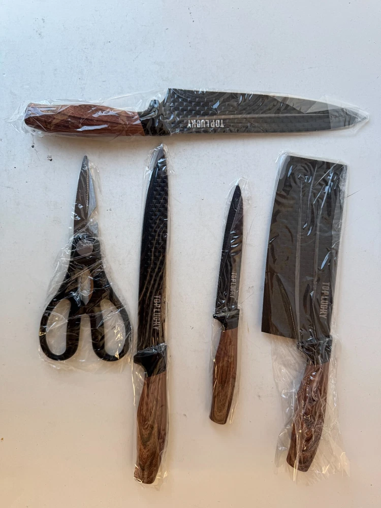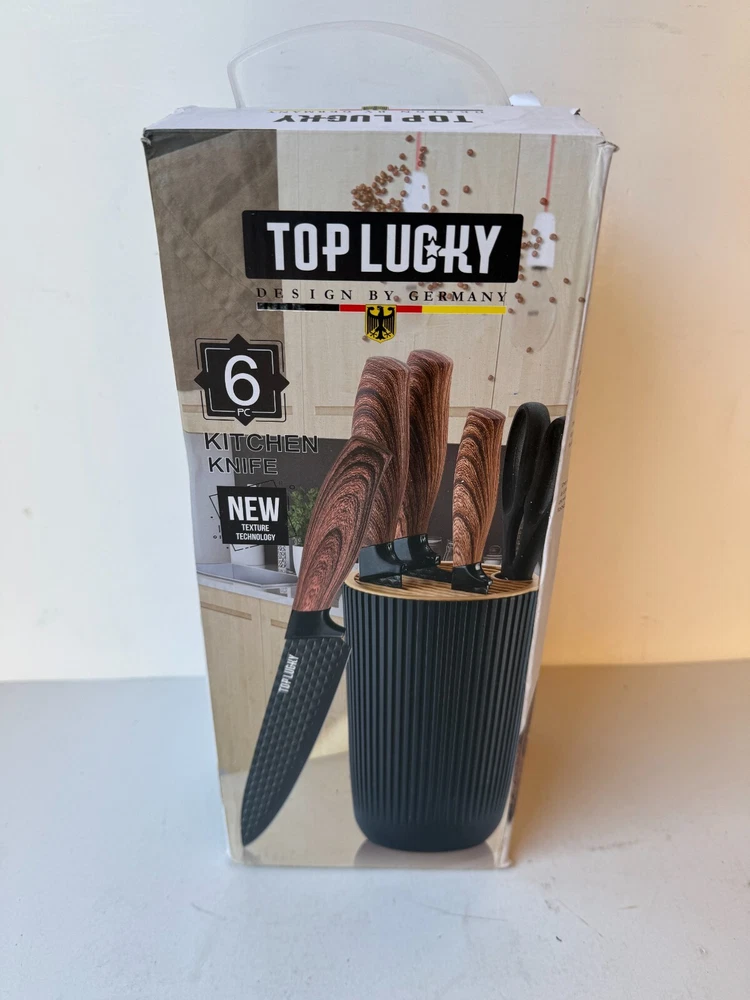Top Lucky 6-Pcs Kitchen Knife Set Stainless Steel Blade Rust Resistant Non-Stick Description Top Lucky 6-Pcs Kitchen Knife Set Stainless Steel Blade Rust Resistant Non-Stick Product Detail • Brand : Top Lucky • Blade Material : Stainless Steel • Blade Color : Black • Type: Knife Set Please message me if you have any questions.