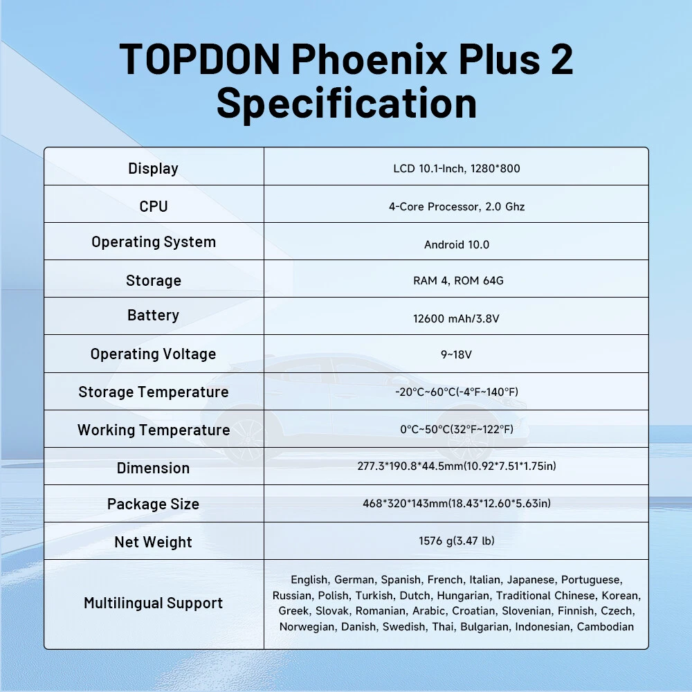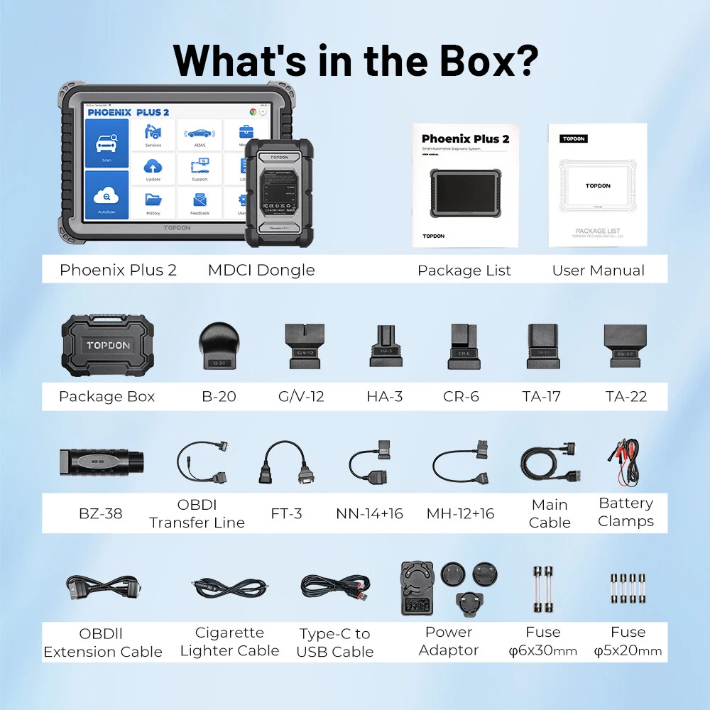 Topdon Phoenix Plus 2 OBD2 Scanner Bidirectional Diagnostic Tool Kəy C0DING 2024 Elite Version TOPDON Phoenix Plus 2,Actuation Test+E*CU coding,your best choice!!! Reasons Why You Should Get A TOPDON Phoenix Plus 2 As Your Diagnostic Tool: ✔ Topology Mapping displays a system distribution diagram of the vehicle control modules ✔ Advanced E*CU coding ✔ Active Tests/Bi-Directional Control ✔ Full System Diagnostic ✔ 41+ Hot Reset Services ✔ Diagnostic Report Generate and Share ✔ 93+ Brands and 10,000+ Models ✔ Auto VIN & DTCs Lookup ✔ Data Stream Recording & Screen Recording Function ✔ Multi-PID Live Data Graphing in 1 Screen: One screen can display 12 data stream (Graphic and textual) ✔ 2 Years Free Update ✔ Unique Modular Design, supporting up to 8 functional modules for any application scenarios ✔ Supporting ADAS Calibration ✔ Remote Technical Support via TeamViewer ✔ With HD Package , TOPDON Phoenix Plus 2 Supports 12V cars and 24V trucks , but pls note HD package need pay additional ✔ Online E*CU Coding: restore the vehicle functional status after E*CU replacement (for BMW E/F/G Chassis, Porsche, ✔ AutoAuth Access: bypass SGM in FCA vehicles (2017 and later Chrysler, Dodge, Jeep, Alfa Romeo, Fiat, etc.) for successful OBDII diagnostics, active test, calibrations, and more. ✔ VAG Guided Function: skip the step of entering the Security Access Code & Channel Number of VW/Audi/Skoda/Seat vehicles for successful diagnostics. TOPDON Phoenix Plus 2 Service for: Technician , advance DIY, garage, car dealer, used car dealer, auto repair shop, automotive engineer, diagnostic tech, truck man, automobile tech, home mechanic, DIY beginner, automotive student, backyard mechanic, retired mechanic, weekend DIY, individual. > 2024 New Elite Version What Updates have we made in 2024 as Elite UPGRADED Version of TOPDON Phoenix Plus 2 : ✔ 4GB RAM / 64GB ROM ✔ Andriod 10.0 Operating System: make you smooth operation, Anti-Slip & Anti-Grease protective sleeve design ✔ 10-inch HD IPS Touch Screen: A brighter, Clearer, Larger Screen let you "Deep Dive into Diagnostics" ✔ OE-Level Wireless Intelligent Diagnostics, covering more than 100 car makes ✔ Tablet with 8.0 MP Pixel Rear Camera ✔ Brilliant Battery Life: 6000mAh rechargeable battery 7.6V WHAT IS THE NEWEST OE-LEVEL FUNCTIONS OF TOPDON Phoenix Plus 2? Component Matching: Compatible with Volkswagen / SKODA / Seat / BMW / GM / Ford / Opel / Mazda / Fiat / Honda / Nissan / Hyundai / KIA/ Subaru etc. Online Coding: Compatible with Volkswagen / Audi / Benz / BMW / Seat / Porsche etc. Online Account Login Service: Compatible with Volkswagen / Audi / SKODA / Seat etc. Online Calibration: Compatible with Volkswagen / Audi / SKODA / Seat etc. Online Parameterization: Compatible with Volkswagen / Audi / SKODA / Seat etc. Anti-theft IMMO Service: Compatible with Volkswagen / Audi / SKODA / Seat etc. Guided Functions: Compatible with Volkswagen / Audi / SKODA / Seat etc. Power Balance: Compatible with Chrysler / GM / Ford etc. Coding Module Installation: Compatible with Ford / Mazda etc. Flash Hidden Functions: Compatible with BMW / Porsche / Toyota / Subaru etc. SCN Coding for Benz 2024 TOPDON Phoenix Plus 2 Professional Diagnostic Tool CAR REPAIR SHOPS & MECHANICS 's First Choice !!! The Advanced Functions of TOPDON Phoenix Plus 2 Supports : 1. Actuation Test(Bi-directional Control): TOPDON Phoenix Plus 2 car scanner diagnostic tool Features Full bi-directional control ability, to send commands to vehicle’s systems/components, to verify system input/output without using the vehicle's controls, e.g. turn on the radiator fan, modulate the throttle, open/close windows, operate mirrors, Injector Buz Test,turn on interior & exterior lights, sound horn, test door lock actuators and such. 2.E*CU coding: E*CU coding function is used to re-flash the vehicle control modules, it allows you to reprogram adaptive data for certain components after making repairs or replacements, providing ways for the issues of Drivability, Fuel Efficiency, Power Loss, Fault Codes, Durability of Mechanical Parts 3.ADAS calibration (Note:This function needs to be used with ADAS shelf, otherwise it cannot be used) Advanced Driver Assistance System (ADAS) is an electronic component in a vehicle, including various safety functions of the vehicle, such as automatic emergency braking (AEB), lane departure warning (LDW),lane keeping assist, blind spot elimination, night vision camera and Adaptive lighting. The function on the equipment is disabled by default, and the user needs to activate the function with an activation card before using it. And this function needs to be matched with TOPDON ADAS calibration tools. Mainly used to calibrate various camera and radar of driver assistance systems 4.TPMS Diagnostic function (If you want to do this function, you need to purchase an additional TPMS tool for use, please contact me.) TOPDON Phoenix Plus 2+/Pros can work with wireless tire pressure diagnostic tool (optional accessory) to achieve the features of TPMS activation, programming and learning. a)Activation: to activate the sensor's IlD, wheel pressure, sensor frequency, tire temperature and battery status. b)Programming: to program sensor data to a blank TOPDON sensor, so as to replace a sensor that is in low battery and does not function properly. There are three sensor programming methods available:automatic, manual, and via activation replication. c) Learning: to write the sensor ID into the vehicle ECU for sensor identification. 5.41+ Special functions : TOPDON Phoenix Plus 2 has 41+ service functions which allows you to reset various systems in your vehicle. support more function than other scanners priced similarly 41+ upgraded functions include: Oil Reset, AFS (headlamp) Reset, Brake-pad Reset, Windows Calibration, Steering Angle Reset, Seat Calibration, Battery Matching, Tyre Reset, ABS Bleeding, Language Reset, Elec. Throttle Adaption, A/F Res