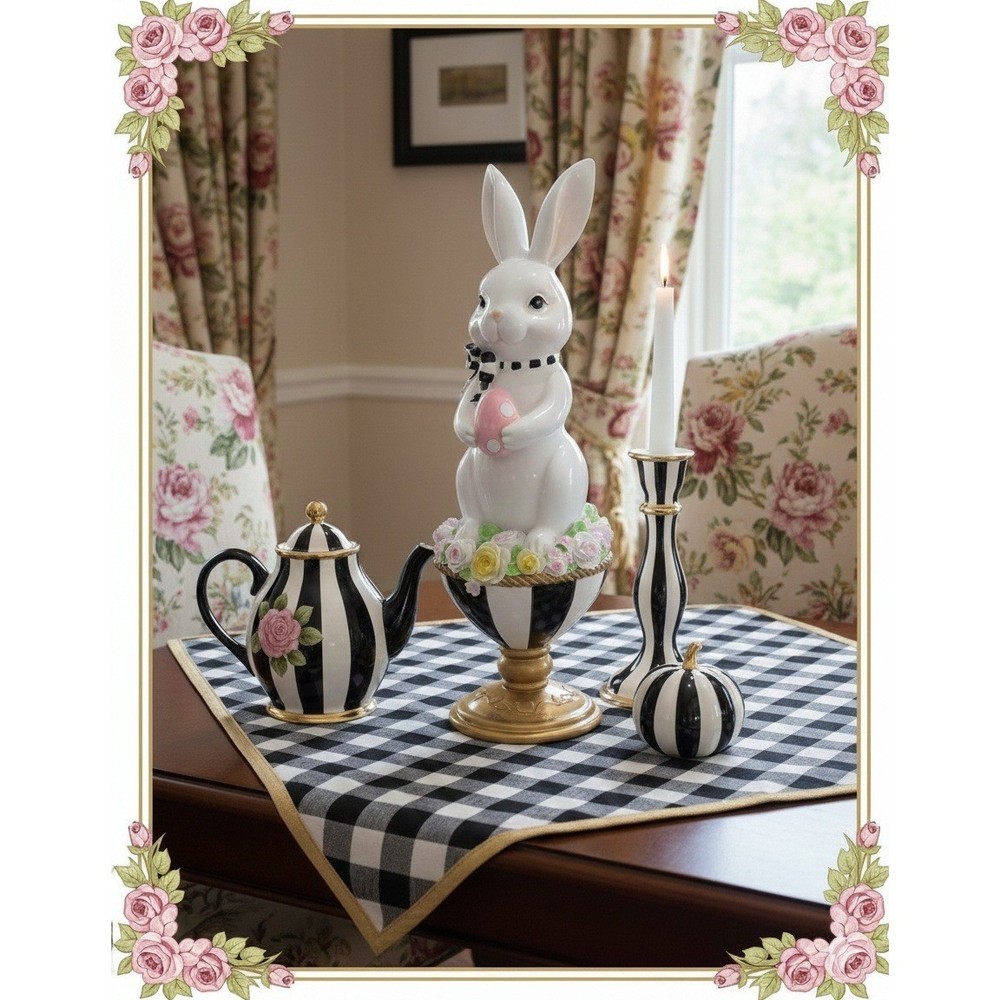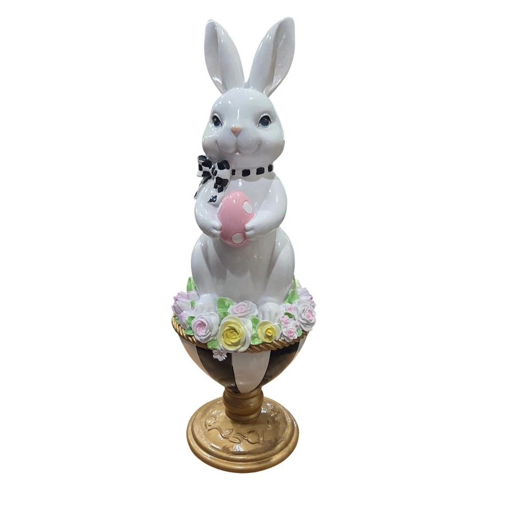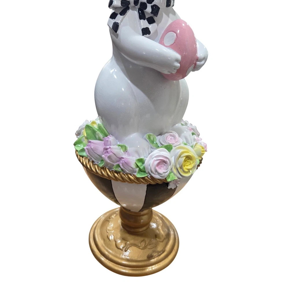 Easter bunny figurine stands elegantly on a black and white striped pedestal base, accented with a gold-tone finish. This charming white rabbit wears a whimsical black and white polka dot bow and holds a delicate pink speckled egg. A lush ring of pastel roses in shades of pink, yellow, and lavender circles the base of the bunny, adding a touch of spring garden beauty. Perfect for a mantel display, tabletop centerpiece, or as a festive addition to any holiday decor collection. Keywords: Easter Decor, Spring Figurine, White Rabbit, Mackenzie Childs Style, Harlequin, Polka Dot Bow, Floral Base, Pastel Roses, Holiday Centerpiece, Whimsical Decor, Seasonal Accents, Collectible Bunny, Tabletop Decoration, Grandmillennial Aesthetic