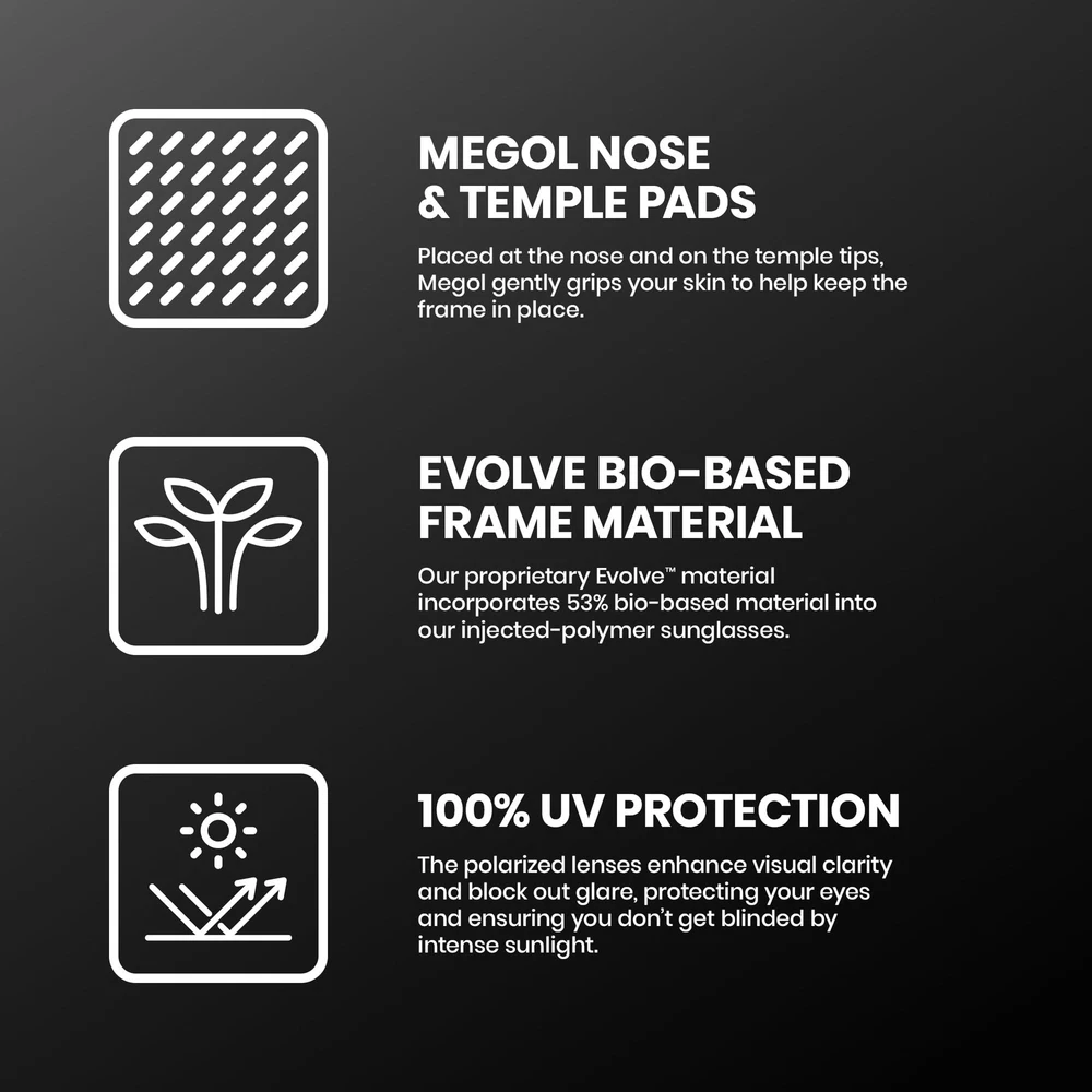 The Topline Is Here for It All: From the mountains to the beach to new spots in the city, these sunglasses stay put when you're on the move thanks to pads on the nose and temples; polarized lenses bump up contrast and block out glare, so you catch every last detail of the view Lightweight & Comfy: The megol nose and temple pads, along with the Evolve frame material, make these medium-fit sunglasses durable, cozy, light and perfect for wherever the road takes you 8-Base Lens Curvature with 100% UV Protection: Say goodbye to being blinded by intense sunlight; the polarized lens enhance visual clarity, block out glare and protect your eyes Unmatched Quality & Durability: Featuring polycarbonate injection molded lenses and Evolve bio-based frame material, these sunglasses have high-impact resistance and stand up to the test of time; a microfiber cleaning/storage bag is included for protection and convenience For Every Adventure: Different people define adventure differently, and makes sunglasses for all of them: Olympic National Park backpackers, week-long road trippers, and poolside loungers; we’re the dependable, go-to, take-anywhere brand you can all rely on to work well and look good