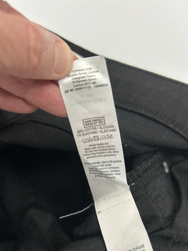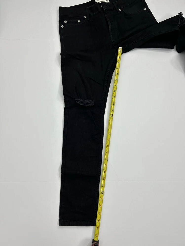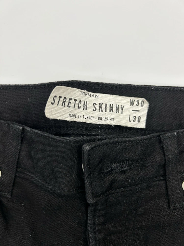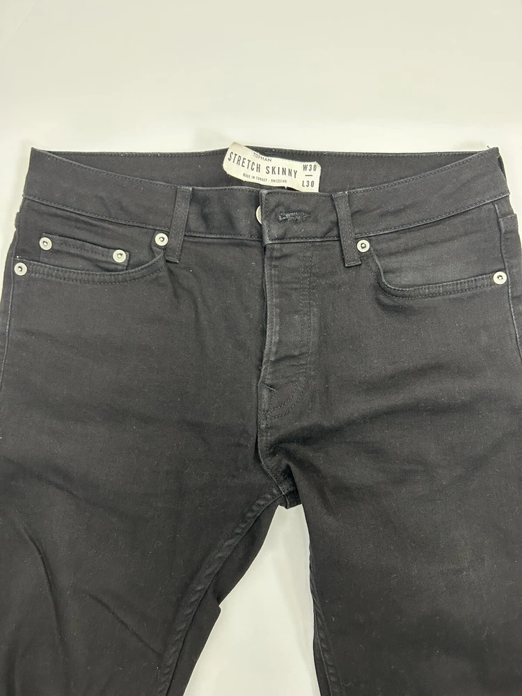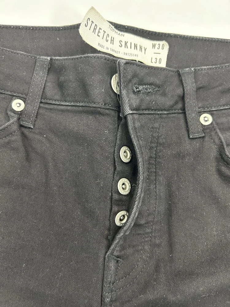 Features:Distressed, StretchMaterial:CottonUPC:Does not applyFabric Type:DenimSize Type:RegularAccents:ButtonStyle:SkinnyDepartment:MenClosure:Buttongtin13:Does not applyFit:SlimSize:30Theme:GrungeColor:BlackType:JeansBrand:TopmanInseam:28 inWaist Size:30 in