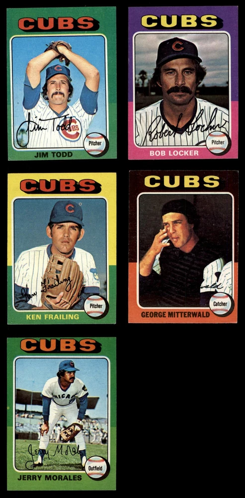 This set contains the following cards 1975 Topps Mini #63 Steve Swisher 5 - EX Front Back 1975 Topps Mini #85 Bill Bonham 6 - EX/MT Front Back 1975 Topps Mini #176 Burt Hooton 5 - EX Front Back 1975 Topps Mini #282 Jerry Morales 4 - VG/EX Front Back 1975 Topps Mini #338 Rich Stelmaszek 4 - VG/EX Front Back 1975 Topps Mini #352 Darold Knowles 6 - EX/MT Front Back 1975 Topps Mini #363 Carmen Fanzone 3 - VG Front Back 1975 Topps Mini #388 Steve Stone 6 - EX/MT Front Back 1975 Topps Mini #411 George Mitterwald 3 - VG Front Back 1975 Topps Mini #434 Bob Locker 4 - VG/EX Front Back 1975 Topps Mini #436 Ken Frailing 4 - VG/EX Front Back 1975 Topps Mini #494 Pete LaCock 4 - VG/EX Front Back 1975 Topps Mini #519 Jim Todd 3 - VG Front Back 1975 Topps Mini #566 Ray Burris 5 - EX Front Back 1975 Topps Mini #587 Chris Ward 6 - EX/MT Front Back 1975 Topps Mini #604 Oscar Zamora 4 - VG/EX Front Back This 1975 Topps MINI Chicago Cubs Near Team Set contains the majority of the 1975 Topps Mini Cubs baseball cards and makes a great gift for any Cubs fan. ?With an inventory of over 20,000 team sets, Dean's Cards has Team Sets & Near Team Sets in multiple conditions. The 1975 Topps Mini Baseball Cards are a miniature replica of the regular 1975 Topps Baseball Set with each card measuring 2 1/4 by 3 1/8. For the exact cards contained in this set, as well as their front and back scans, please see the description below.